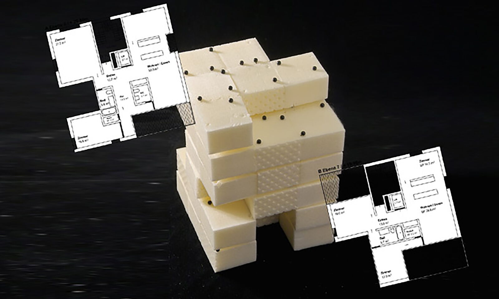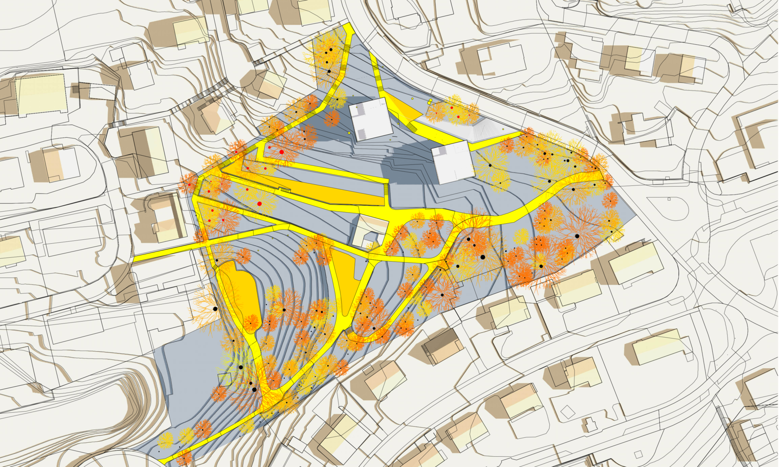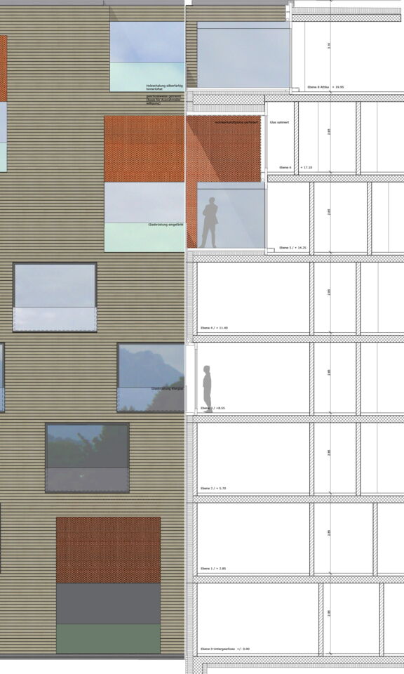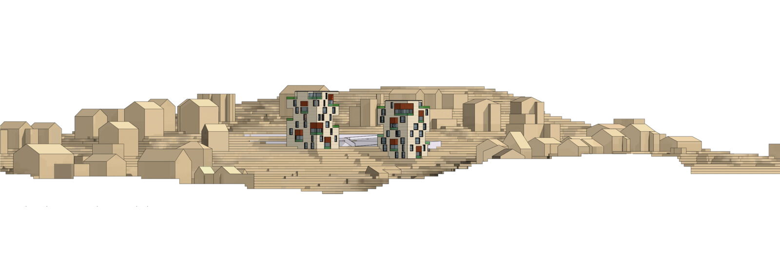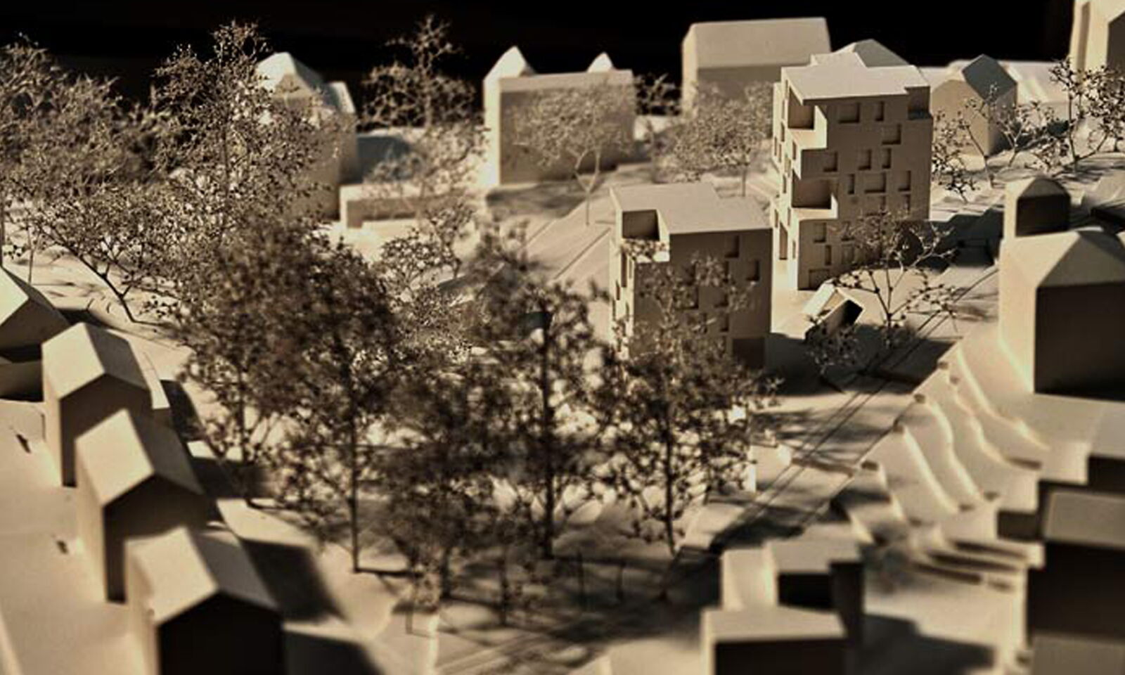 Am oberen Rand des Parks angeordnet, präzisieren die beiden Gebäude die Situation von öffentlichem und privatem Raum, Grün- und Freiraum und Verkehrserschliessung. Einbündig angeordnet nehmen die Wohnungen Bezug auf die villenartige Bebauung im Quartier. Durch den zweigeschossigen Aussenraum erhalten die Wohnungen ein sehr grosszügiges Aussenzimmer.