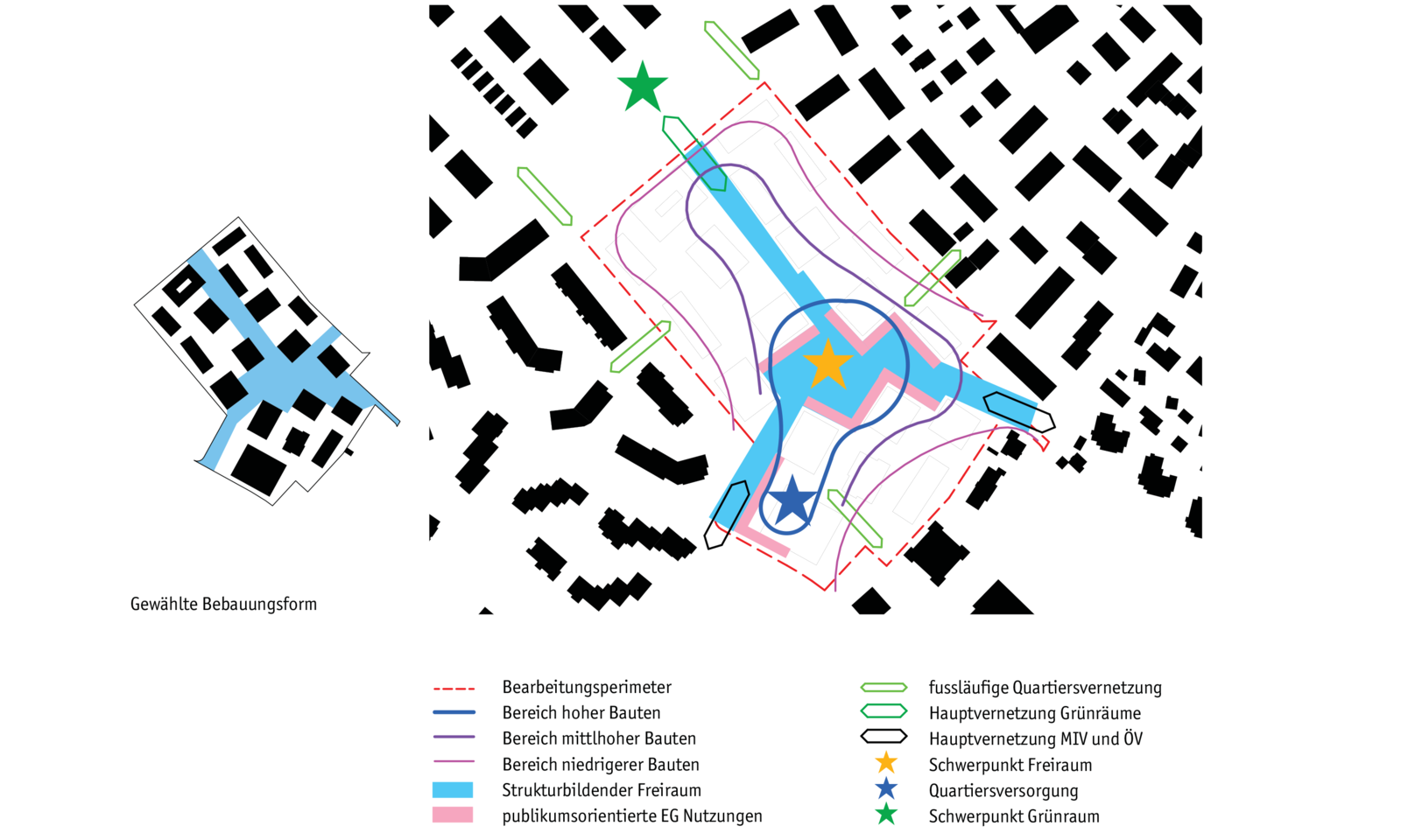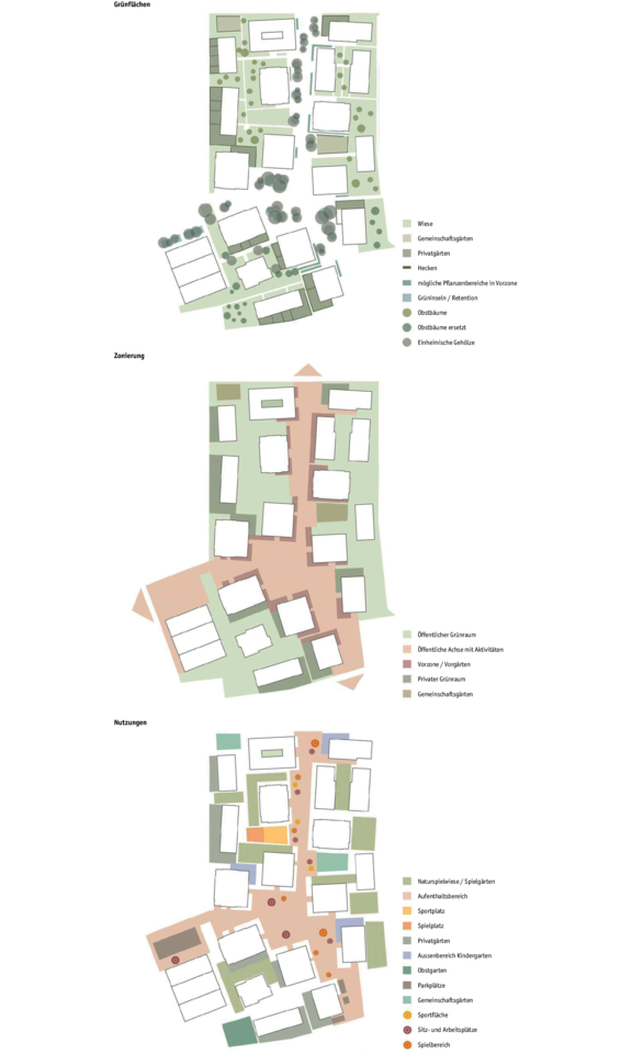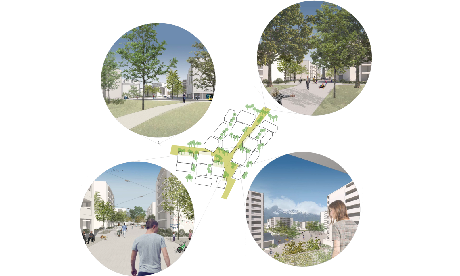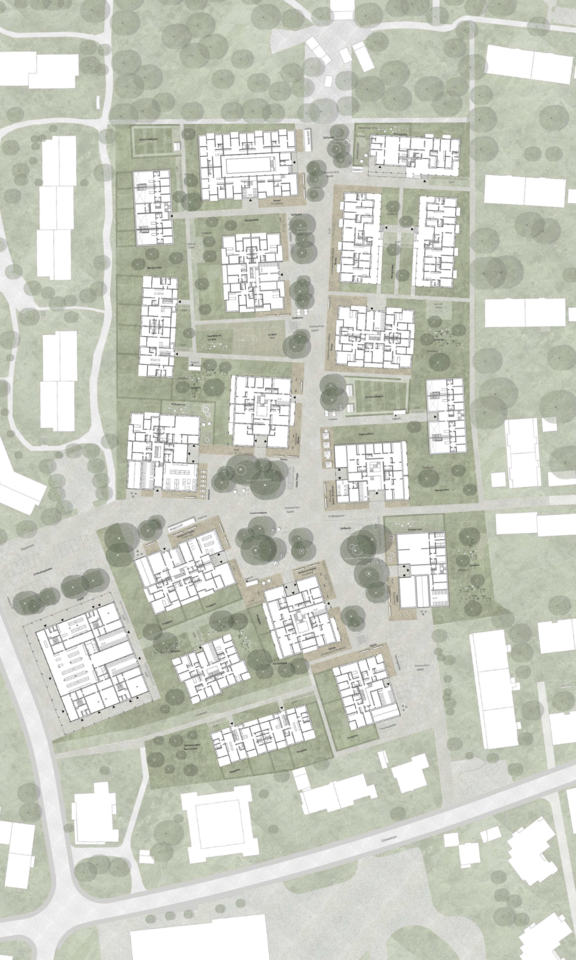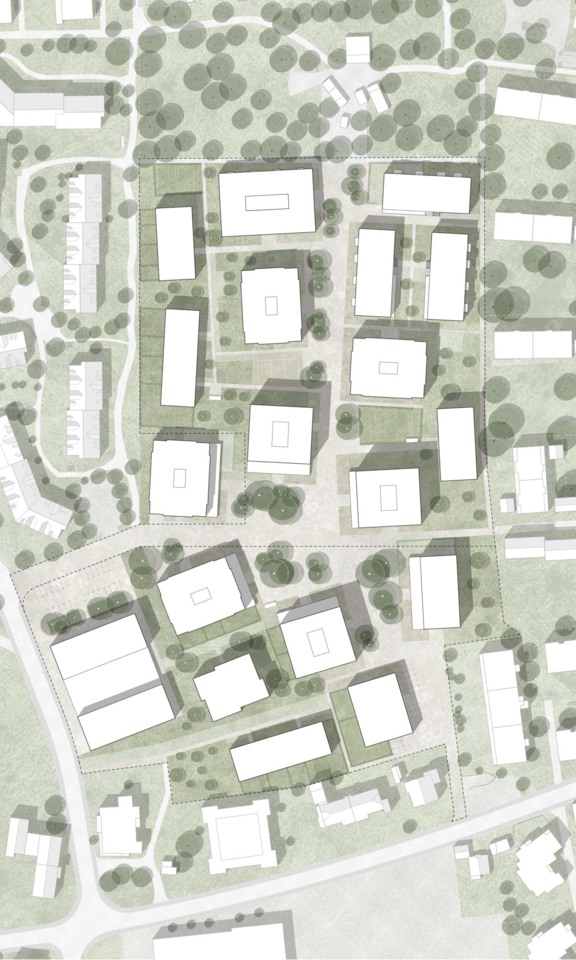 Unser Konzept gliedert das Bostudenzelg-Quartier in einzelne etappierbare Baubereiche, deren verbindendes Rückgrat ein zusammenhängender Freiraum ist. Wie drei Äste eines Y bilden die Freiräume die Hauptschlagader des neuen Stadtteils, welche von aussen auf einen Zentrumsplatz hinstreben. Hier hauchen unterschiedliche Nutzungen in den Erdgeschossen dem Quartier Leben ein. Der Freiraum selbst ist als baumbestandener urbaner Platz mit unterschiedlichen Spiel- und Erholungsangeboten konzipiert.