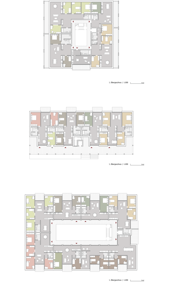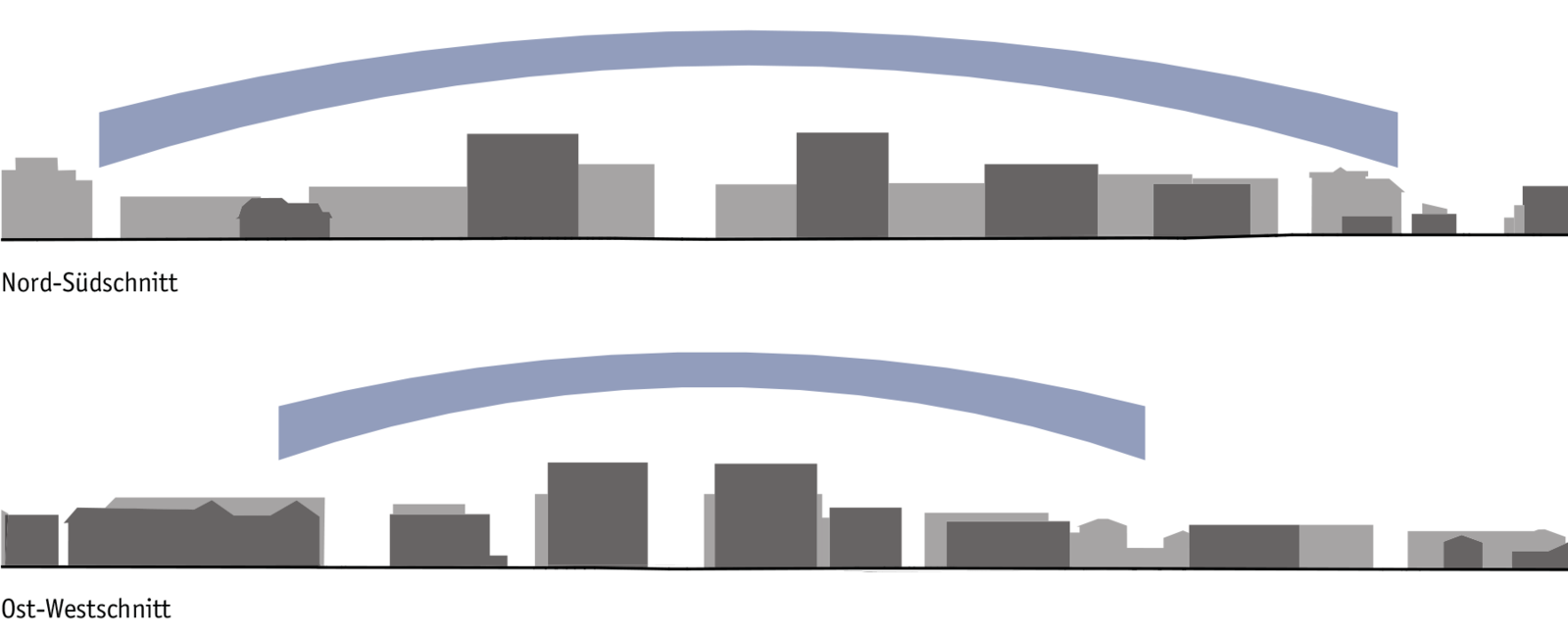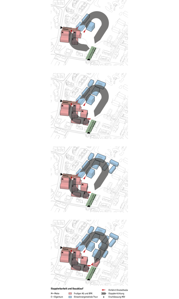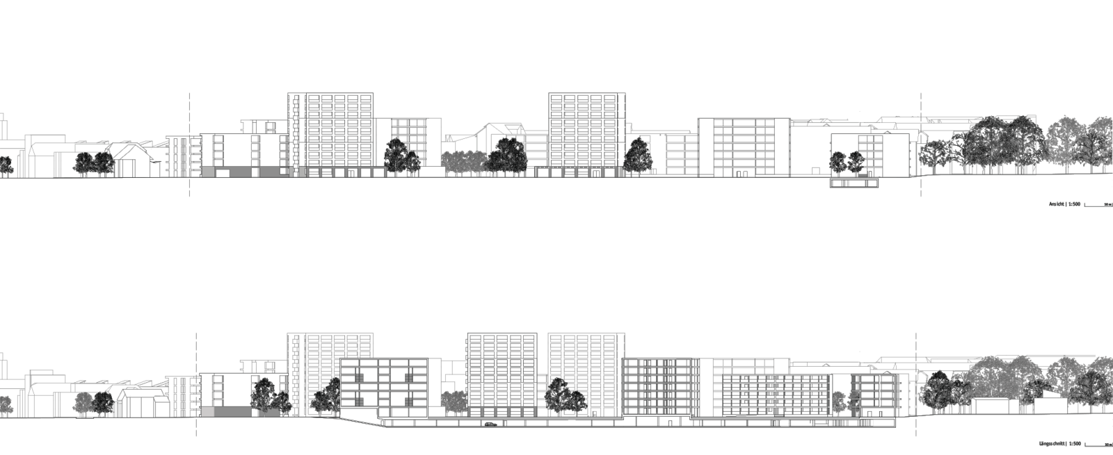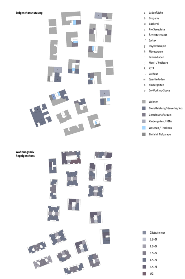 Die Überbauung entwickelt sich vom Zentrum her, wo mit zehngeschossigen Bauten ein städtebaulicher Akzent gesetzt wird. Daran anschliessende Gebäude stufen sich zu den benachbarten Wohnquartieren hin ab. Unterschiedliche Bautypologien vermeiden eine Monokultur. Die Wohnbauten verfügen über planerische Flexibilität, die eine Justierung im Planungsprozess zulassen. Es sind sowohl Miet- wie auch Eigentumswohnungen vorgesehen.