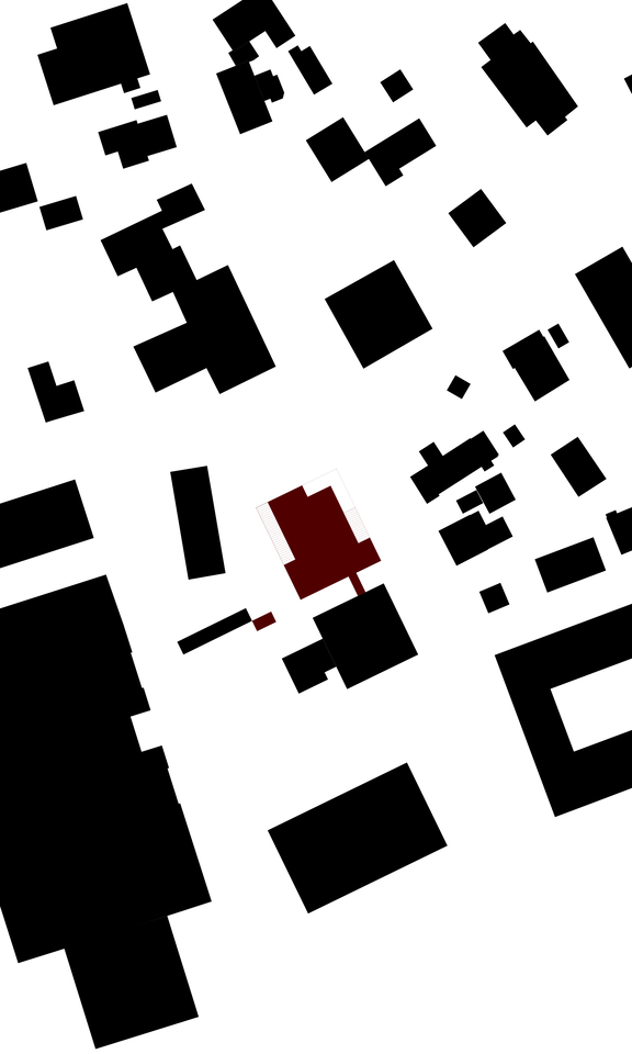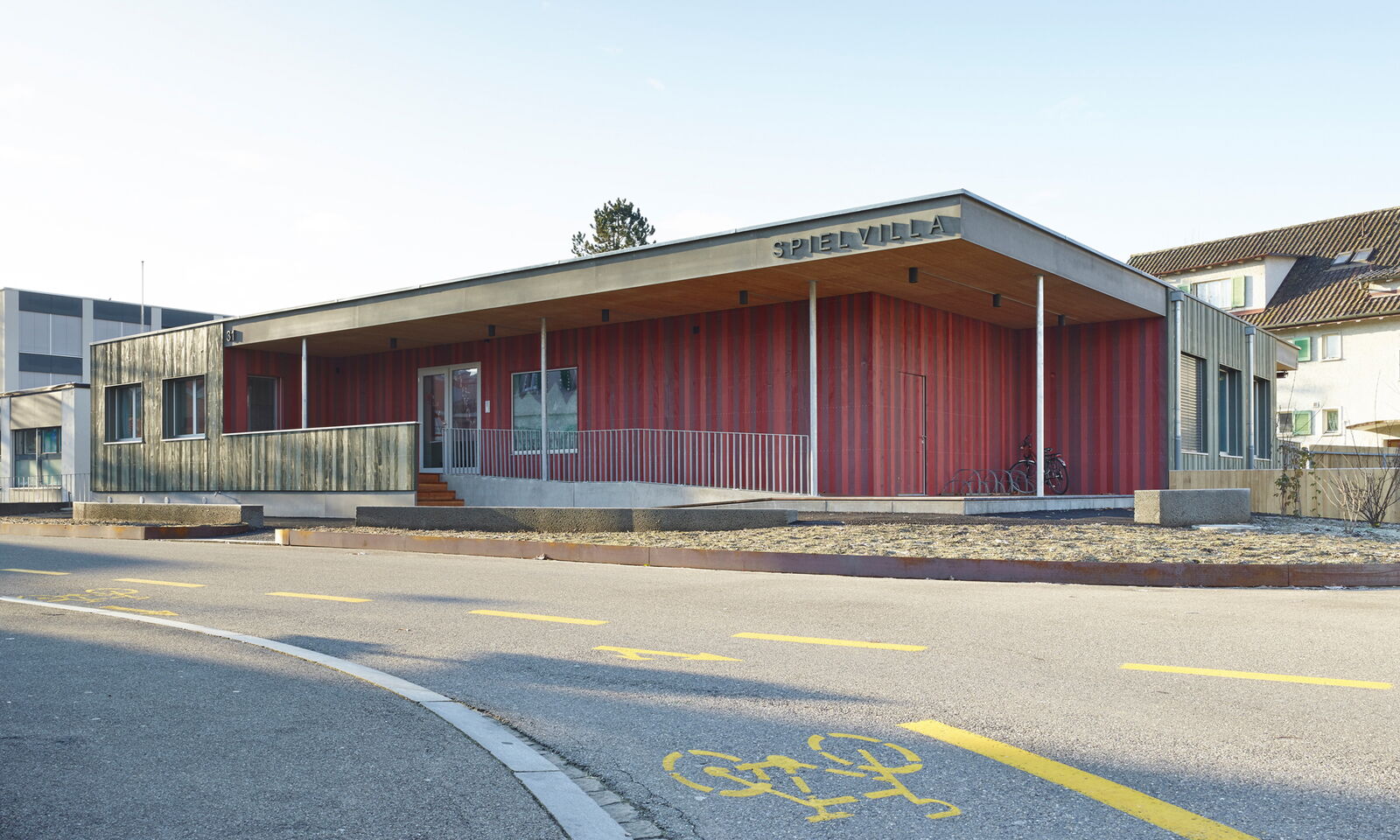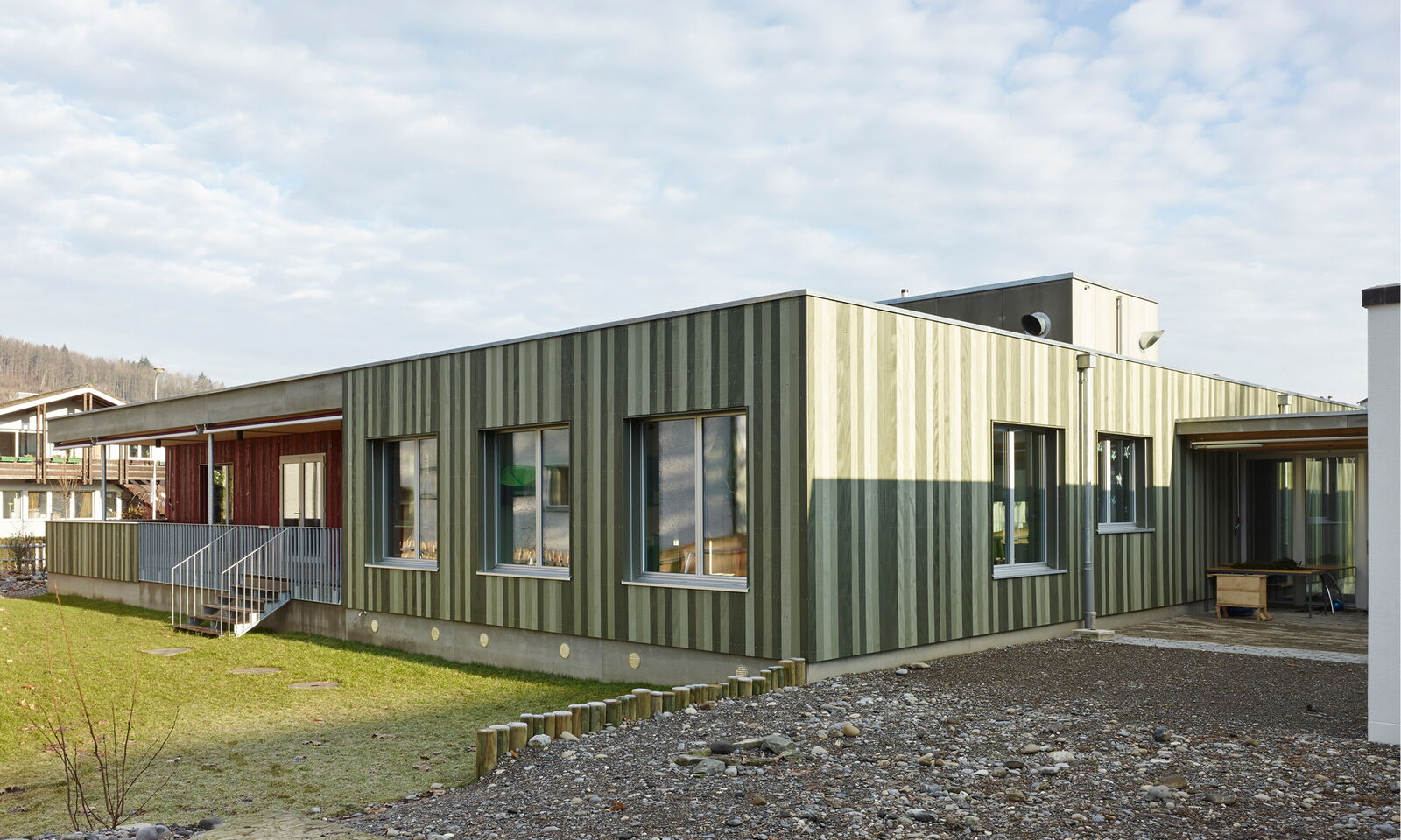 Mit je einem grossen Einschnitt im fast quadratischen, eingeschossigen Baukörper reagiert dieser auf den Strassenraum und auf die Vernetzung mit der Umgebung.