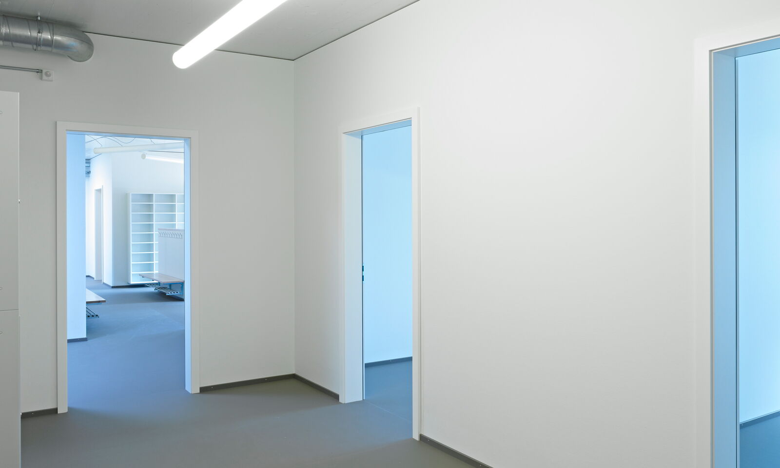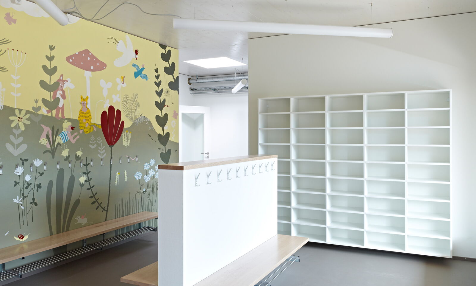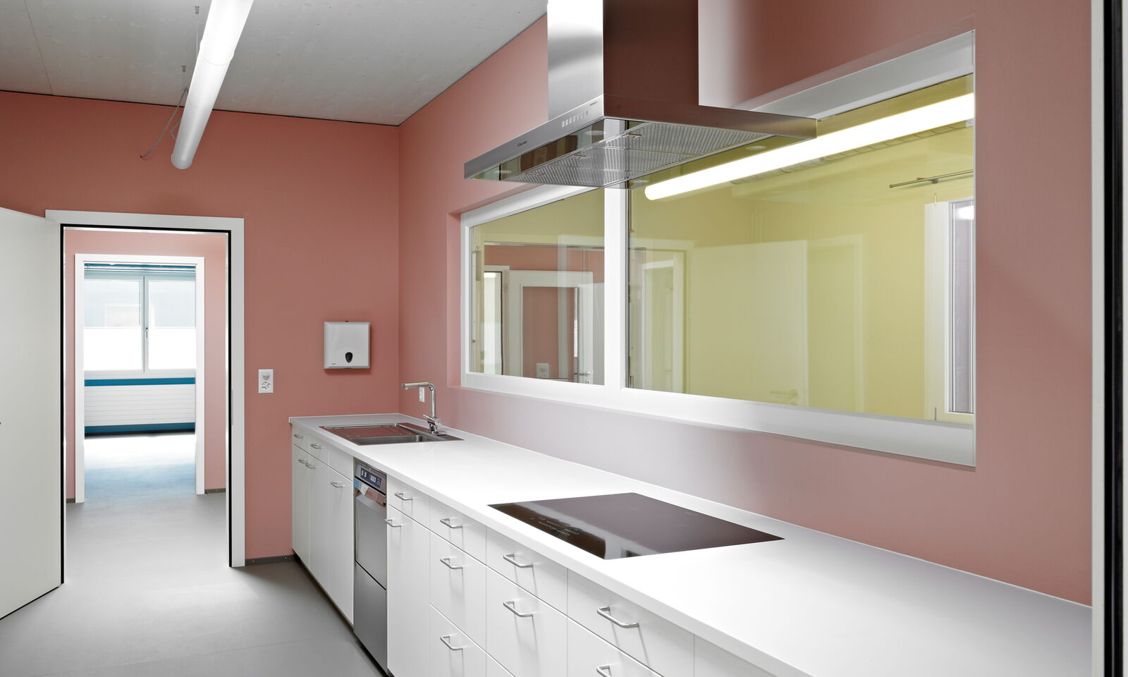 Mit je einem grossen Einschnitt im fast quadratischen, eingeschossigen Baukörper reagiert dieser auf den Strassenraum und auf die Vernetzung mit der Umgebung.