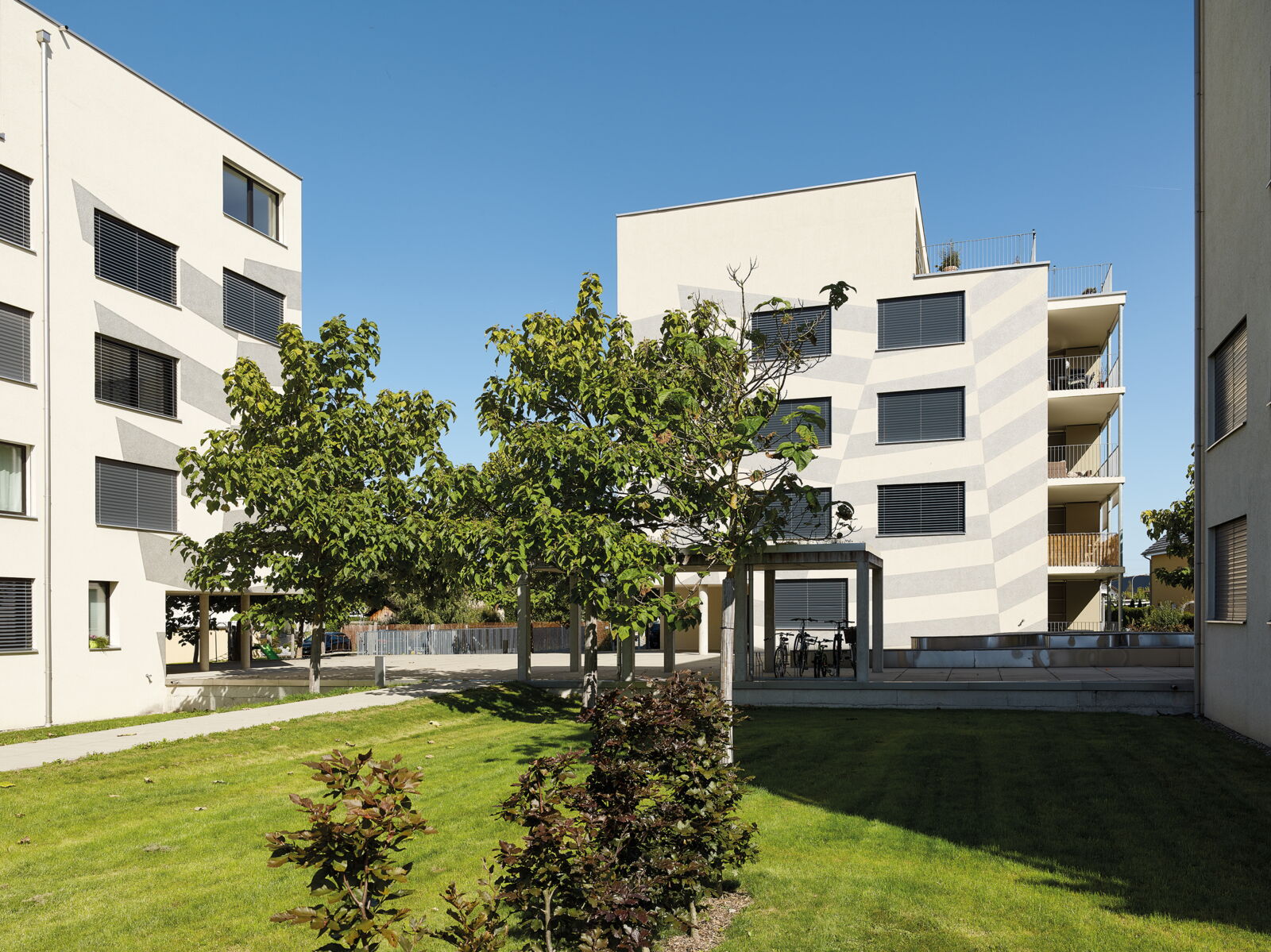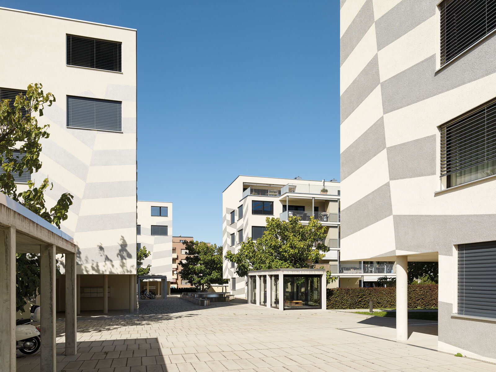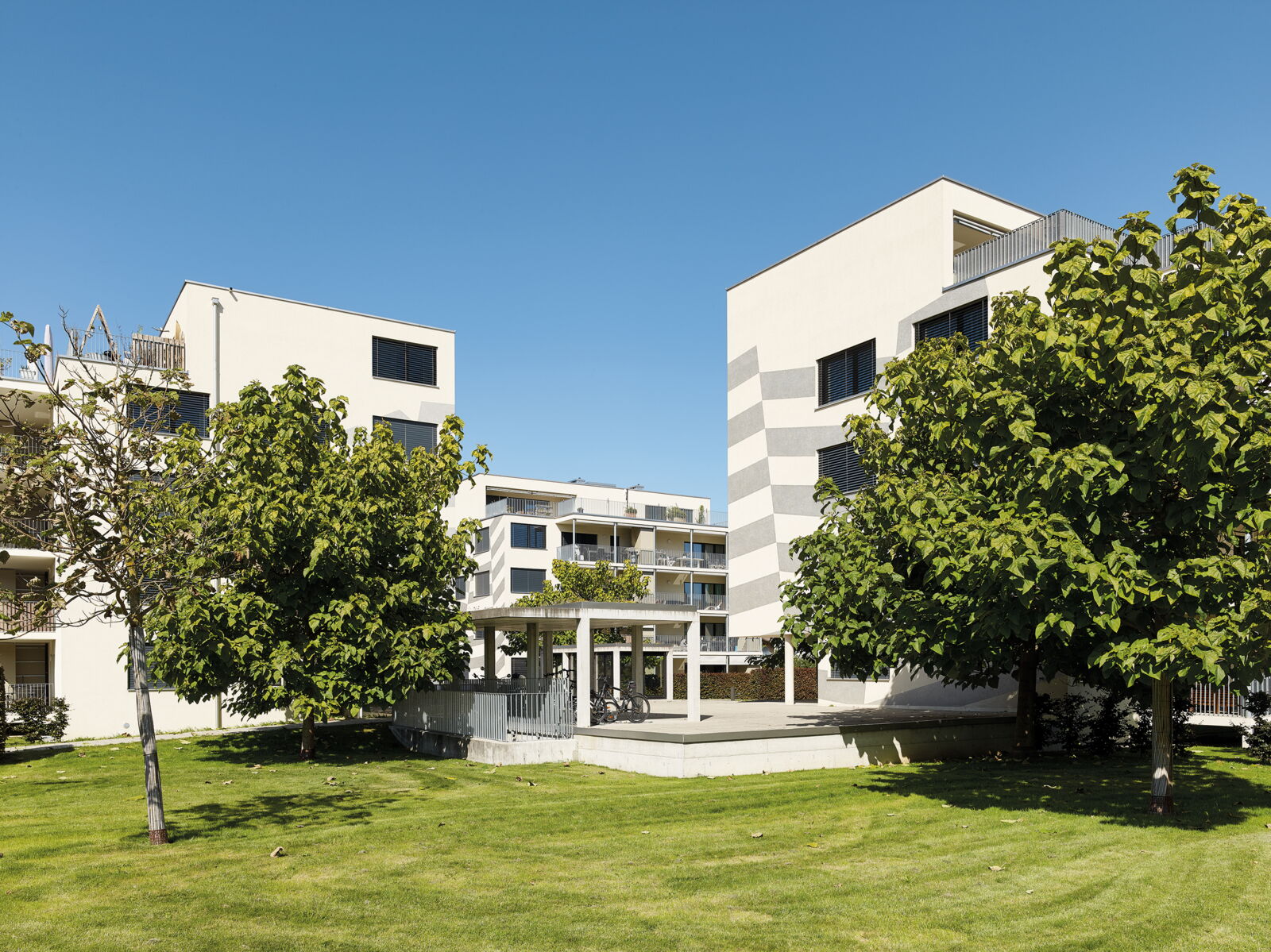 Die aus dem Grundwasser gehobene Einstellhalle funktioniert wie ein «Dock» und bindet die vier Häuser an. Zusammen mit diesem erhöhten Zwischenraum bilden die Volumina unterschiedlich definierte, weitläufige Aussenräume. Der zur Strasse hin ausgebildete, erhöhte Platz wirkt identitätsstiftend.