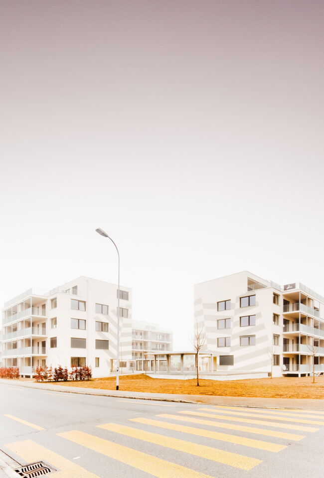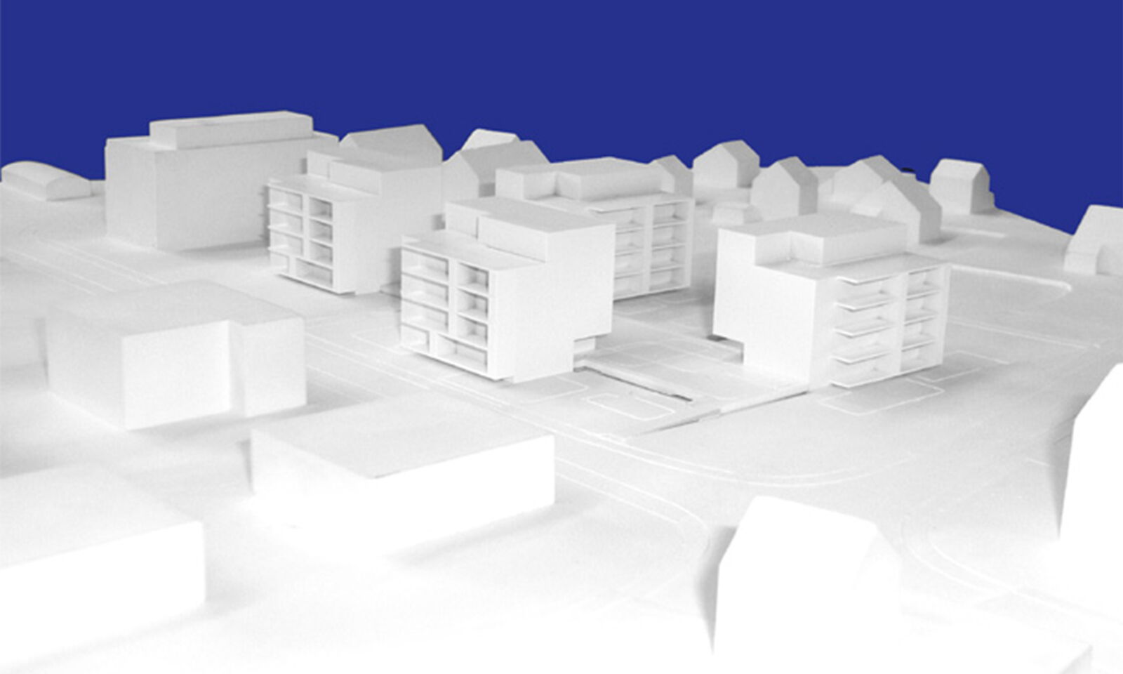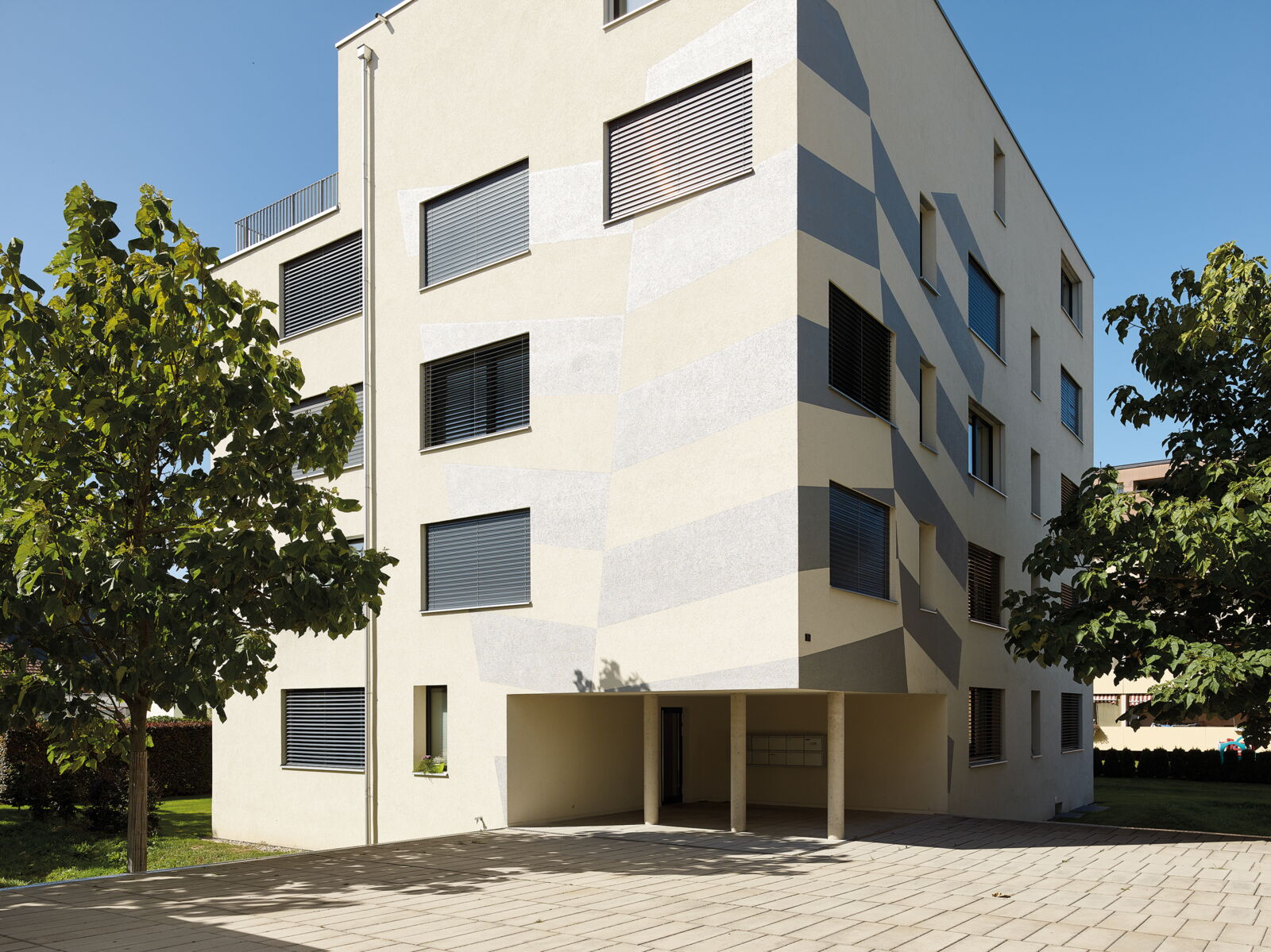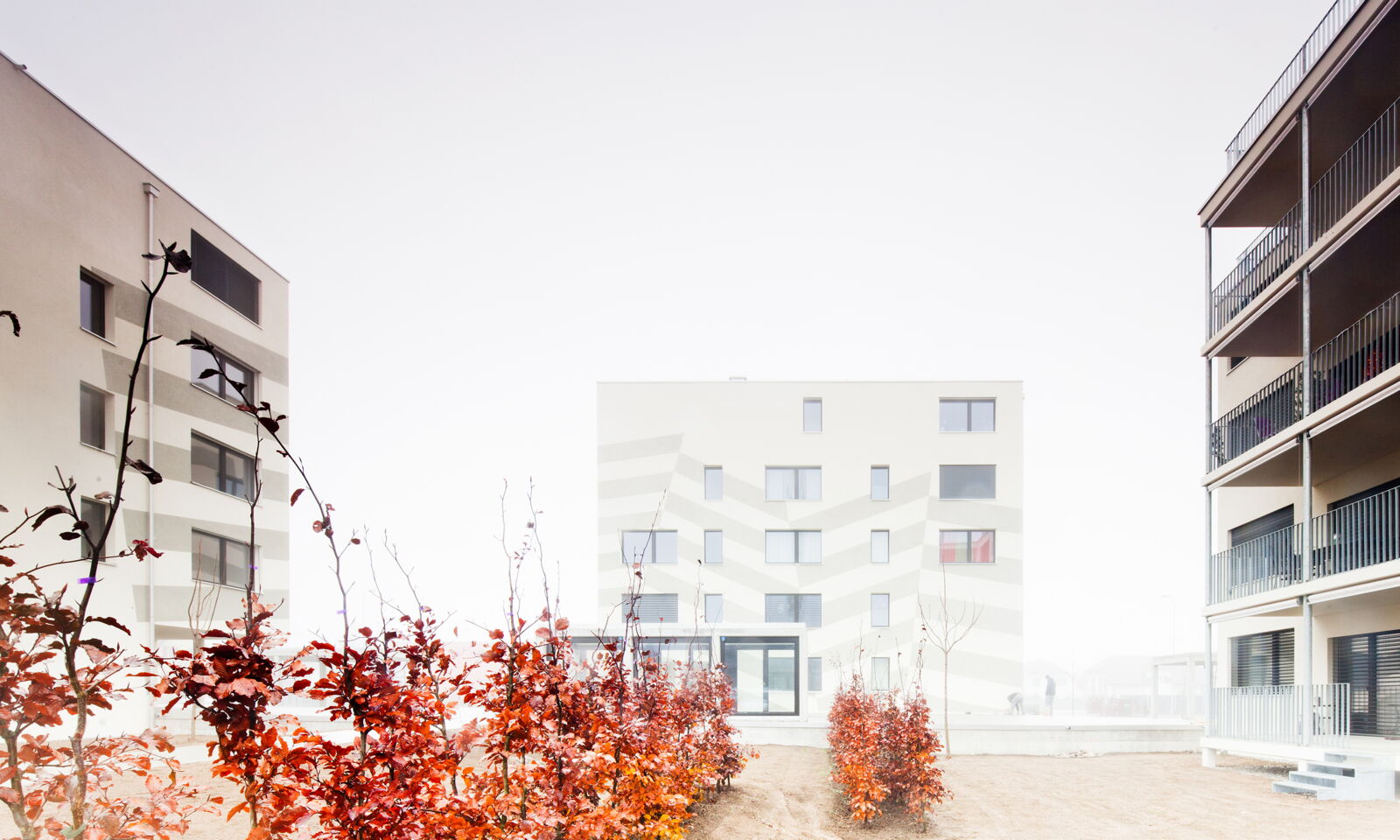Die aus dem Grundwasser gehobene Einstellhalle funktioniert wie ein «Dock» und bindet die vier Häuser an. Zusammen mit diesem erhöhten Zwischenraum bilden die Volumina unterschiedlich definierte, weitläufige Aussenräume. Der zur Strasse hin ausgebildete, erhöhte Platz wirkt identitätsstiftend.
