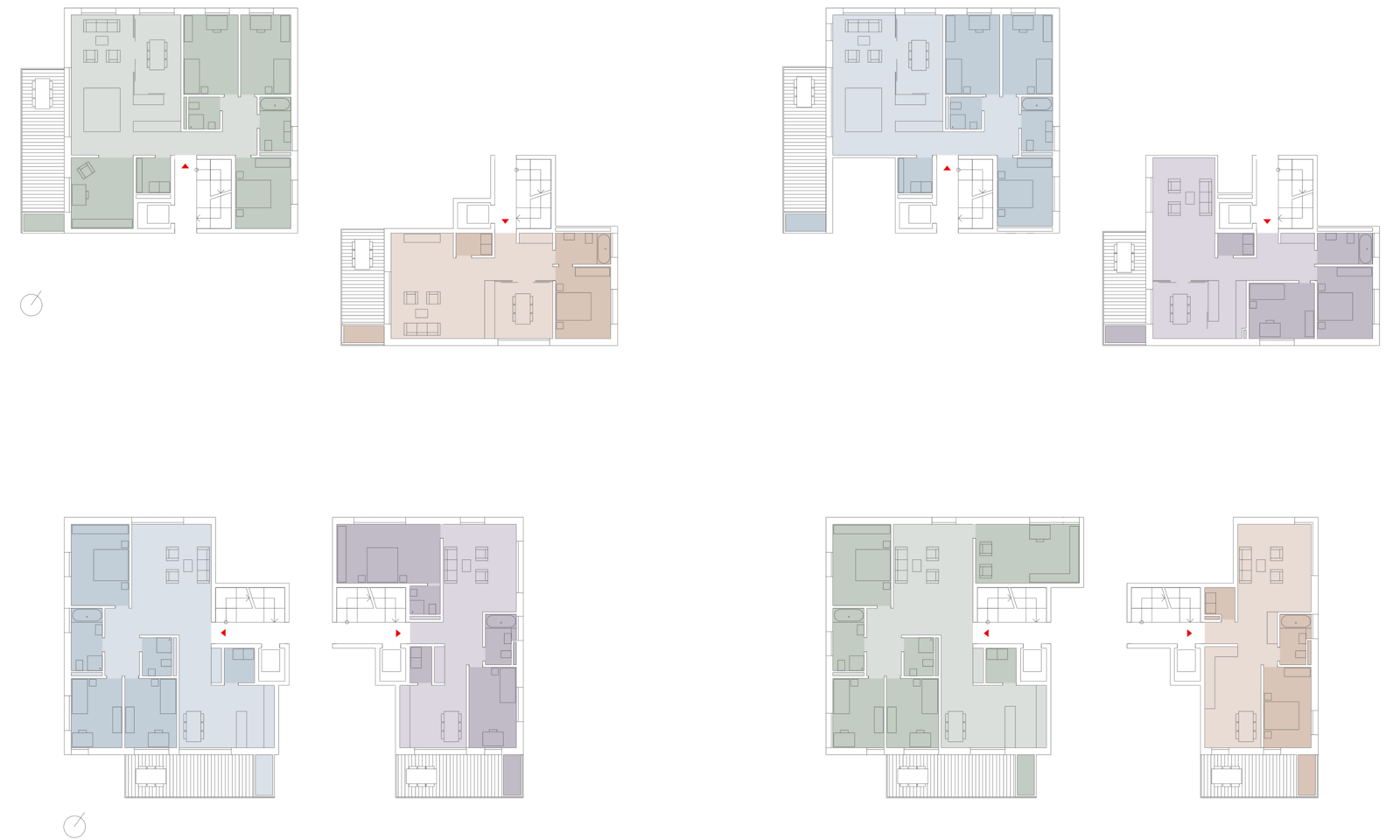 Die Wohnungen sind zweispännig angeordnet. Tag- und Nachbereiche werden durch einen grosszügigen Eingangsbereich zoniert. Die Balkone sind Süd- und West ausgerichtet.