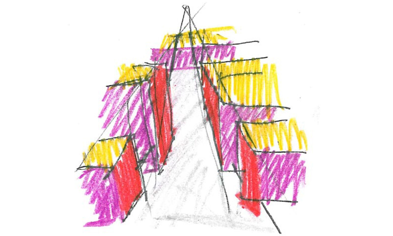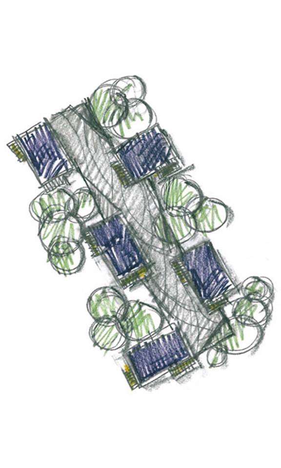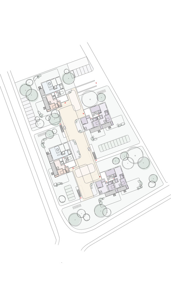 Die Parzellentiefe ermöglicht eine mittig angeordnete, ober- und unterirdische Erschliessung. Fussgänger und fahrender Verkehr bewegen sich auf unterschiedlichen Ebenen.