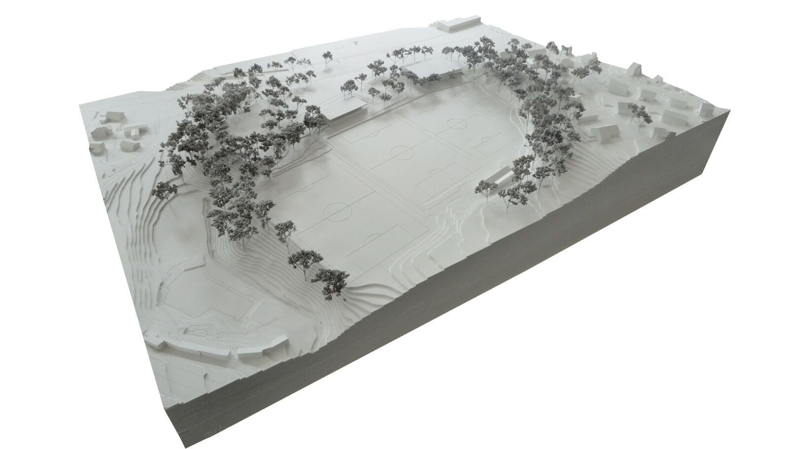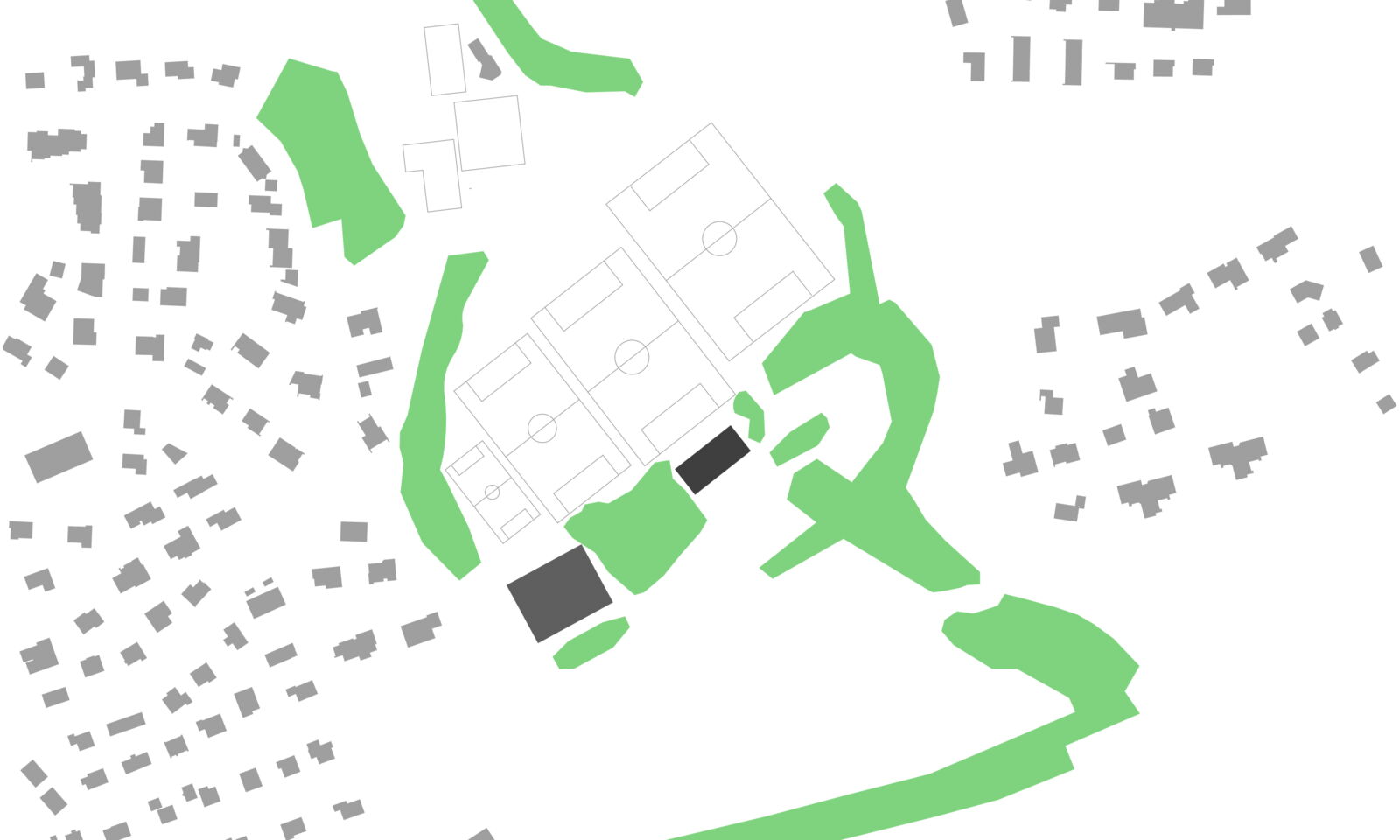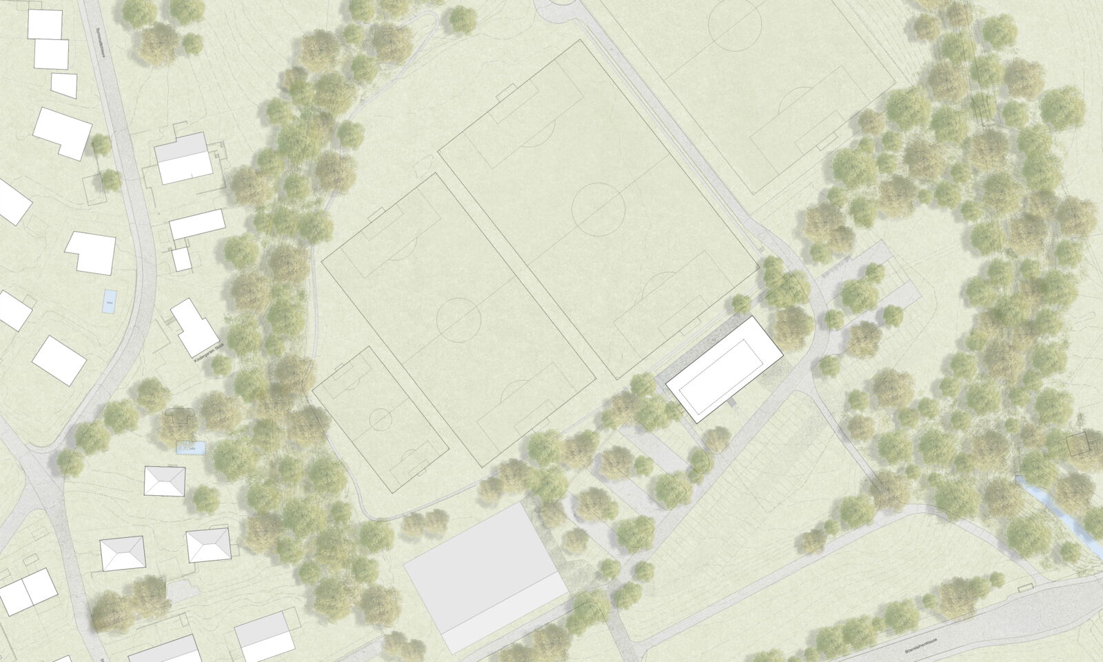 Die Setzung des Garderobengebäudes ist orthogonal und axial auf das grosse Spielfeld ausgerichtet. Die Dreifachhalle liegt im südlichen Bereich des Perimeters. Sie wird in den Baumbestand eingebettet (und um einen Drittel eingegraben) um die Integrität des Freiraumes zu erhalten. Die beiden Gebäude treten so mit gleicher Höhe in Erscheinung.