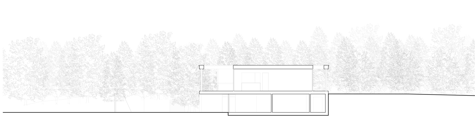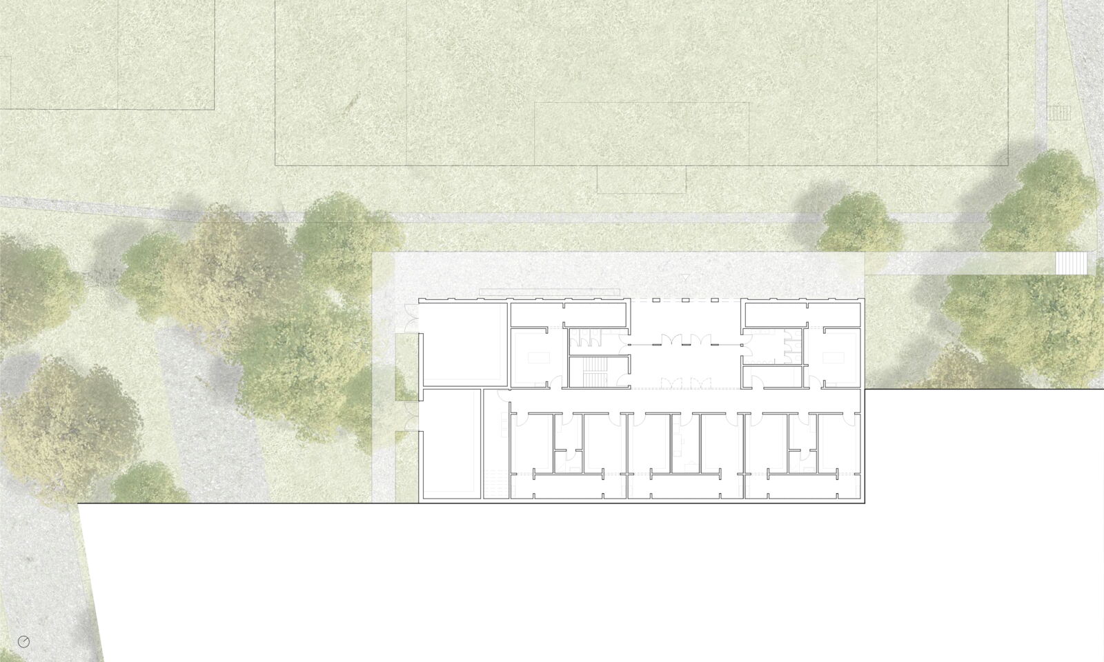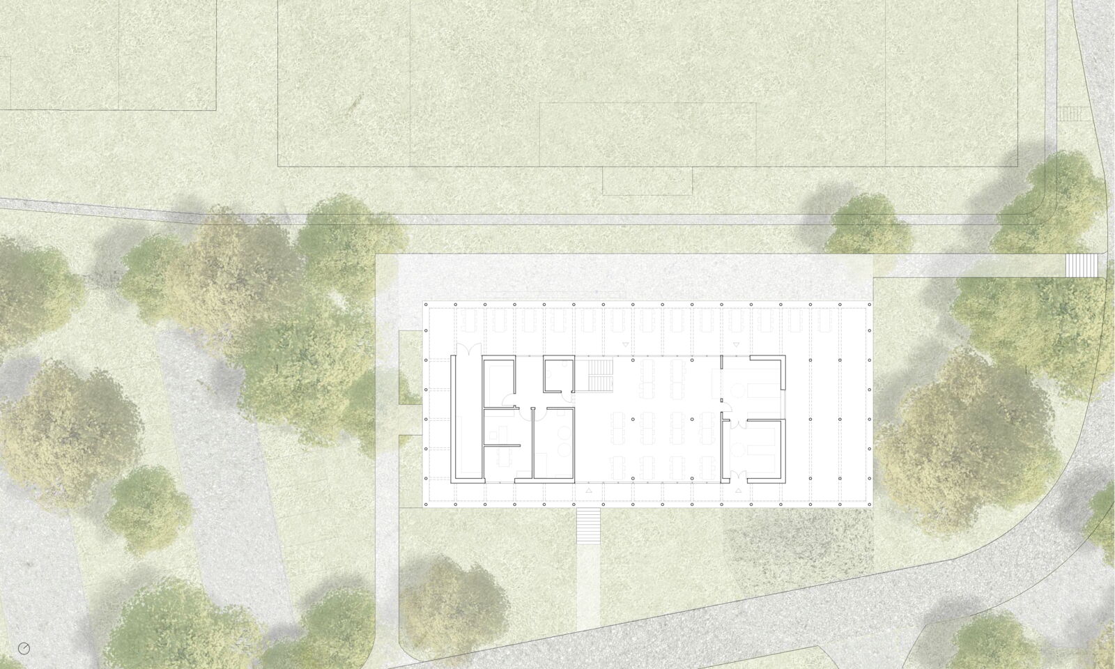 Die Setzung des Garderobengebäudes ist orthogonal und axial auf das grosse Spielfeld ausgerichtet. Die Dreifachhalle liegt im südlichen Bereich des Perimeters. Sie wird in den Baumbestand eingebettet (und um einen Drittel eingegraben) um die Integrität des Freiraumes zu erhalten. Die beiden Gebäude treten so mit gleicher Höhe in Erscheinung.