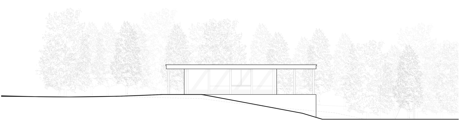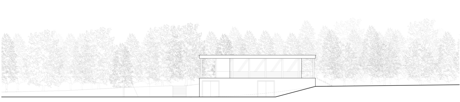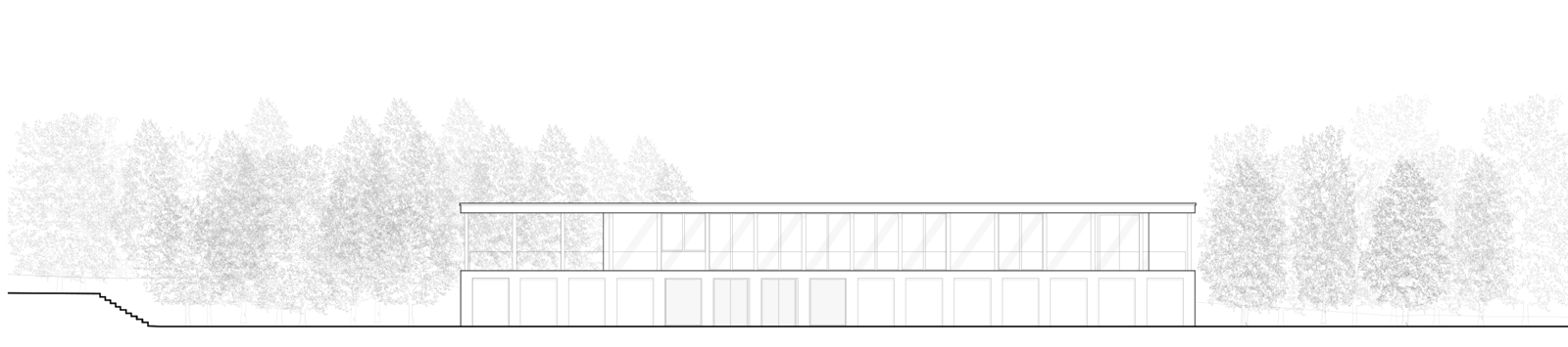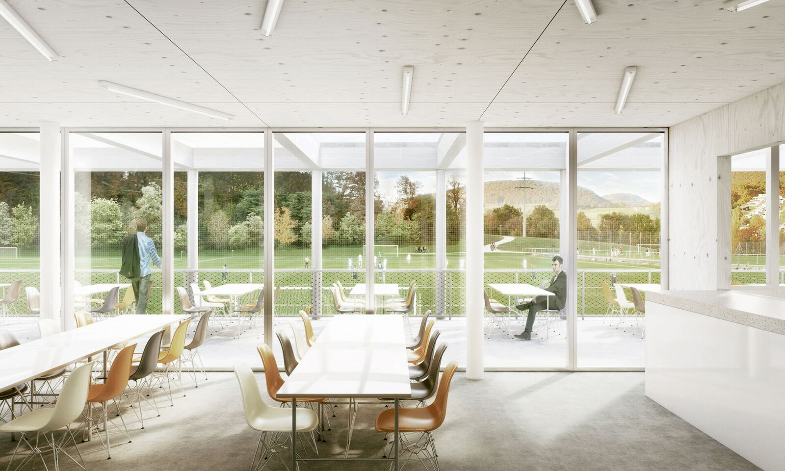 Die in den Hang geschobene, zweigeschossige Garderobenbaute vermittelt zwischen den Ebenen. Der Garderobenteil ist à Niveau von den Spielfeldern aus erreichbar. Der Gastronomiebereich steht adressbildend als Pavillon über dem massiven Sockel.