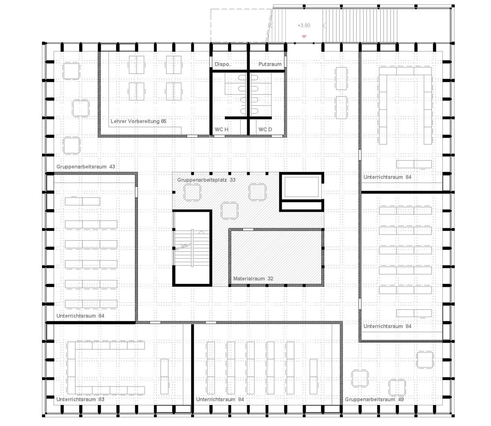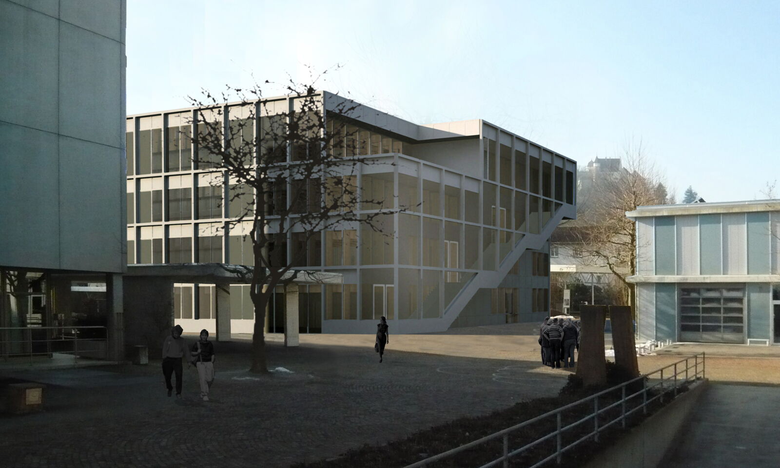 Weiterbildungszentrum und Kongressnutzung. Dem Campus-Gedanken verpflichtet, ordnet sich das Weiterbildungszentrum in die Schulanlage ein. Die halböffentliche Nutzung für Seminare und Konferenzen macht das Gebäude zu einem wichtigen Vermittler innerhalb und ausserhalb der Schulanlage. Die Klassenzimmer sind gruppenweise um den Betonkern angeordnet, sie spielen Flächen zu Gunsten von Gruppenräumen frei. Zwischen Betonkern und tragender Fassade (Holzbau mit Aluminium-Fassade), ist eine Kassettendecke gespannt. Die nichttragenden Klassenwände lassen gitterartig das Tageslicht in den Innenbereich dringen. Wettbewerb mit Präqualifikation.