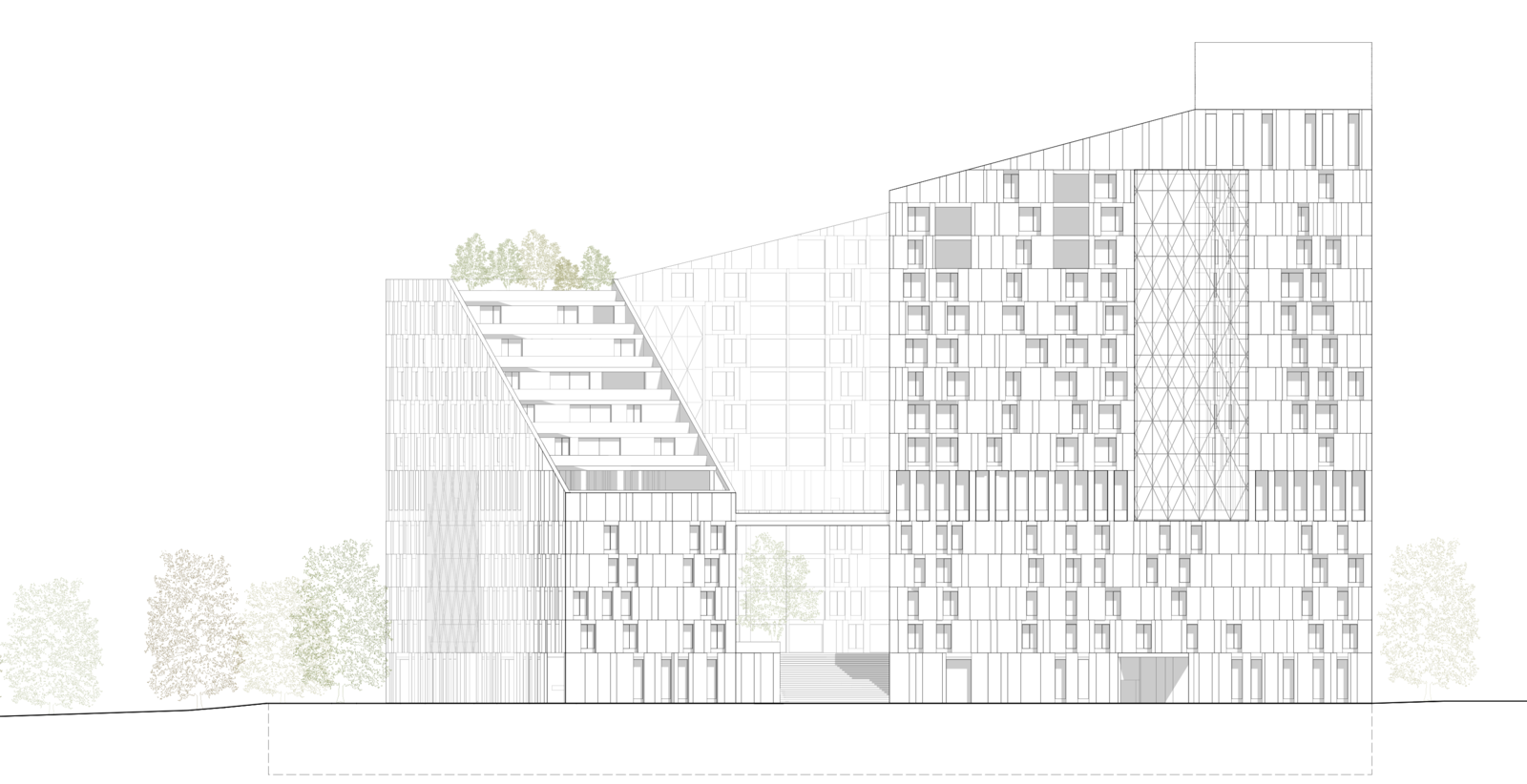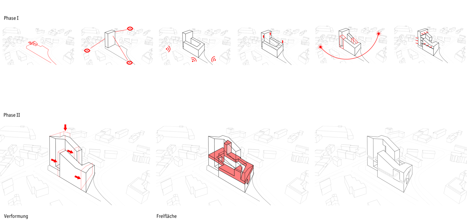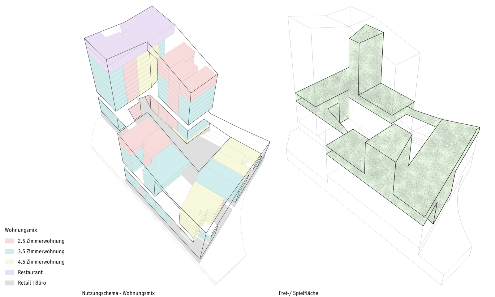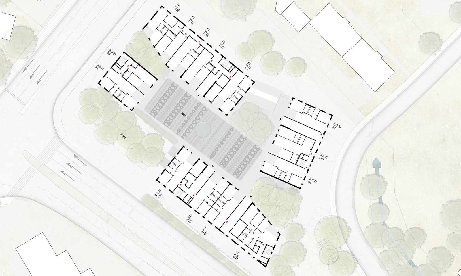 Die winkelförmigen Bauten fassen den Ort, definieren den hofartigen Zwischenraum und sorgen für eine gute Schallverschattung: der eine kann nicht ohne den anderen. Nur im System erreicht die Setzung ihre Wirkung. Die Gebäudegruppe ist identitätsstiftend für den Ort, sie etabliert einen neuen Schwerpunkt im städtebaulichen Gefüge. Das Auftrennen des Blockrandes – als Reaktion auf die Gebäudehöhen und -distanzen – und die vertikale Gliederung durch die Freiraumschicht stellen die Bezüge zum ortsbaulichen Kontext her.