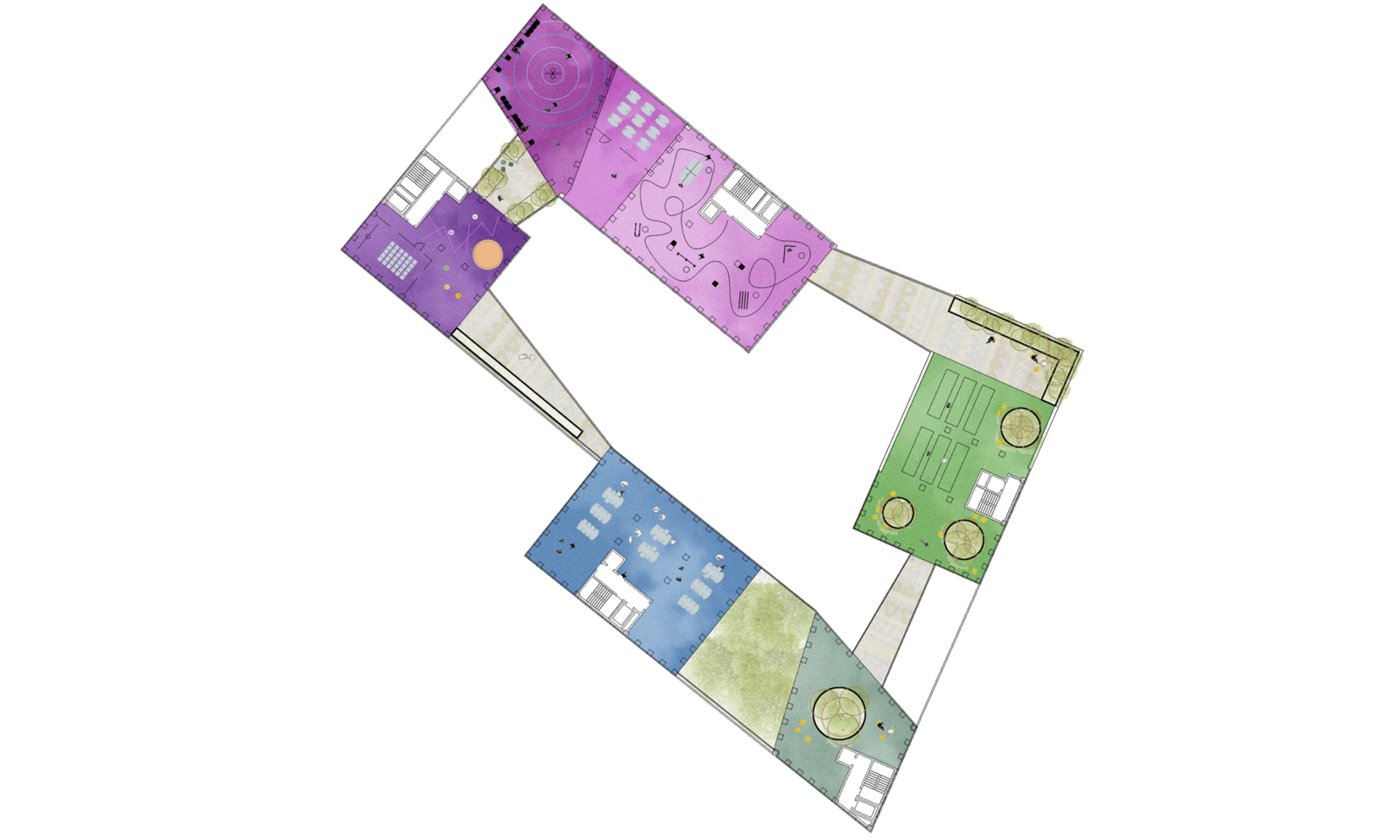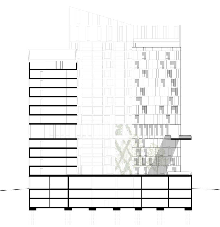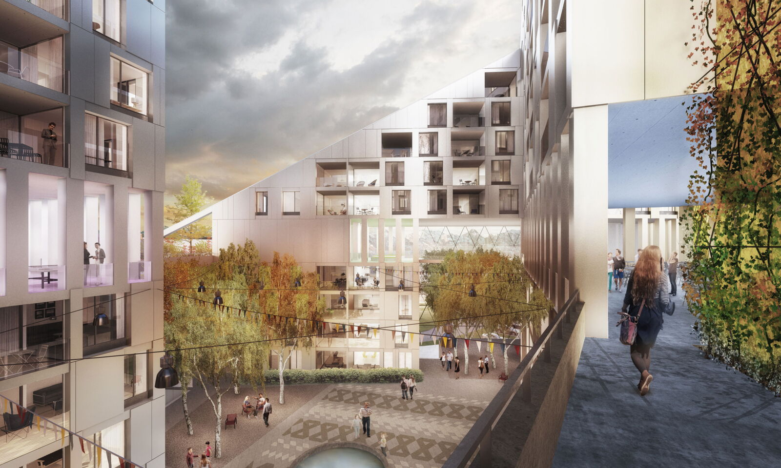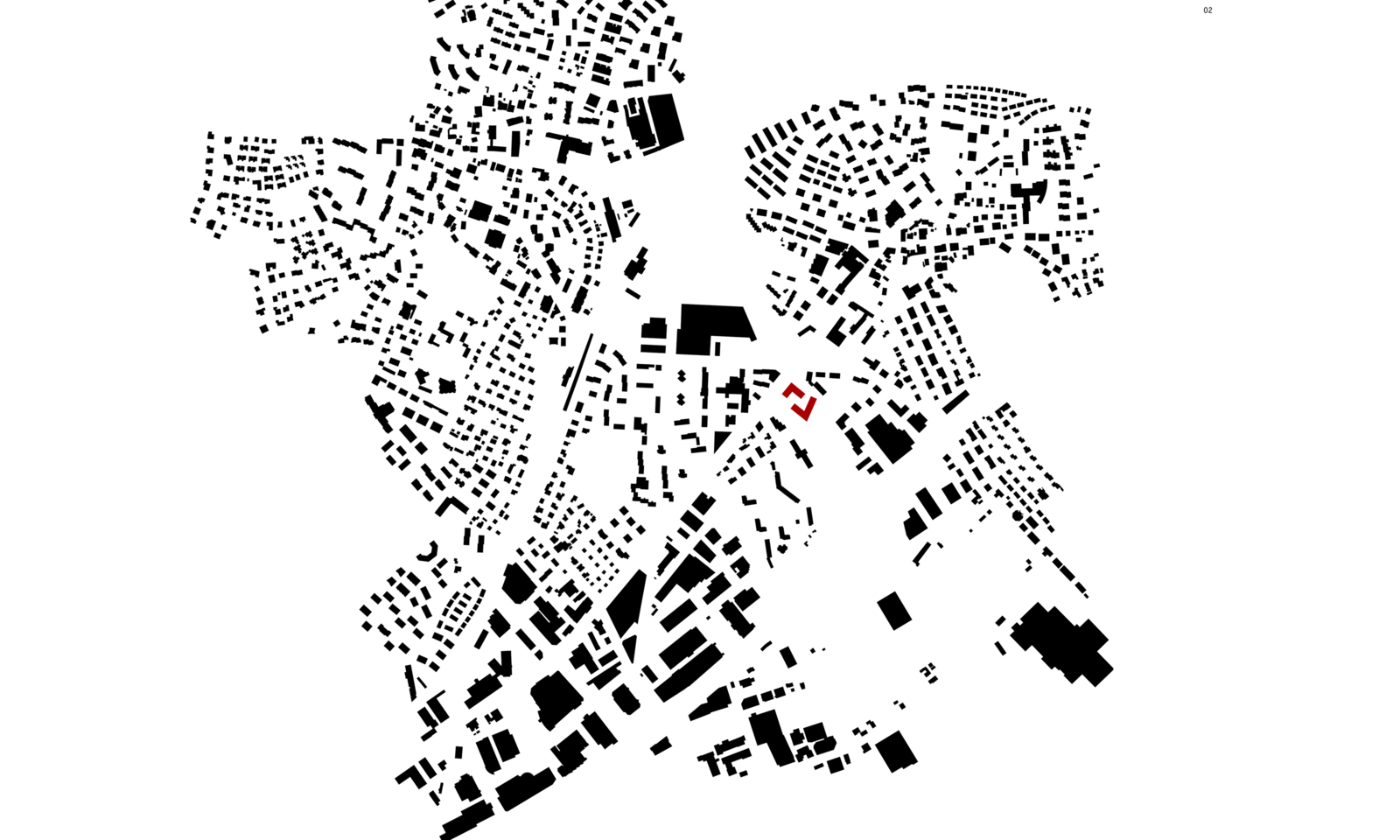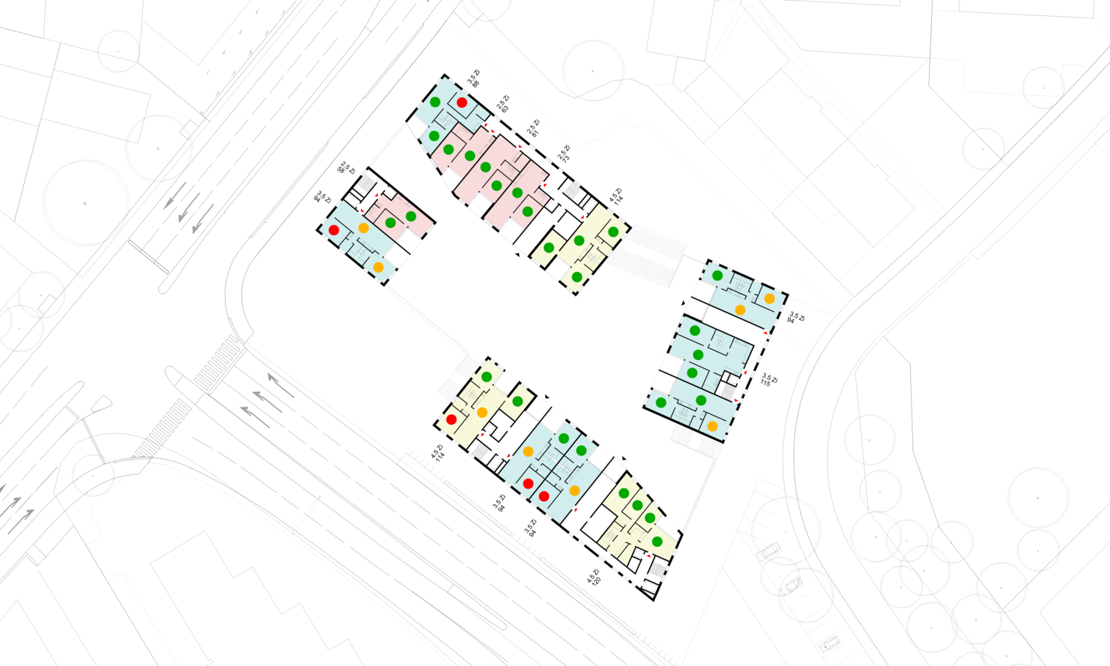 Die winkelförmigen Bauten fassen den Ort, definieren den hofartigen Zwischenraum und sorgen für eine gute Schallverschattung: der eine kann nicht ohne den anderen. Nur im System erreicht die Setzung ihre Wirkung. Die Gebäudegruppe ist identitätsstiftend für den Ort, sie etabliert einen neuen Schwerpunkt im städtebaulichen Gefüge. Das Auftrennen des Blockrandes – als Reaktion auf die Gebäudehöhen und -distanzen – und die vertikale Gliederung durch die Freiraumschicht stellen die Bezüge zum ortsbaulichen Kontext her.