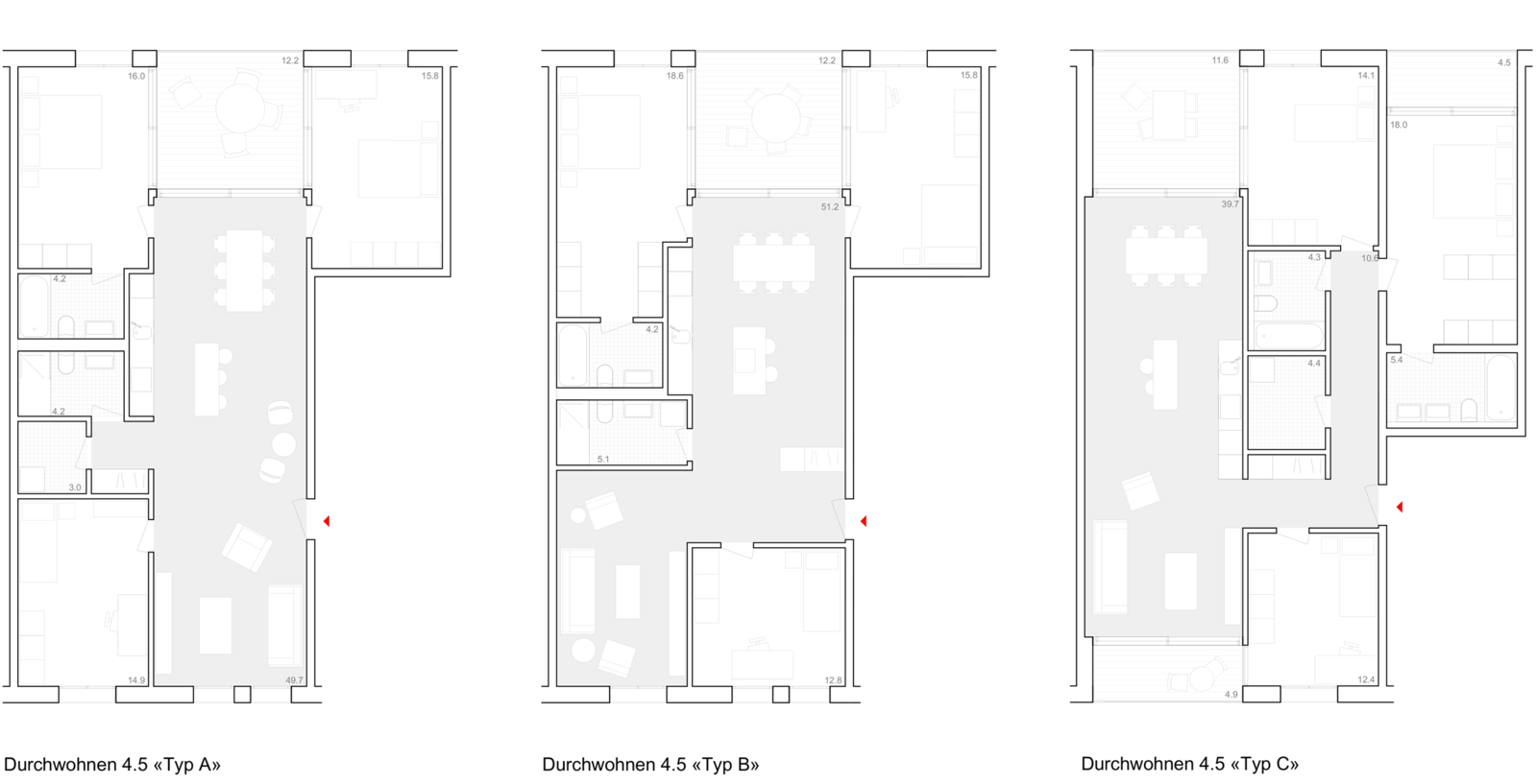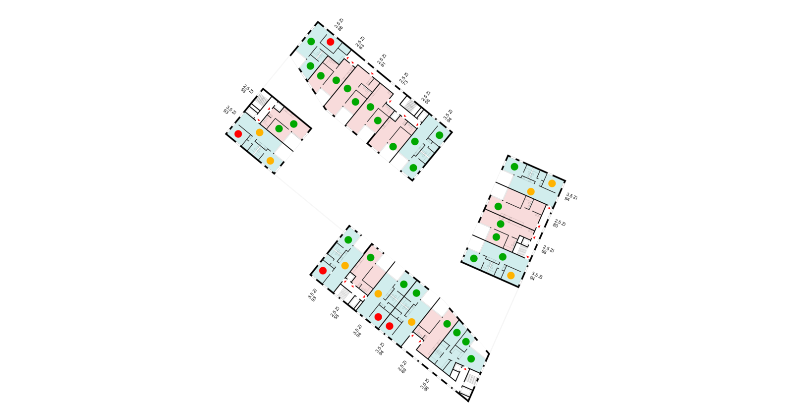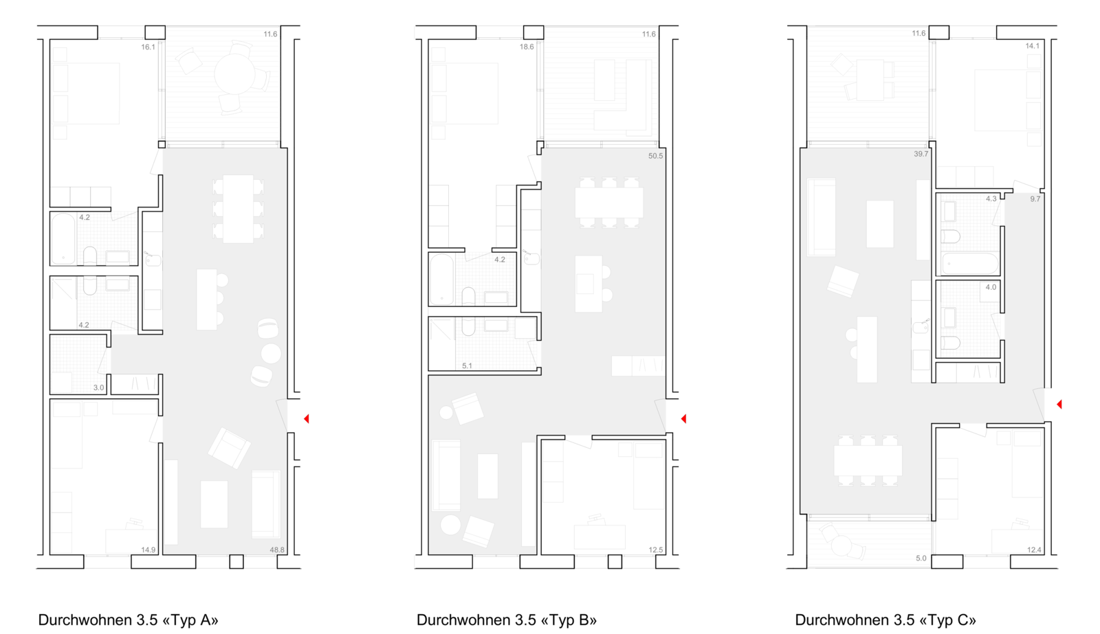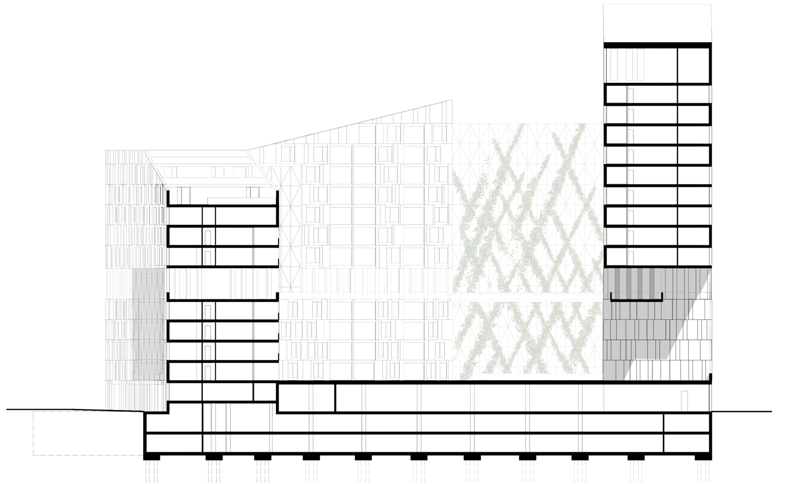 Die winkelförmigen Bauten fassen den Ort, definieren den hofartigen Zwischenraum und sorgen für eine gute Schallverschattung: der eine kann nicht ohne den anderen. Nur im System erreicht die Setzung ihre Wirkung. Die Gebäudegruppe ist identitätsstiftend für den Ort, sie etabliert einen neuen Schwerpunkt im städtebaulichen Gefüge. Das Auftrennen des Blockrandes – als Reaktion auf die Gebäudehöhen und -distanzen – und die vertikale Gliederung durch die Freiraumschicht stellen die Bezüge zum ortsbaulichen Kontext her.