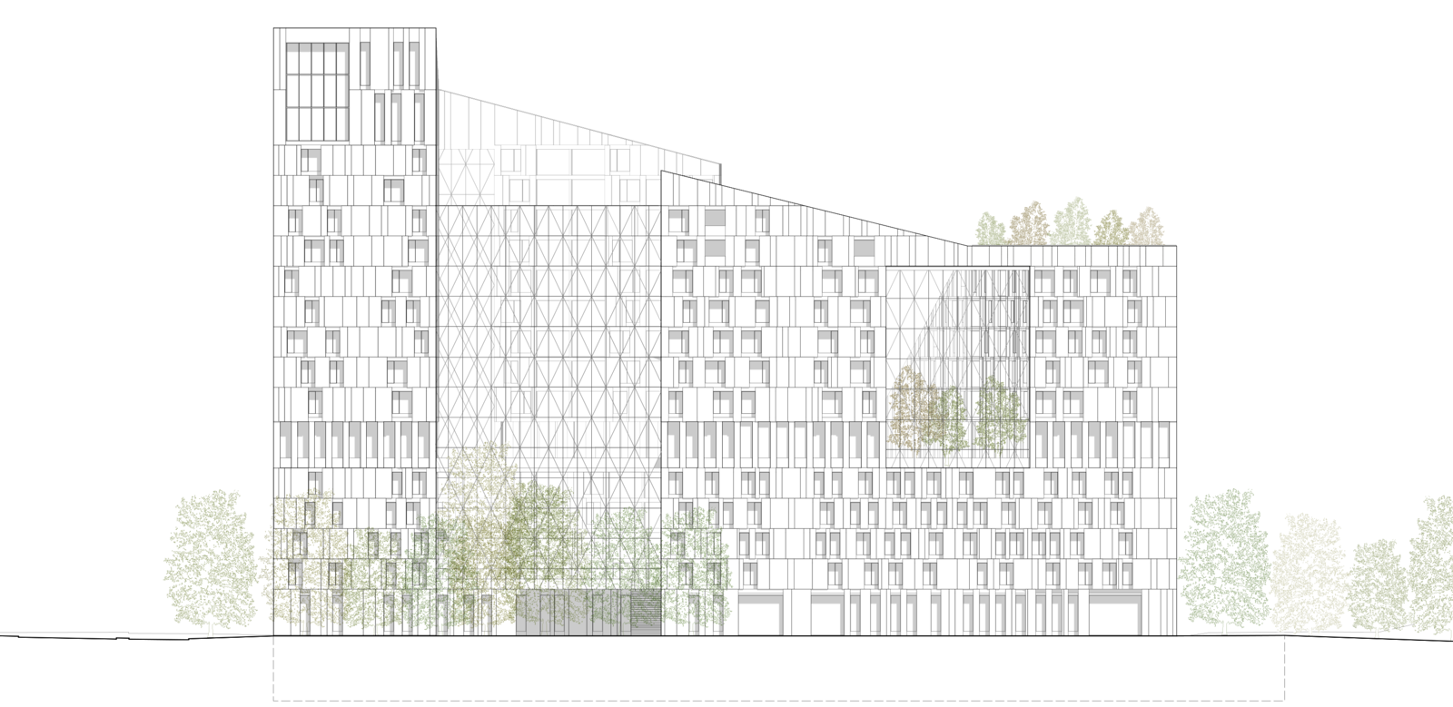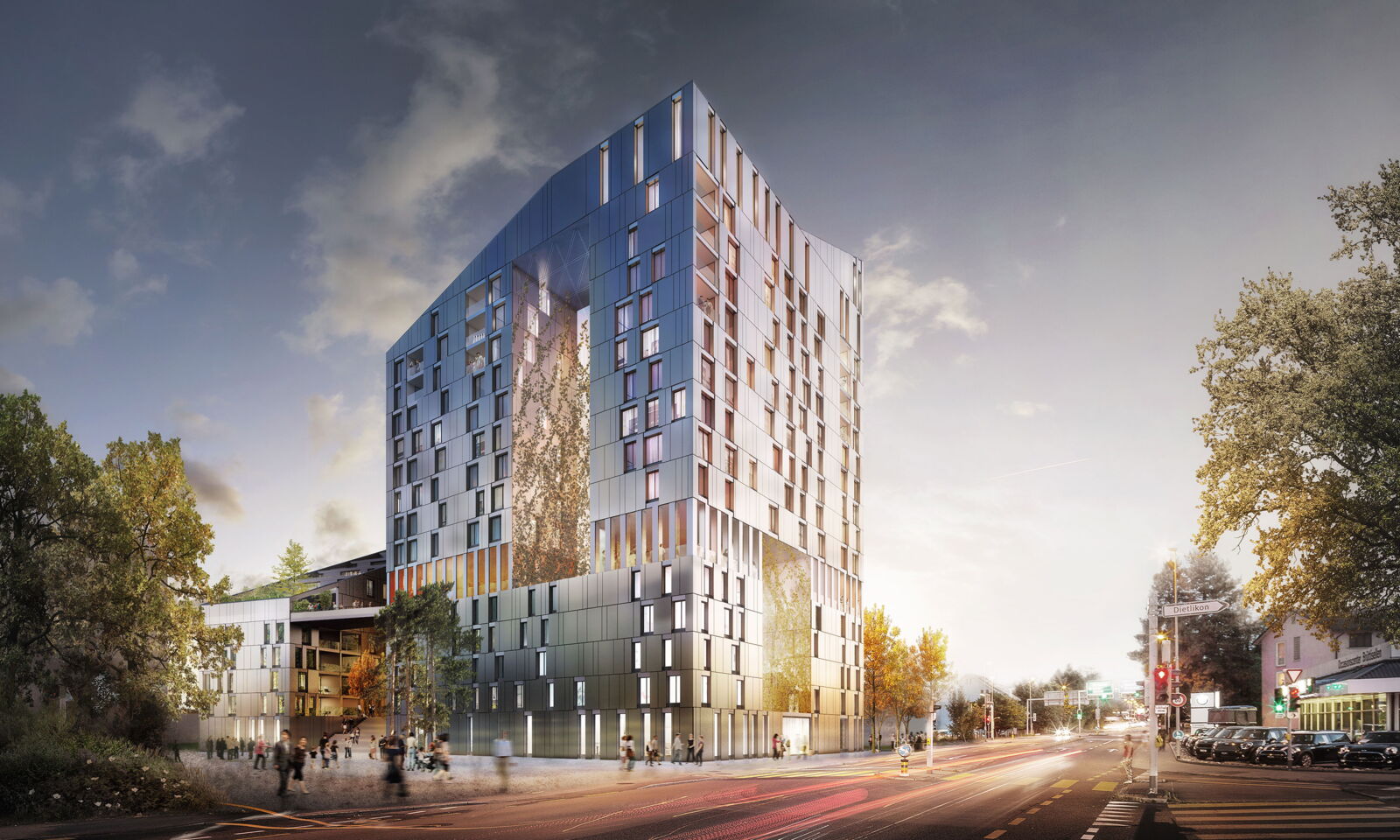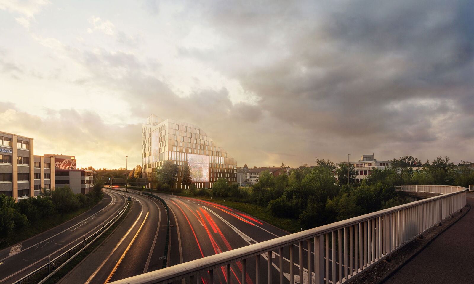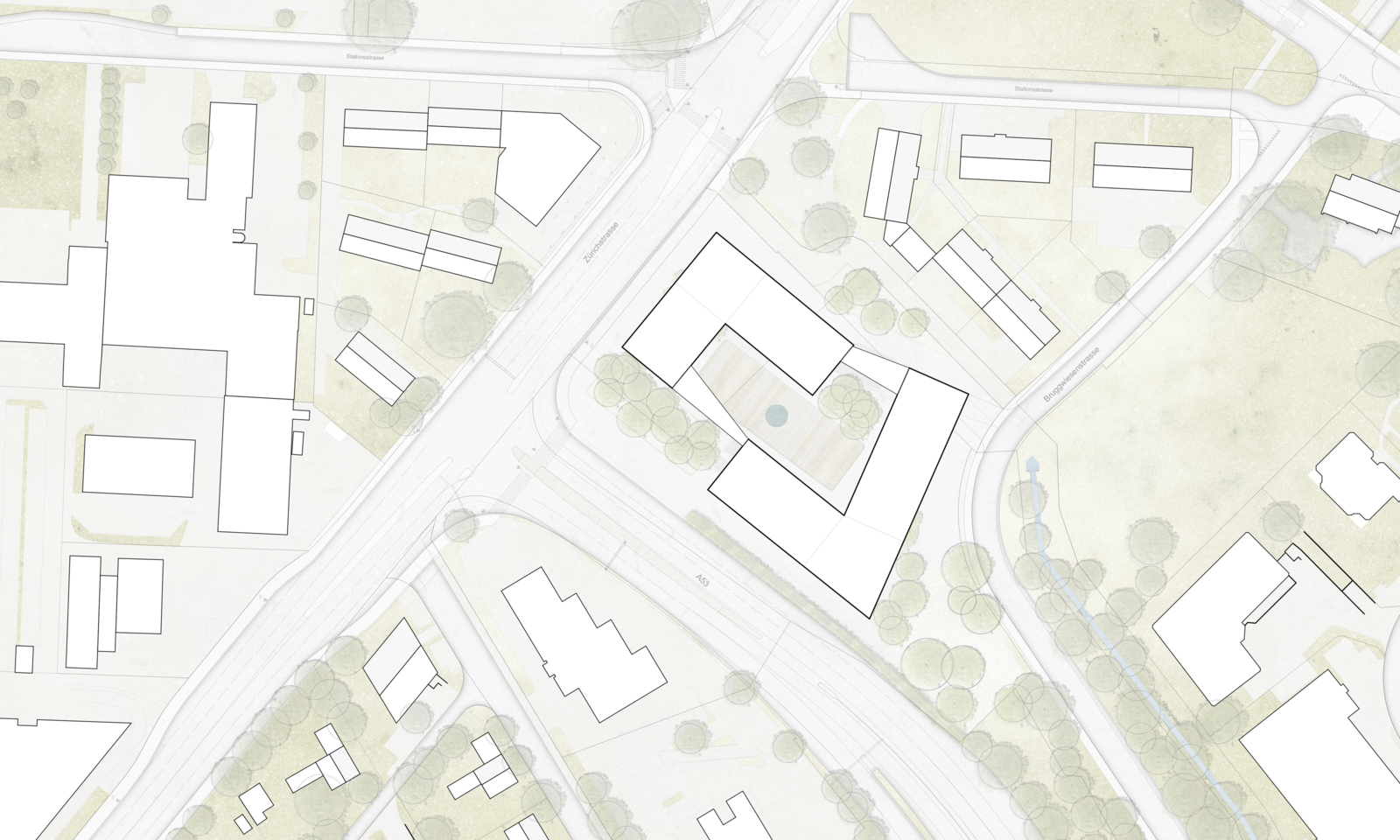 - Zwei Baukörper, welche sich zum Knotenpunkt Zürichstrasse / Autobahnzubringer erhöhen