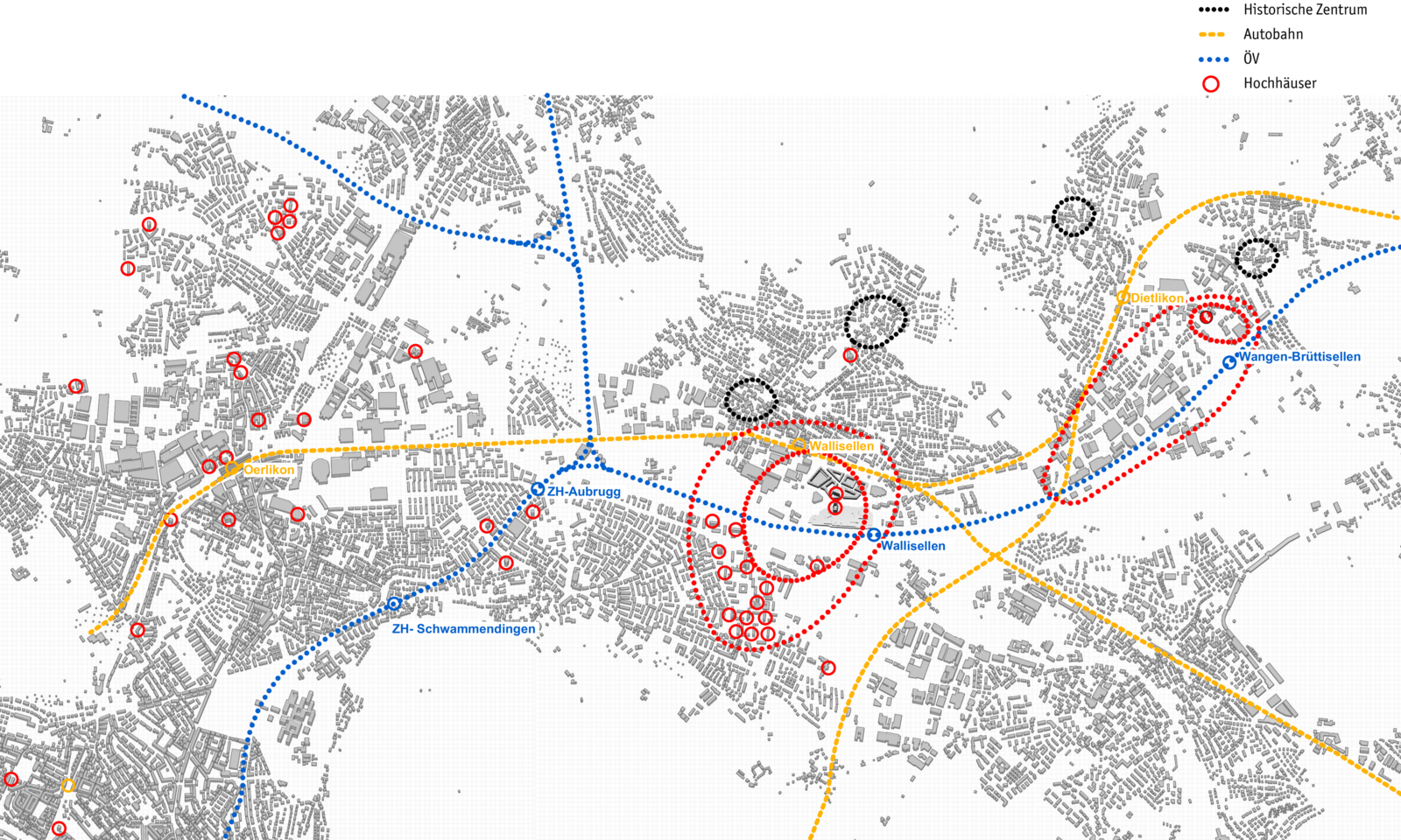 Wenn – unter anderem – der Erschliessungsgrad mittels Bahn und Autobahn als Inkubator für Stadtentwicklung betrachtet werden kann, so hat dies bisher in Wallisellen, Schwamendingen und Oerlikon zu dichteren Bebauungen und höheren Häusern geführt als in Brüttisellen. Hier scheinen die negativen Auswirkungen des Autobahnanschlusses und seines Verkehrsstromes bisher vorgeherrscht zu haben. Das zu beplanende Grundstück bietet in dieser Hinsicht Potential, den Ort gewissermassen umzuwidmen. Eine hohe Bebauung unterstützt die Identifikationsstiftung und kann zusammen mit einer geeigneten Nutzung eine entsprechende Entwicklung des Ortsteils in Bewegung setzen. Die dichte Bebauung wird gewissermassen der Wichtigkeit der Achse und des Knotens gerecht.
