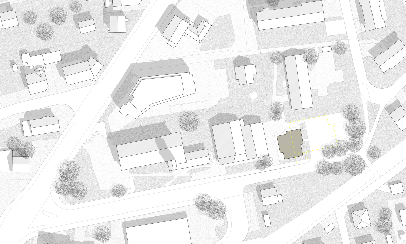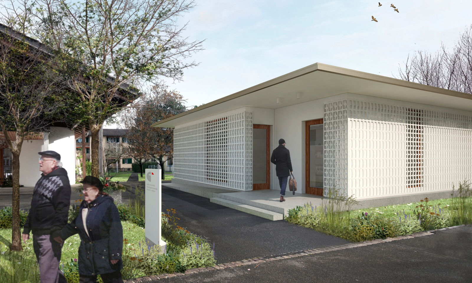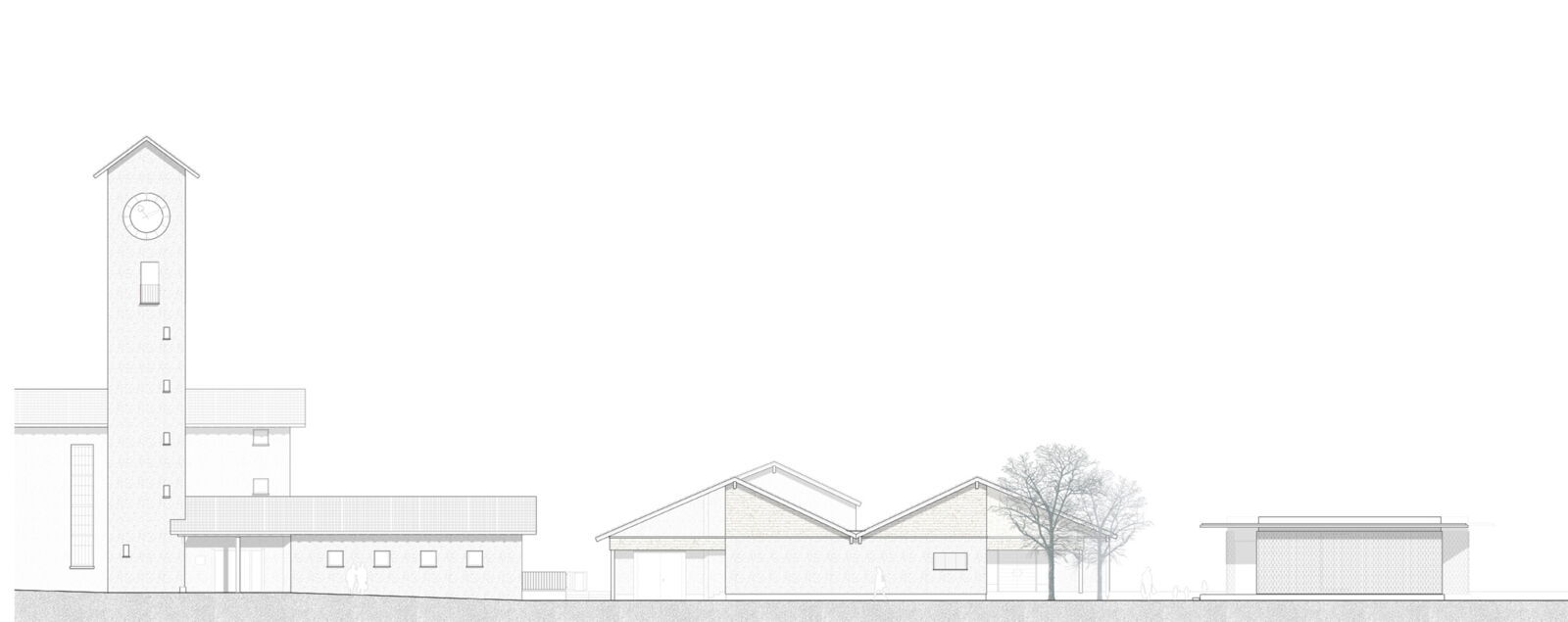 Der neue, pavillonartige Bau bildet, Richtung Westen und in der Höhe gestaffelt, den Abschluss der Baugruppe Kirche und Kirchgemeindehaus. Er etabliert damit ein Wegenetz zu den Wohnbauten und dem Kindergarten in direkter Nachbarschaft.