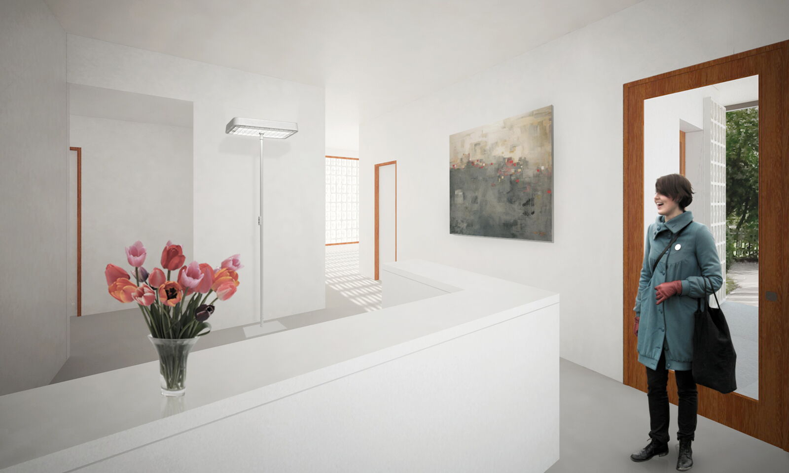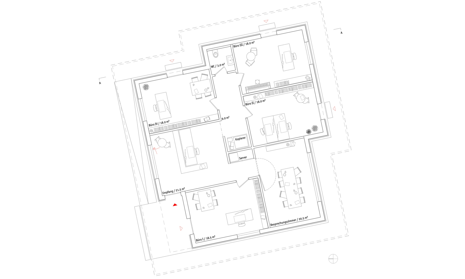 Alle neu bestellten Nutzungen sind ebenerdig angeordnet. Über Empfang und Sekretariat verbunden, sind die Raumzellen aber auch direkt von aussen erreichbar. Die Raumproportionen lassen eine flexible Bespielung zu.