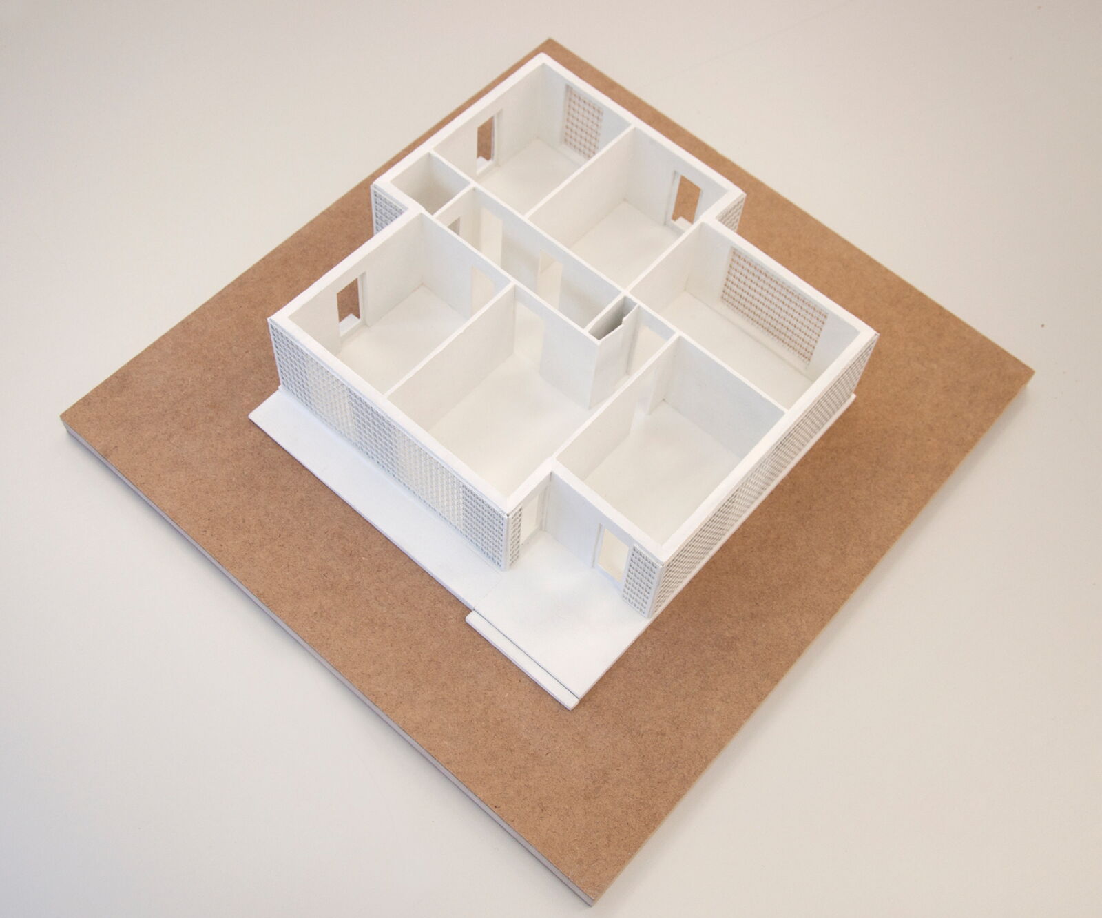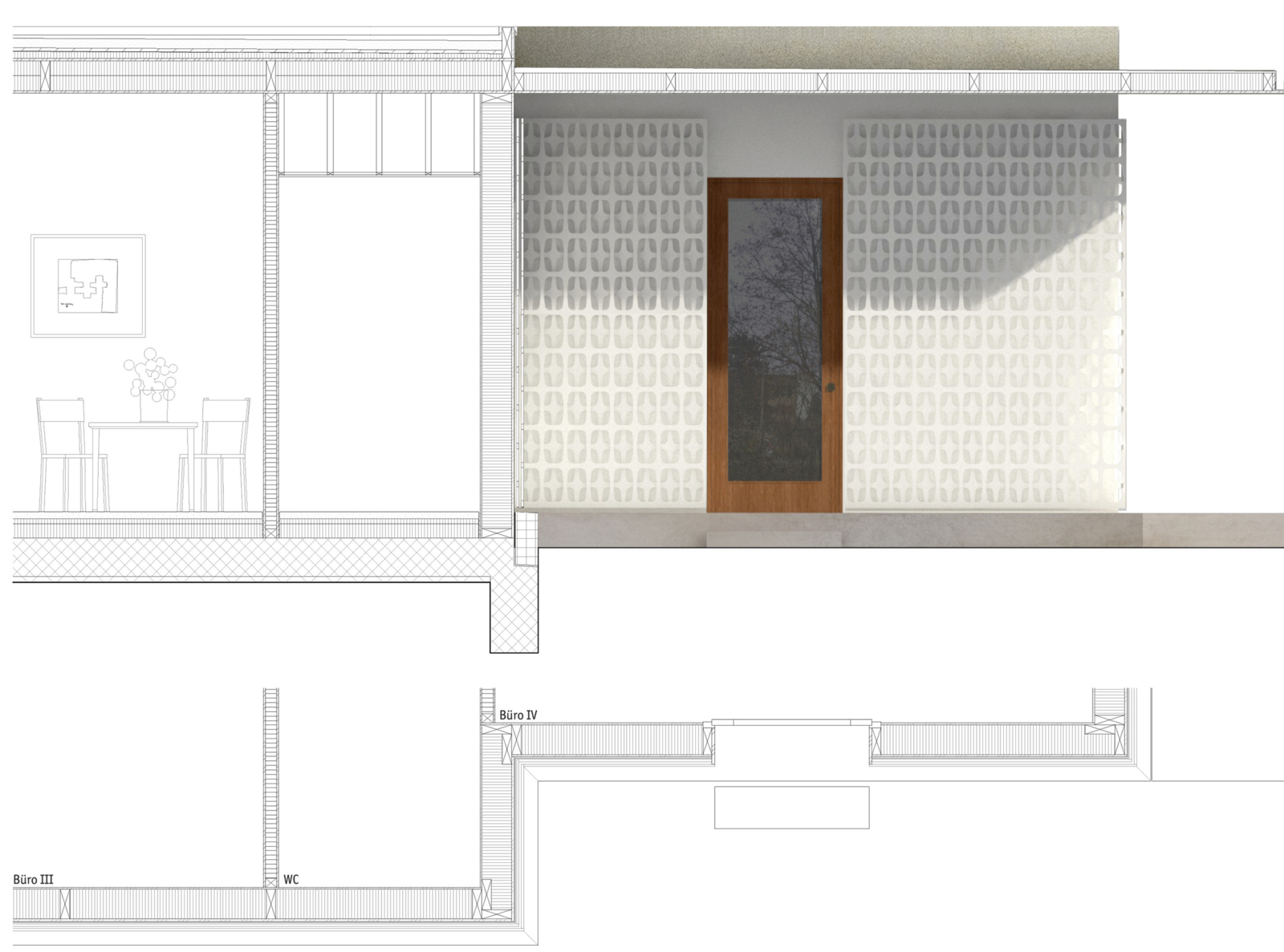 Der Pavillon ist als Holzelementbau vorgeschlagen. Damit sind ein gutes Raumklima, sehr gute Grauenergiewerte und eine sehr gute und schnelle Ausführung sichergestellt. Das Vordach schützt die perforierte Fassade: dank ihr kann nicht nur die Privatsphäre gewahrt werden, es entstehen auch angenehme Räume mit hoher Aufenthaltsqualität.