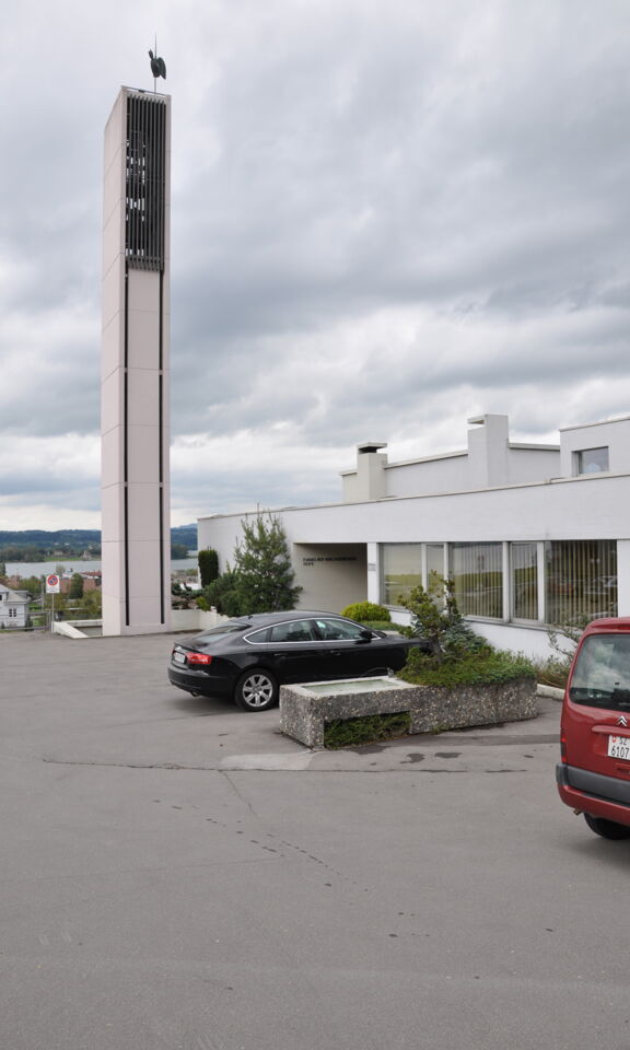 Das 43-jährige Kirchgemeindehaus, ein typischer Vertreter der späteren Moderne, erlebt der Besucher als Triptychon. Der hohe Turm, der flach gestreckte Gebäudekörper sowie das grossartige Panorama der Zürichsee-Landschaft wird plastisch durch das sorgfältig durchdachte Foyer verbunden.