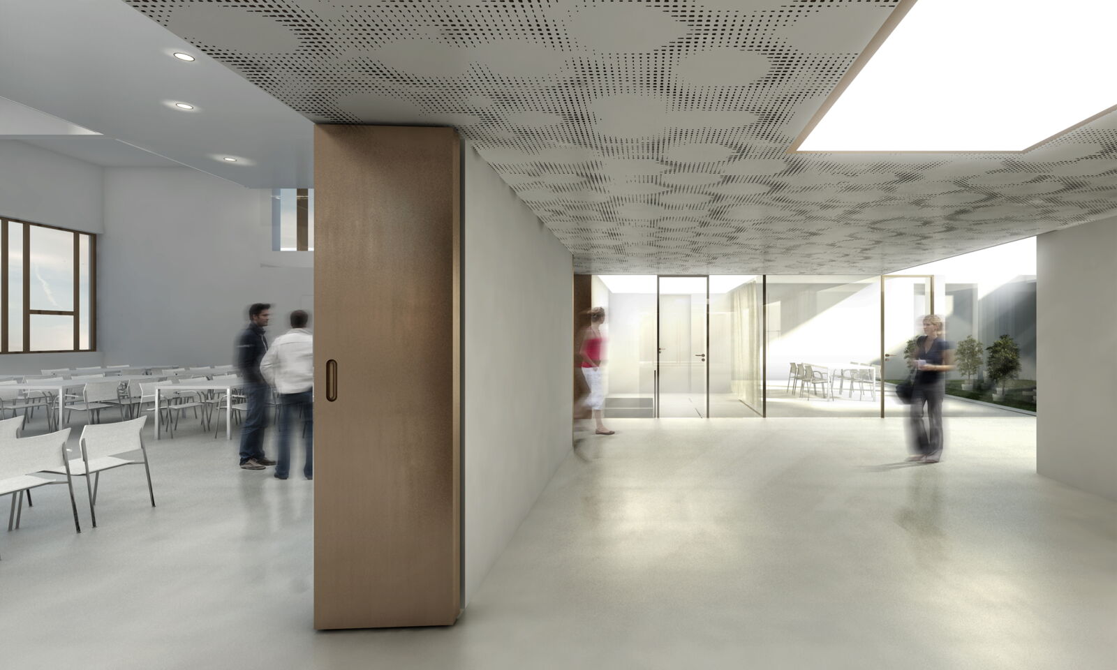 Das Foyer soll in seiner Grundform erhalten bleiben. Zur Verbesserung der Tageslichtqualität platzieren wir zentral über dem Foyer ein grosszügiges Oblicht. Die Eingänge der beiden Toilettenanlagen werden verdeckt und dazwischen mittig eine Nische für die Garderobe, abschliessbar mit einer Schiebetüre, eingeschoben.