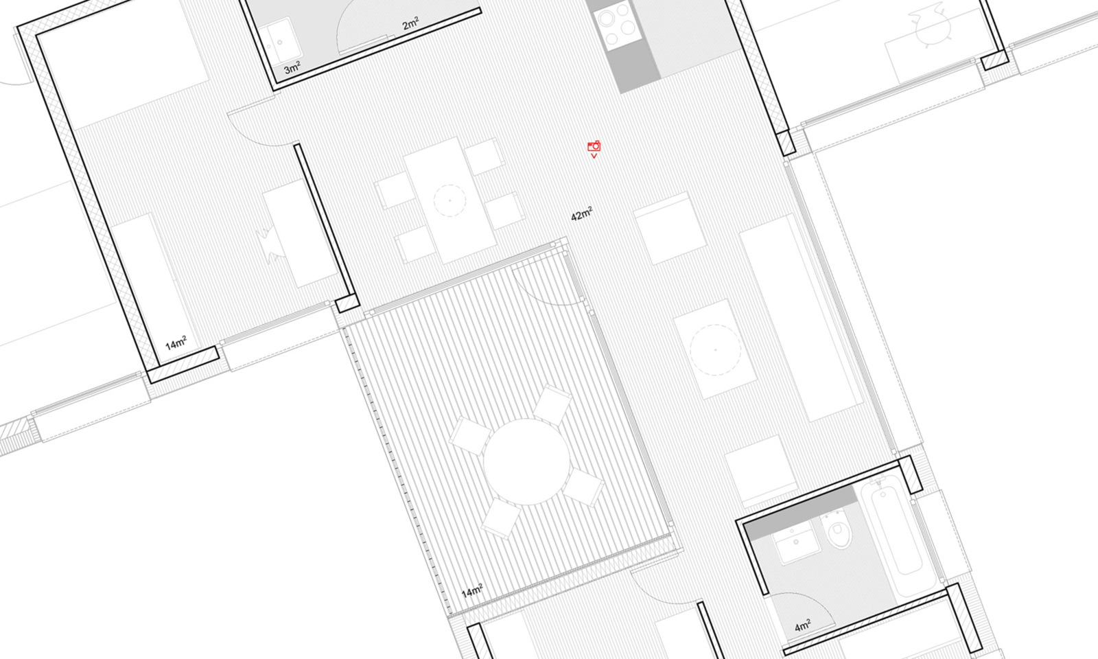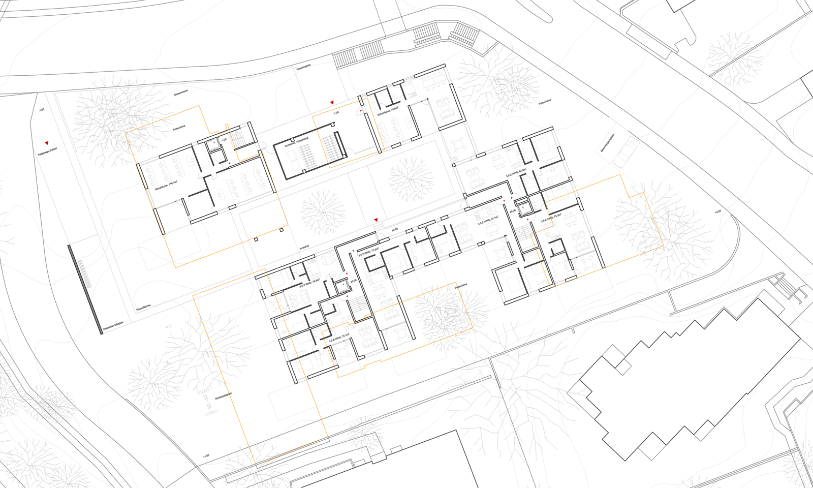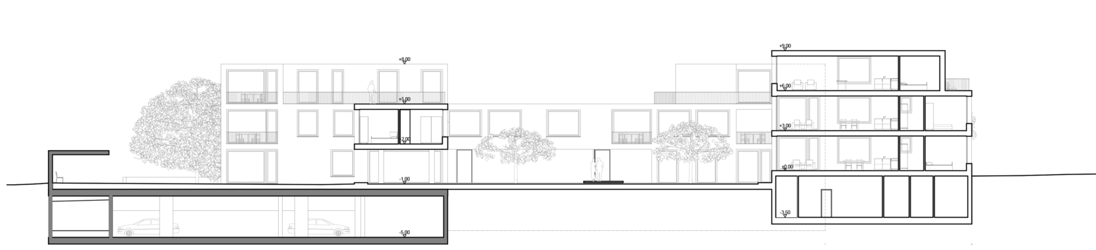 In Anlehnung an das Bebauungsmuster der Nachbarschaft wird ein neues Ensemble entwickelt welches aus vier einzelnen Häusern besteht. Eine bereits bestehende Tiefgarage wird weitergenutzt. Die Häuser werden durch ein klares Erschliessungssystem untereinander verbunden. Alle Wohnungen haben mindestens zwei Ausrichtungen und verfügen über grosszügige Aussenräume. Sie sind aufgrund ihrer Lage und ihres Zuschnitts für Familien attraktiv, der hofartige Aussenraum schirmt von der Strasse ab und definiert kindgerechte Aussenräume. Hindernisfreie Zugänge ermöglichen altersgerechtes Wohnen und rollstuhlgängige Erschliessung. Es besteht eine direkte Anbindung an die Stadt Zürich. Die Gebäude werden in Massivbauweise errichtet, der MINERGIE-Standard angestrebt. Durch die Verwendung von trennbaren Materialien, dem Einsatz von Recycling-Produkten und einer guten Tageslichtausnutzung wird den Anforderungen der Nachhaltigkeit Rechnung getragen.