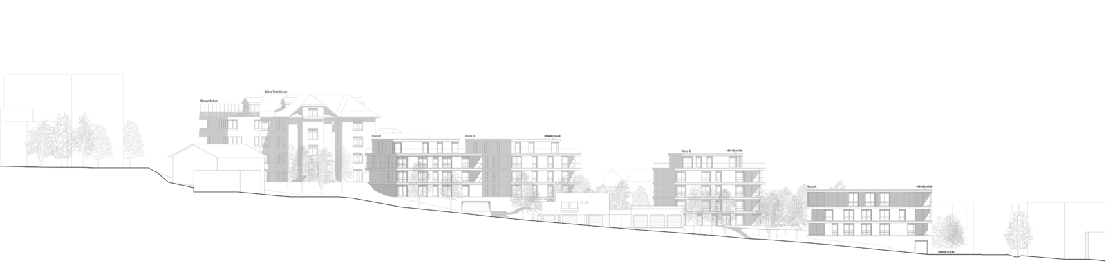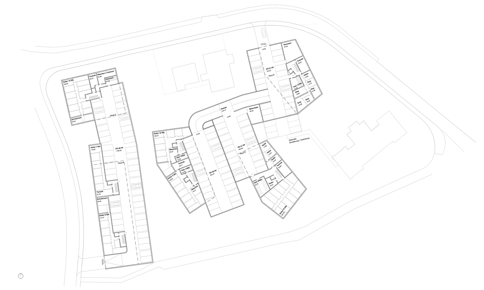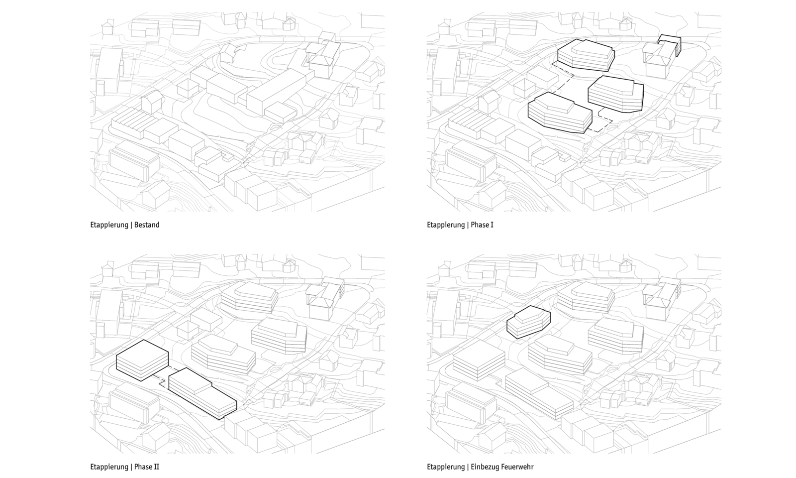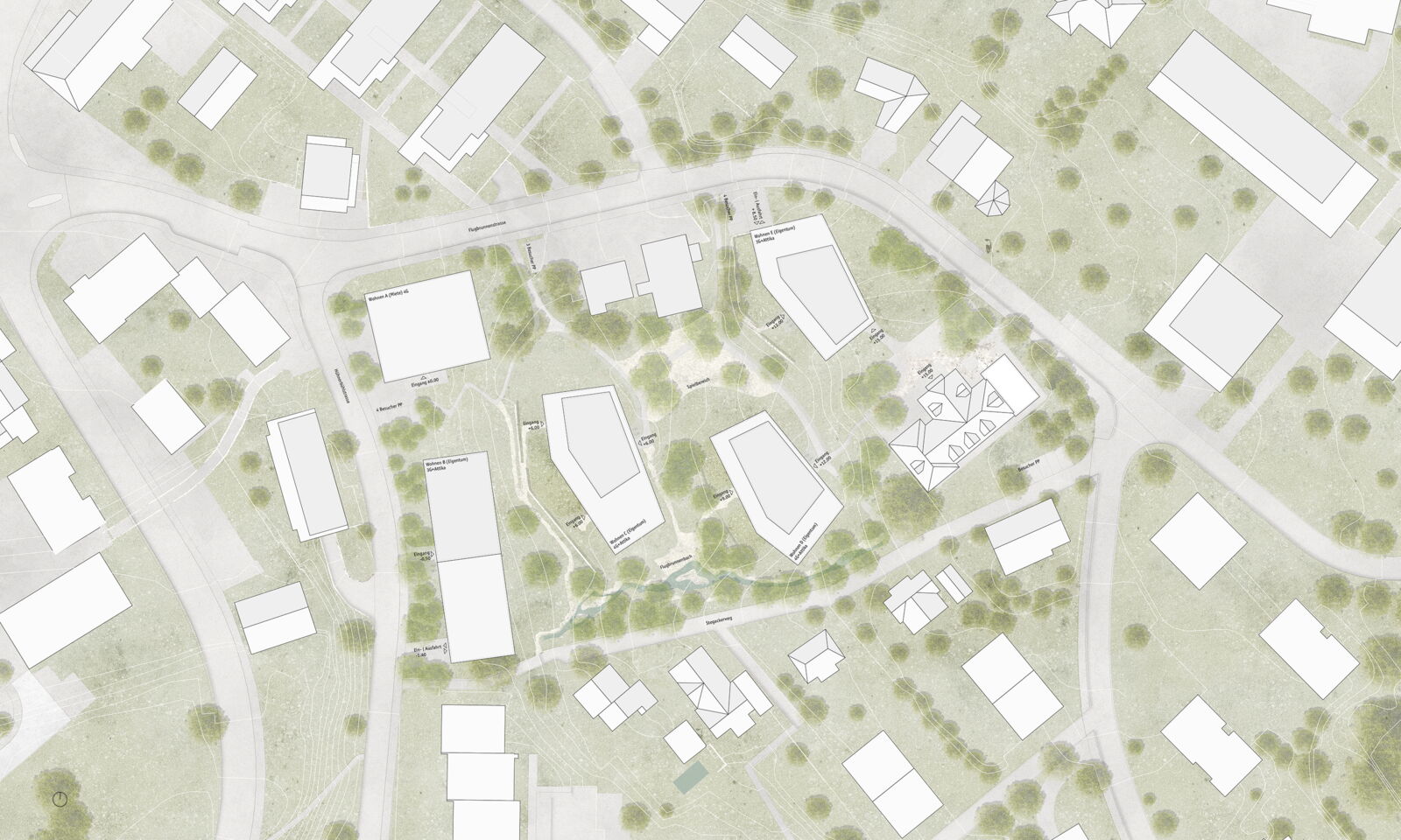 Die Bebauung des Flugbrunnenareals mit seiner Landfläche von rund 13'500 m2 stellt einen markanten Eingriff in den Siedlungskörper von Bolligen dar. Zu Gunsten einer angemessenen Integration in das Ortsbild schlagen wir ein Spektrum von unterschiedlichen Baukörpern, Gebäudehöhen und eine Vielfalt an funktionalen Aussenräumen vor. Die Bebauung besteht aus den drei Teilen «Ersatzneubauten», «Polygone» und «Schule». Die Neubauten reagieren ortsbaulich auf ihre jeweilige Lage. Die Ausrichtung der Bauten mit parallelen Fassaden zu den Strassenräumen und die Akzentuierung mit Baumgruppen entlang der Ränder definieren die Siedlung.