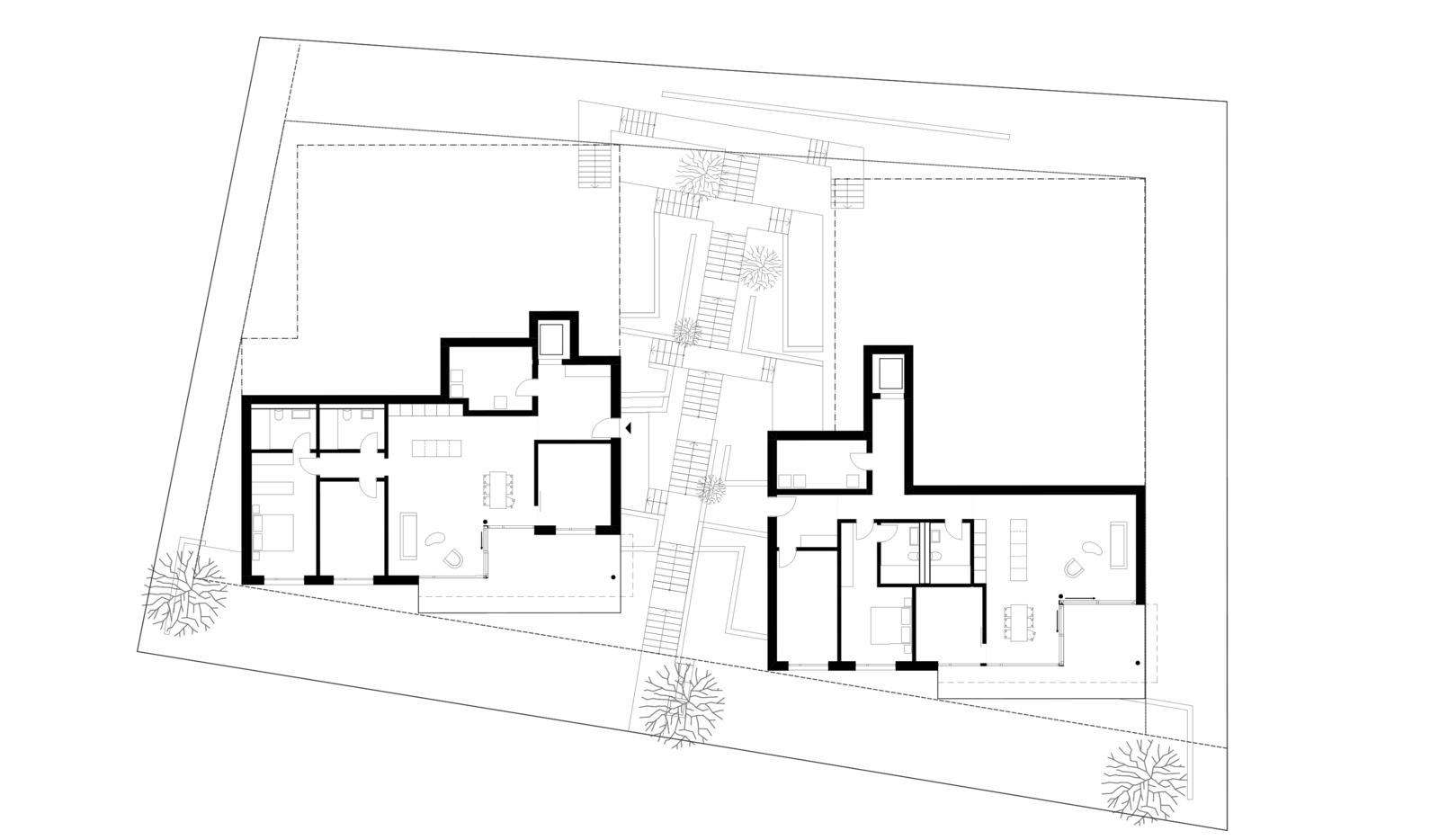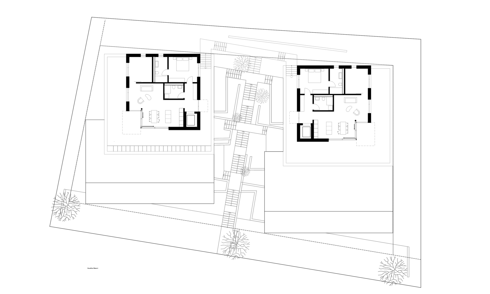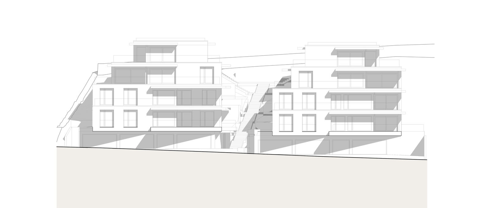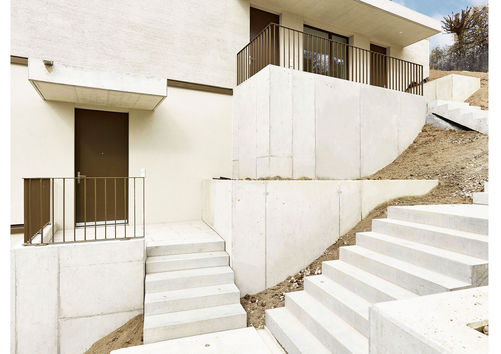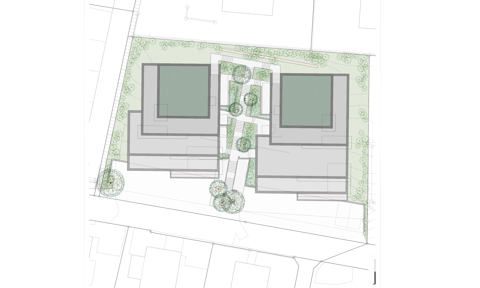 Als Erschliessung windet sich zwischen den beiden Häusern eine Kaskadentreppe mit dichter Bepflanzung. Eine Baumgruppe definiert die Adressierung.