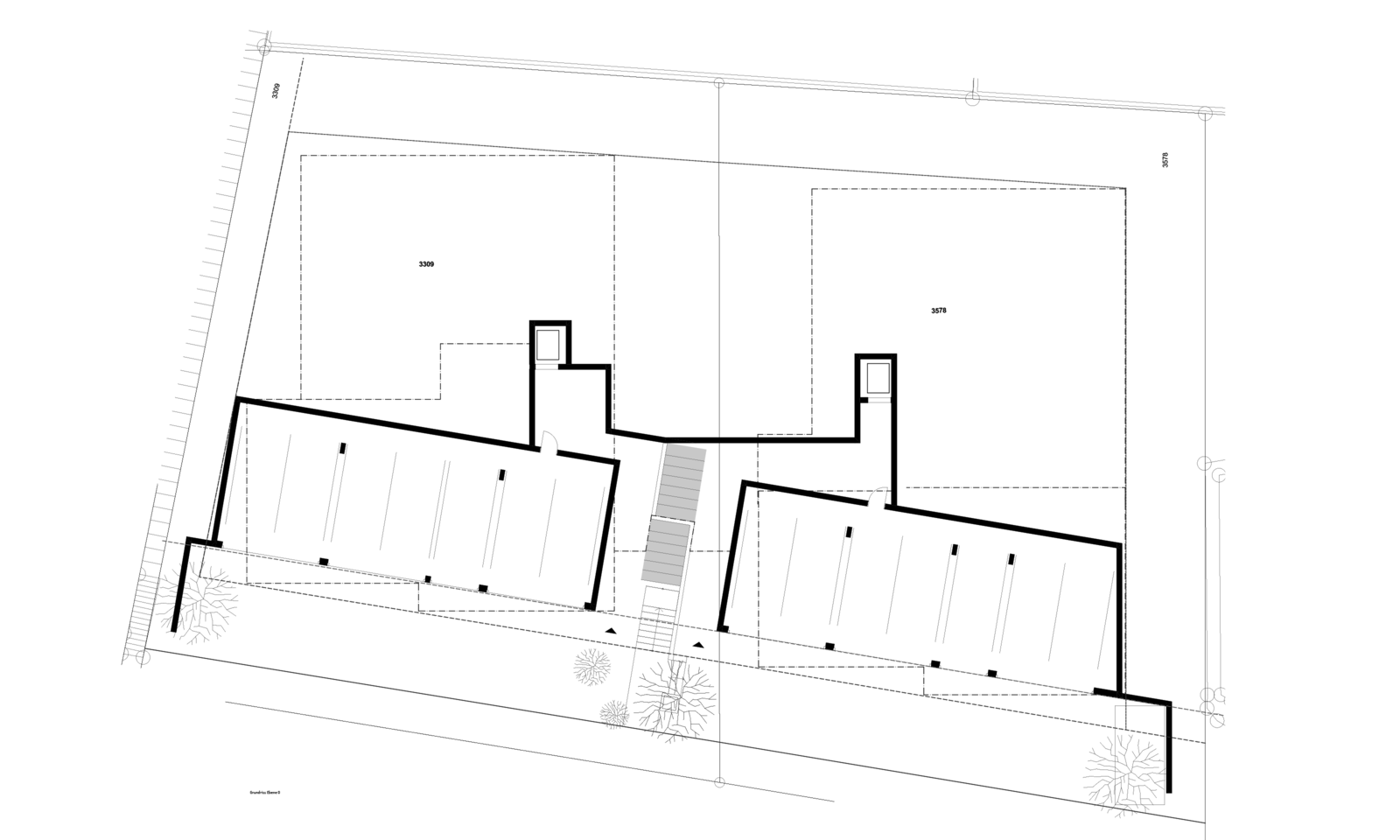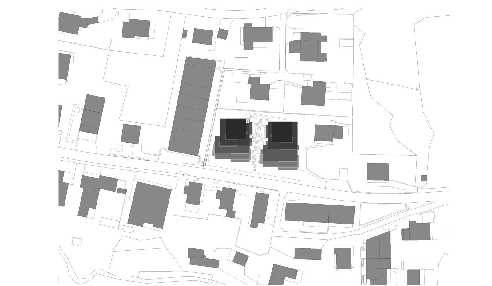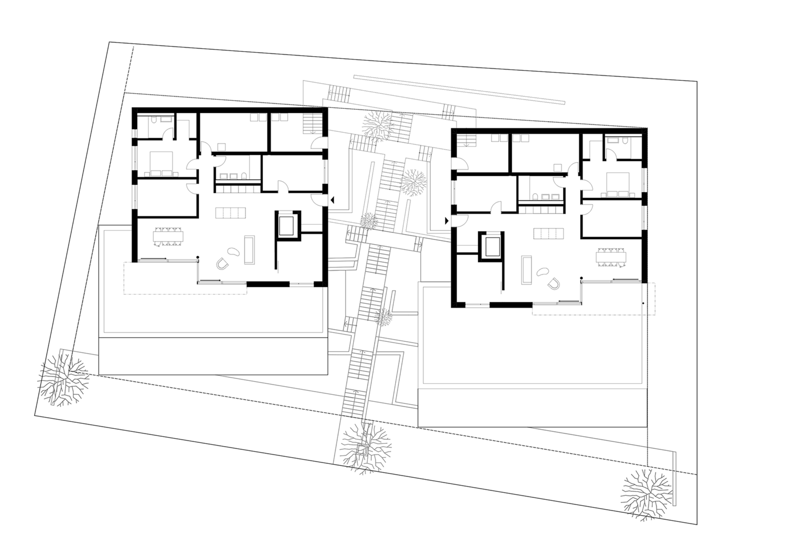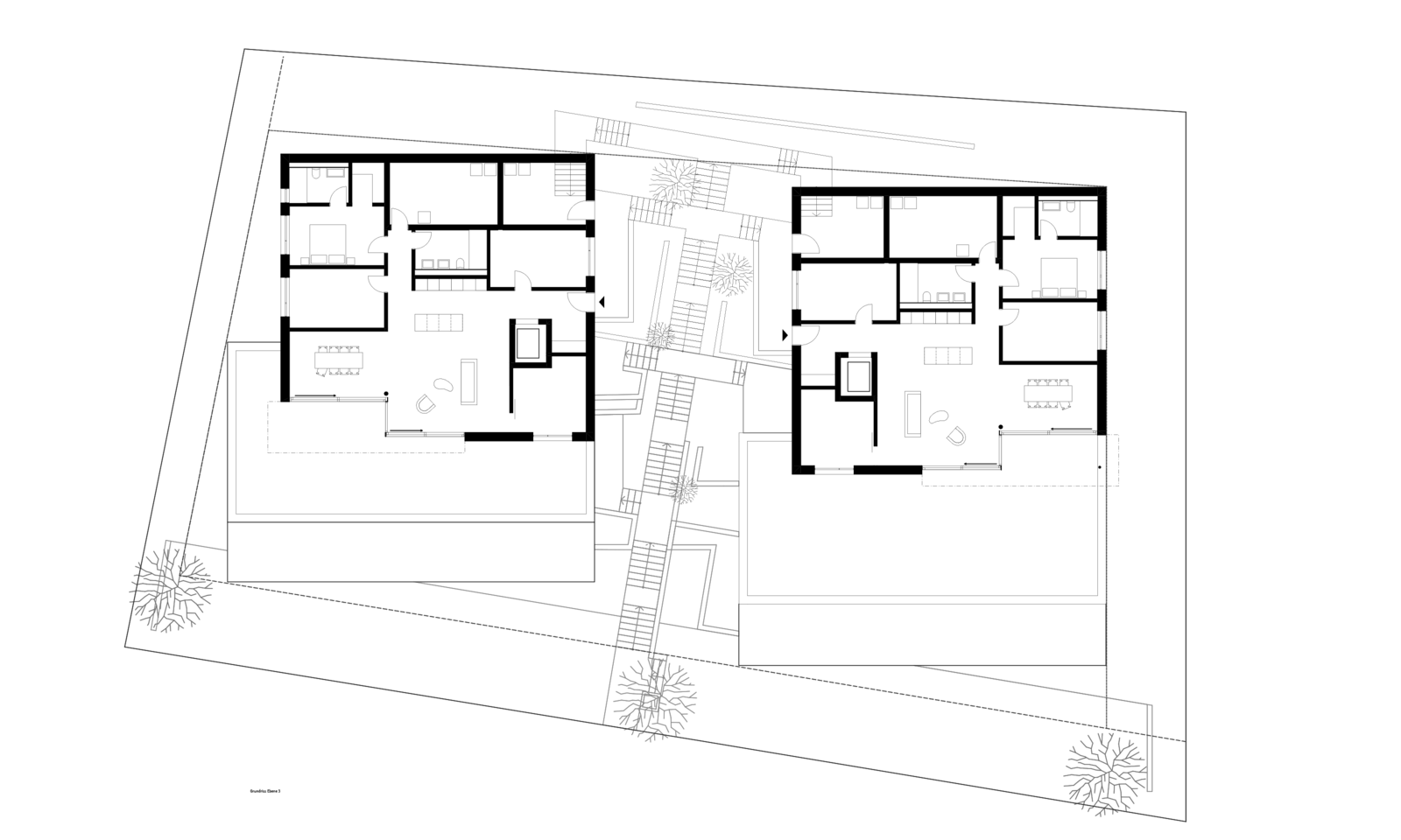 Als Erschliessung windet sich zwischen den beiden Häusern eine Kaskadentreppe mit dichter Bepflanzung. Eine Baumgruppe definiert die Adressierung.