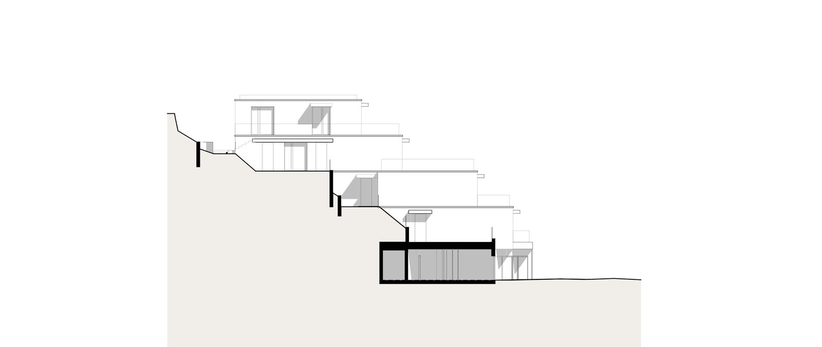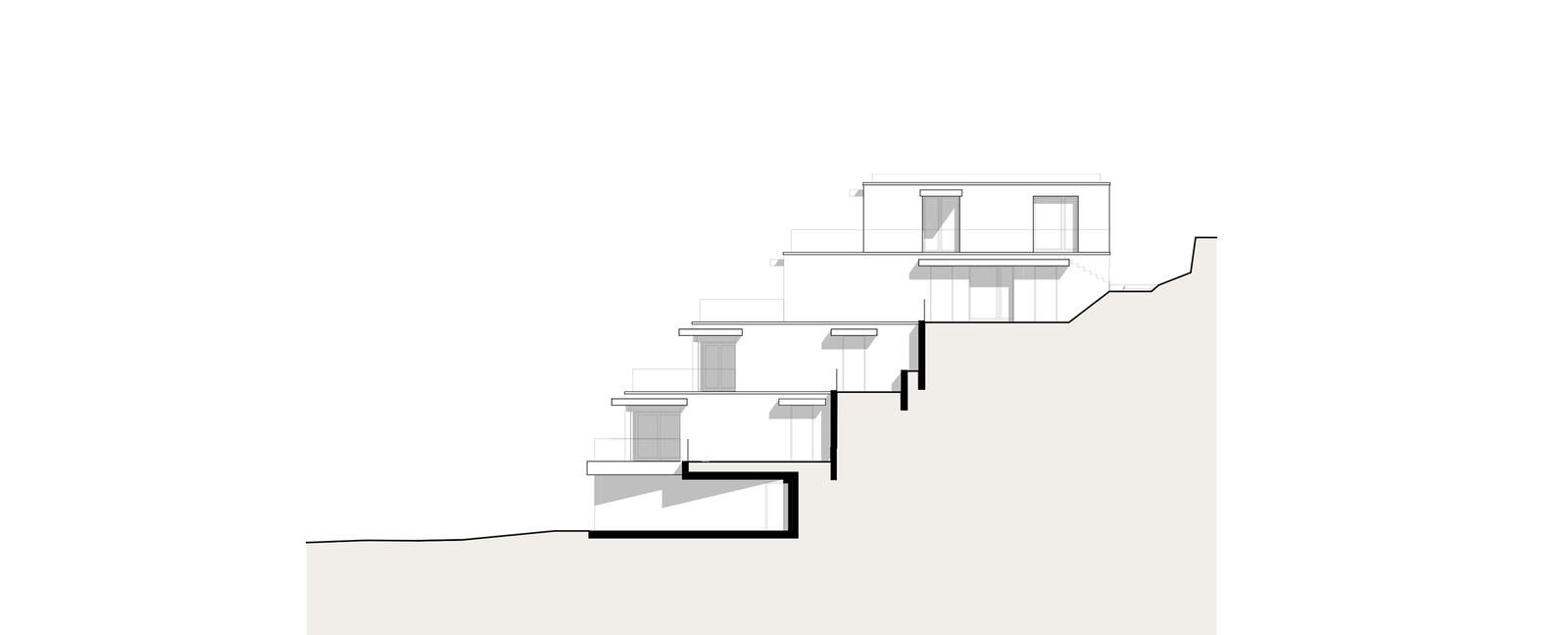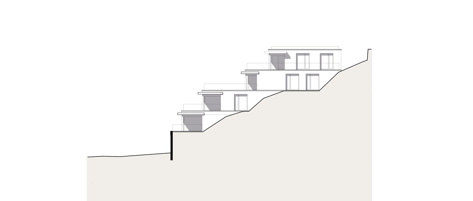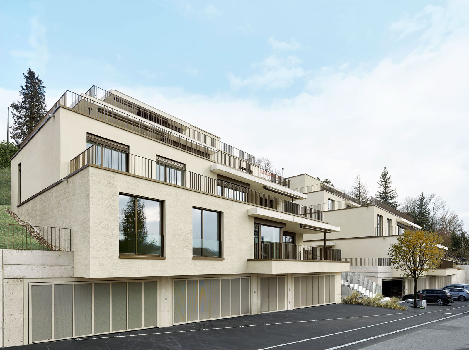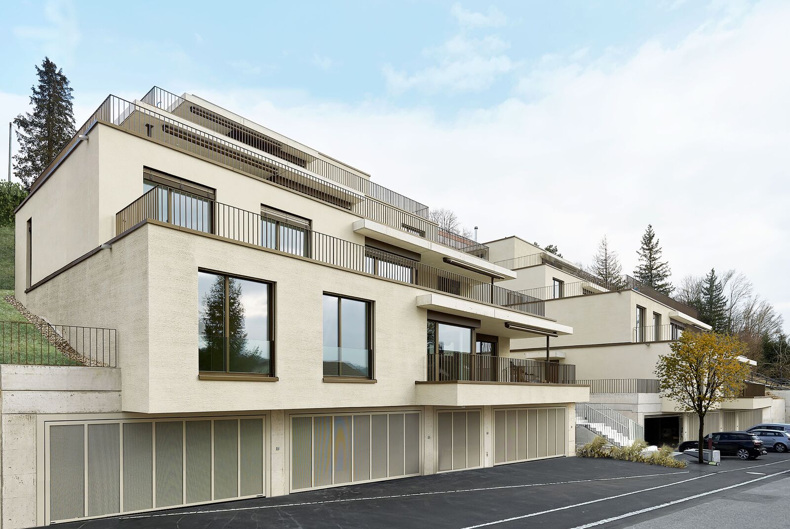 Die zwei Wohnbauten, welche sich von der Grösse her an den umliegenden Häusern orientieren, sind sorgfältig in den Hang eingepasst. Das Sockelgeschoss mit Garage orientiert sich parallel zur Strasse; die darüberliegenden Wohngeschosse wurden leicht gedreht angeordnet. Die Gebäude sind in mehrere Richtungen gestaffelt, die Schachtelstruktur wird durch eine horizontale Gliederung verstärkt. Die Ausrichtung der Hauptfassade nach Westen sorgt für viel Licht in den Wohn- und Schlafräumen.