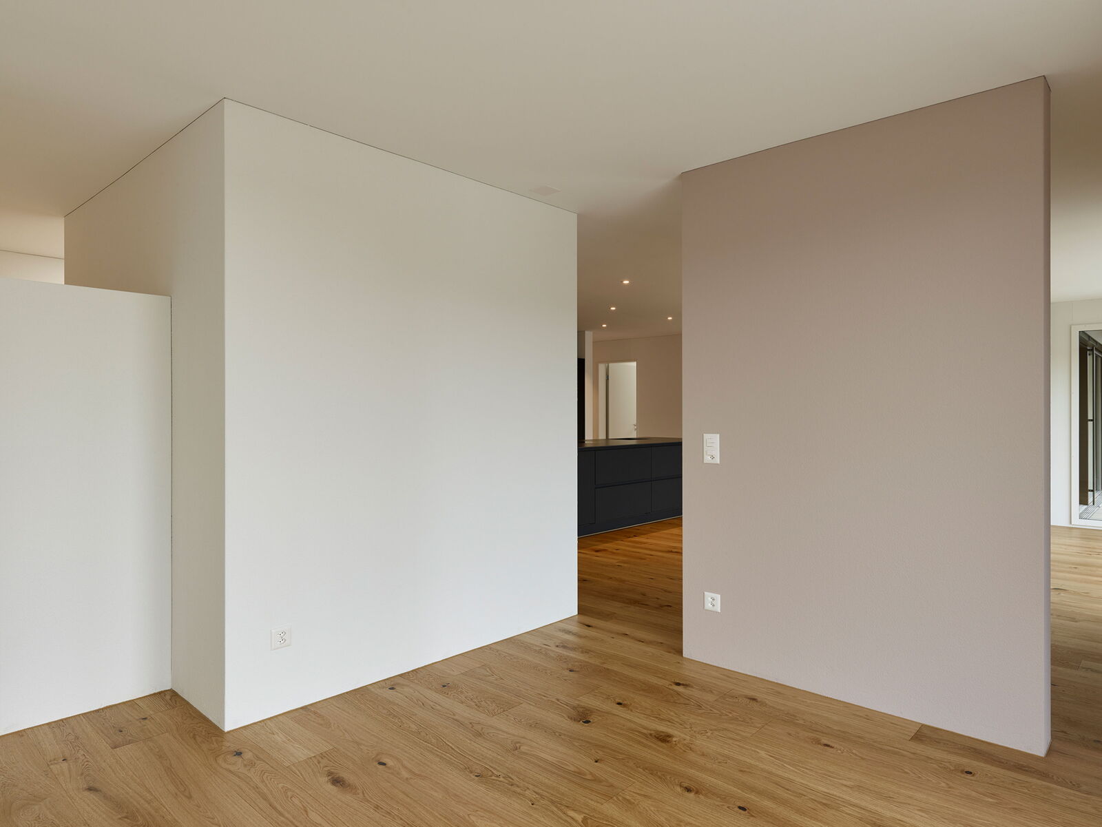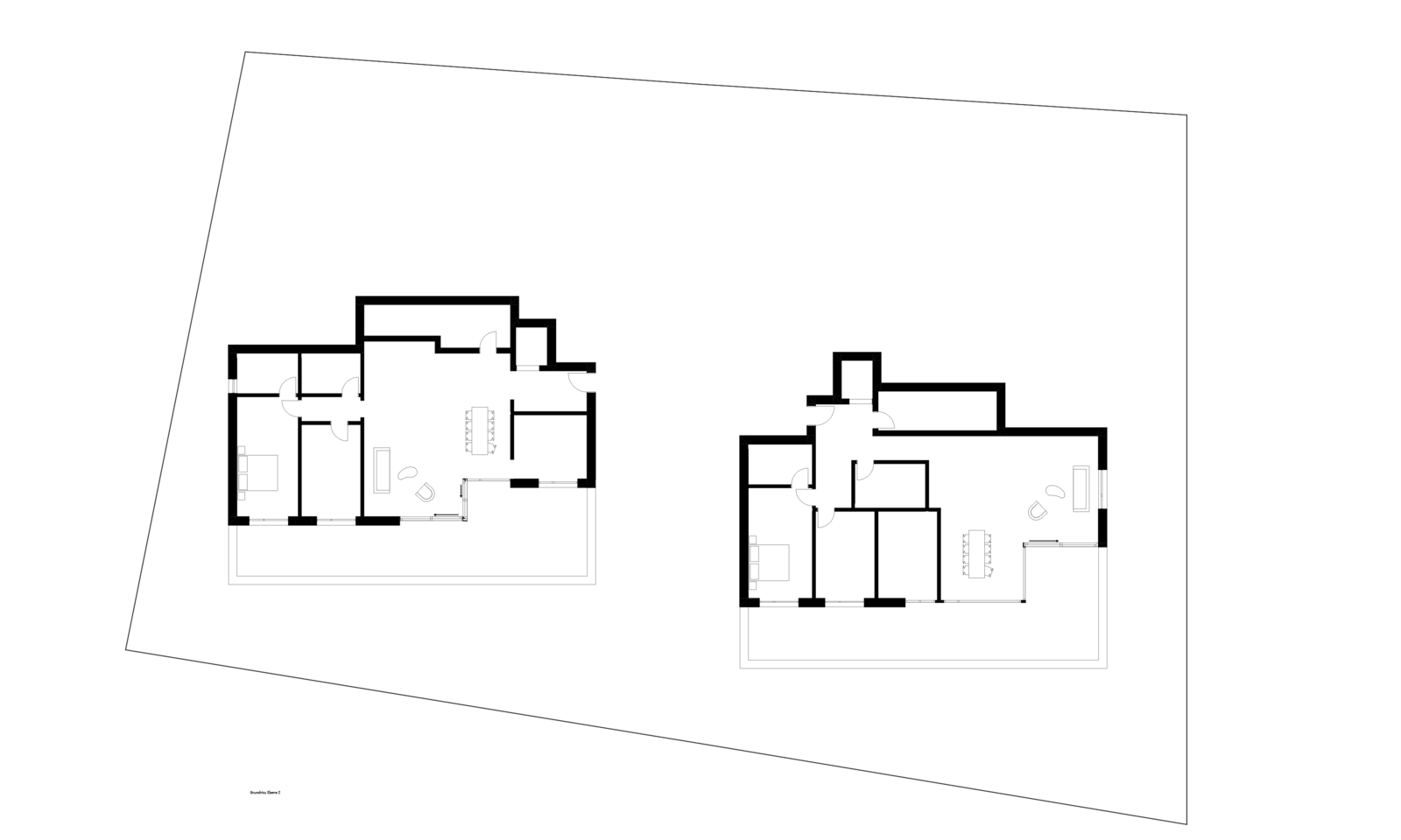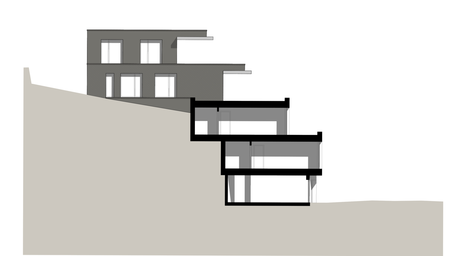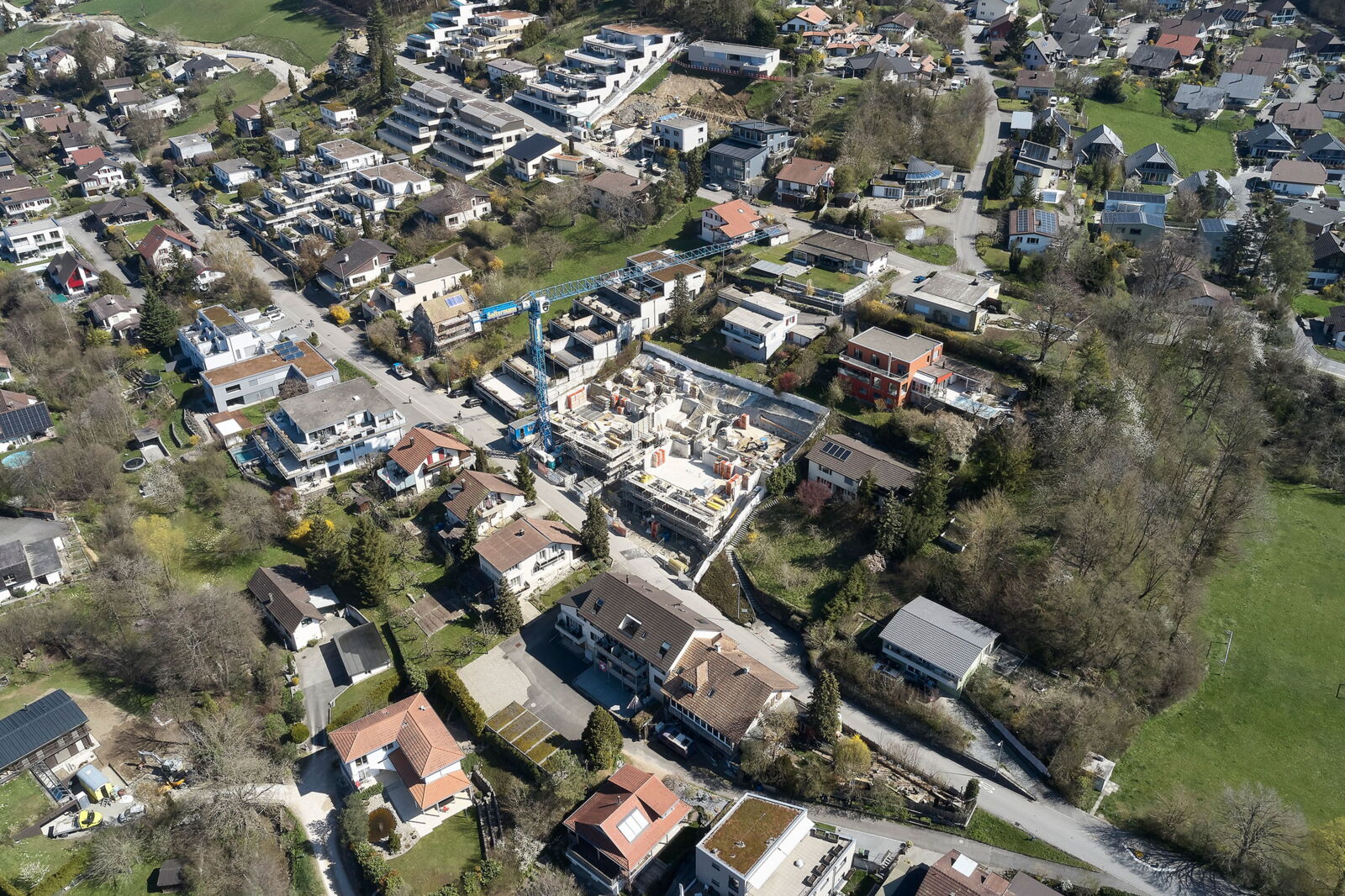 Die zwei Wohnbauten, welche sich von der Grösse her an den umliegenden Häusern orientieren, sind sorgfältig in den Hang eingepasst. Das Sockelgeschoss mit Garage orientiert sich parallel zur Strasse; die darüberliegenden Wohngeschosse wurden leicht gedreht angeordnet. Die Gebäude sind in mehrere Richtungen gestaffelt, die Schachtelstruktur wird durch eine horizontale Gliederung verstärkt. Die Ausrichtung der Hauptfassade nach Westen sorgt für viel Licht in den Wohn- und Schlafräumen.