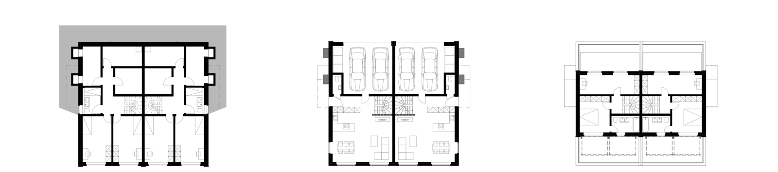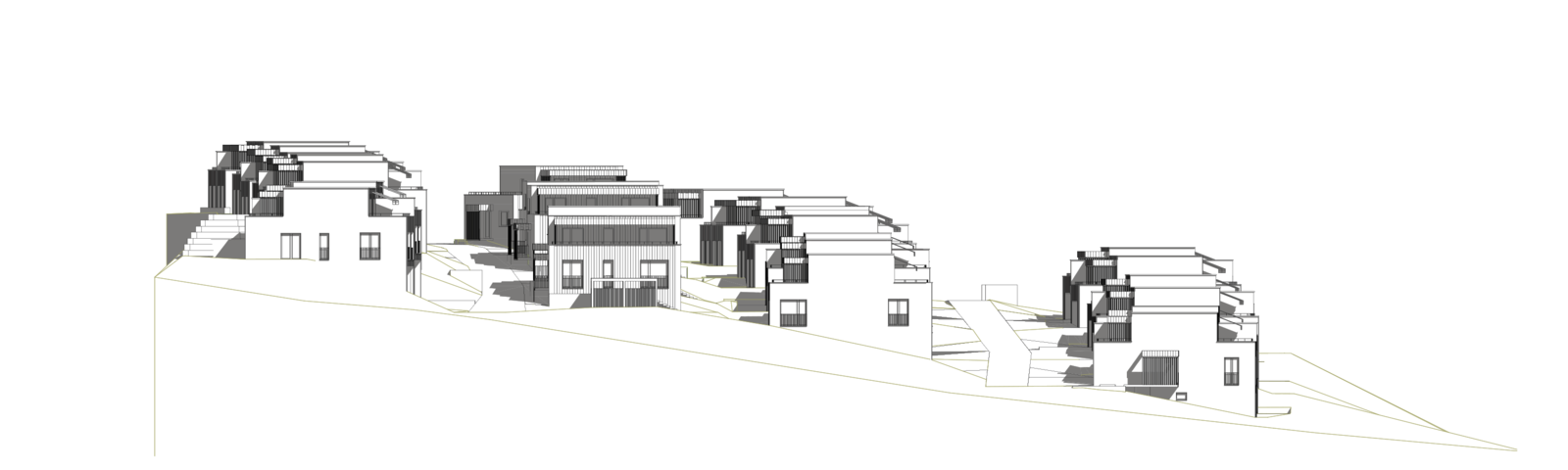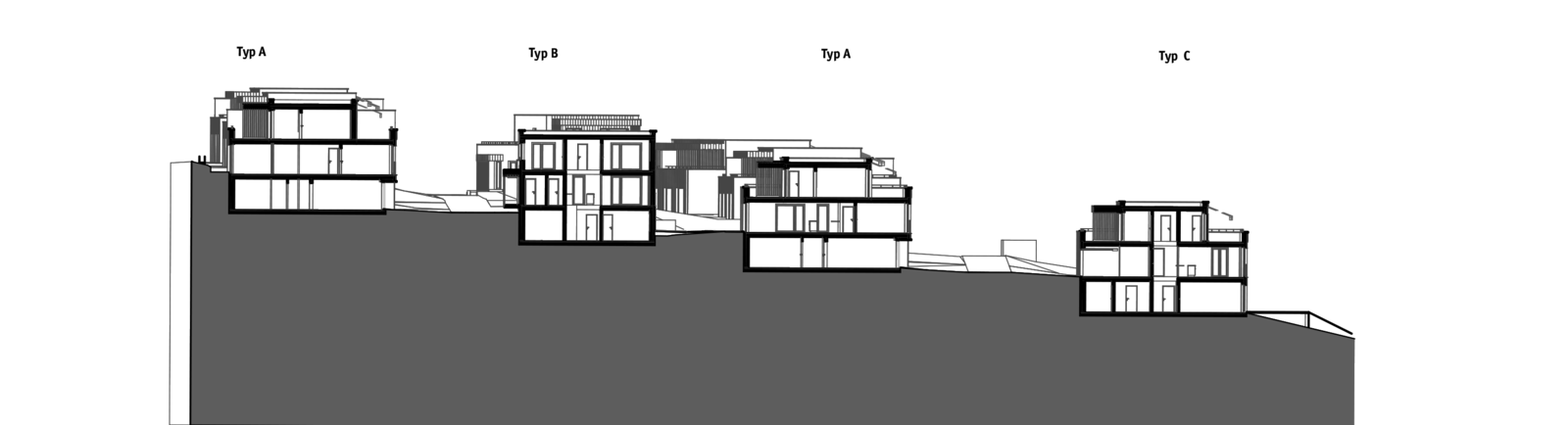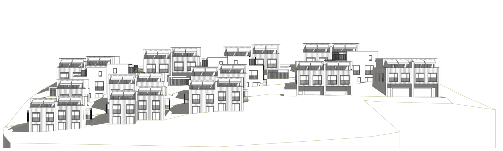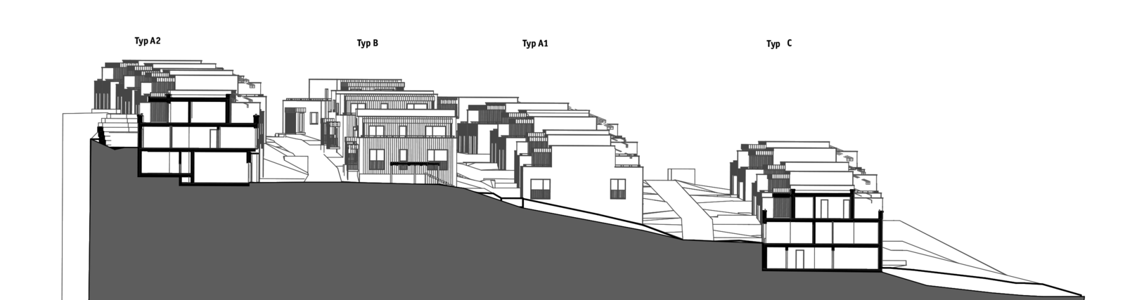 Die Überbauung konzipiert sich aus vier dem Hang folgenden Häuserreihen, die insgesamt eine niedrige, aber dichte Bebauung ergeben. Die Wohntypologie von DEFH ist die Reaktion auf die heutigen Bedürfnisse nach Selbstbestimmung, privaten Rückzugsmöglichkeiten sowie eigenen Grünraum. Jede Haushälfte verfügt über private Garten- und Terrassenflächen sowie eine eigene Zufahrt mit Parkierung, teils im Sockelgeschoss teils in eigenen Carports.