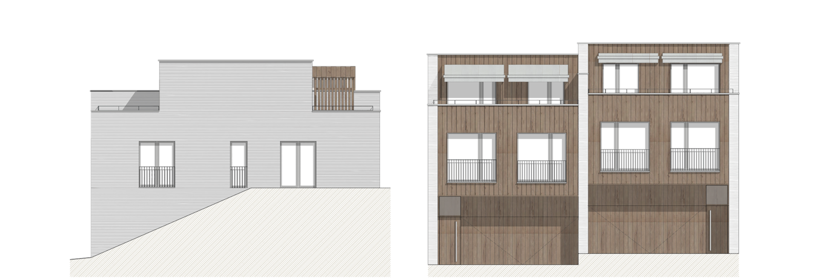 Thematisch wird die Staffelung in der Materialisierung aufgegriffen. Die Ost- und Westseite der Volumina bestehen aus einer geschlossenen Holzfassade, die anderen Seiten zeigen eine Putzfassade mit Besenstrichoptik. Durch Scheibenelemente wird der Kontrast des Materialwechsels zwischen den Fassadenseiten akzentuiert.