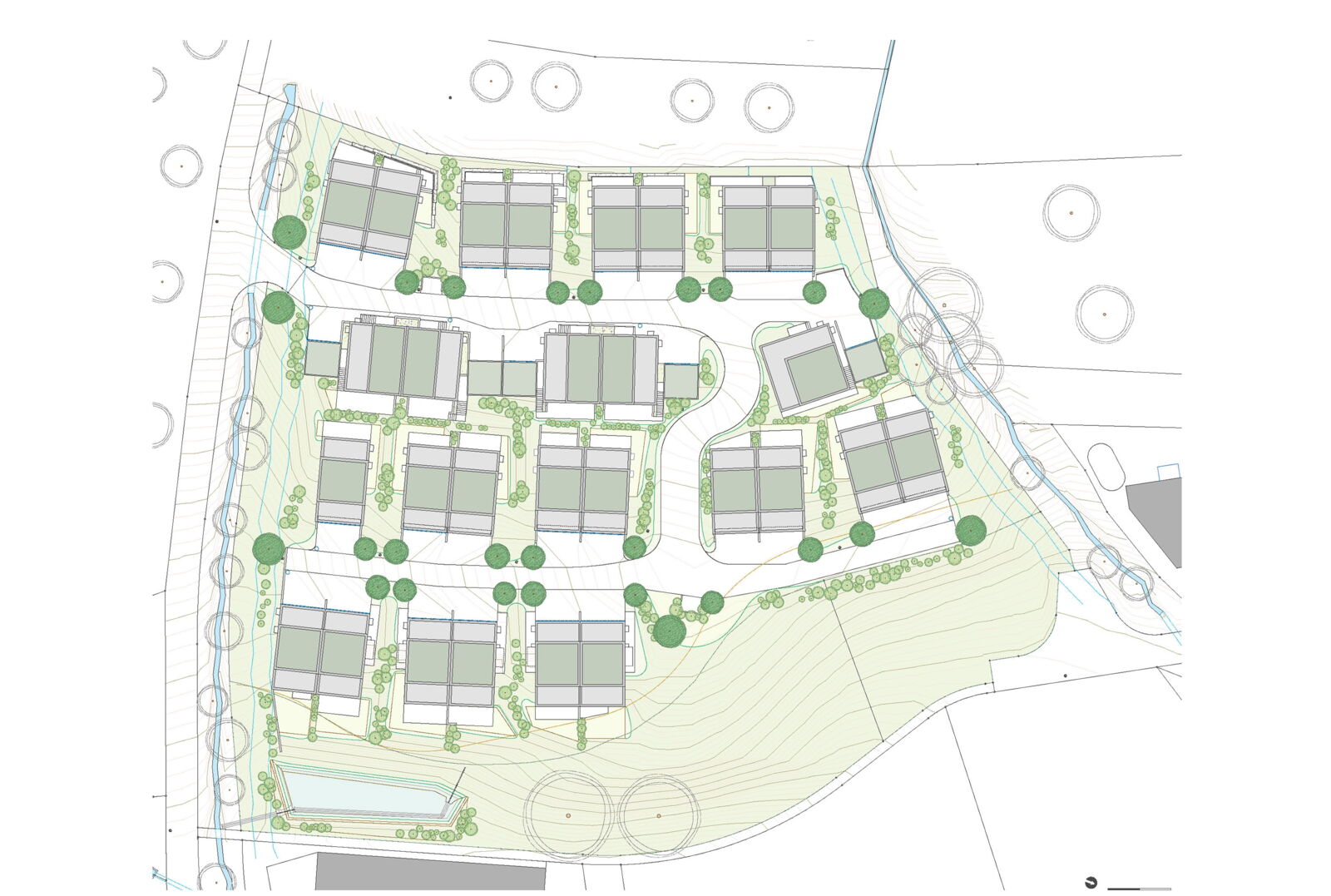 Am südlichen Eingang von Thürnen, BL, planen wir eine Siedlung mit 13 DEFH und 2 EFH als Wohneigentum. Die 11’787 m2 grosse, Richtung Osten orientierte, Parzelle liegt an ruhiger Hanglage und grenzt an eine geschützte Grünzone. Sie bietet eine unverbaubare Aussicht auf die Umgebung. An der Süd- und Nordgrenze der Parzelle verlaufen jeweils zwei kleine Bäche.
