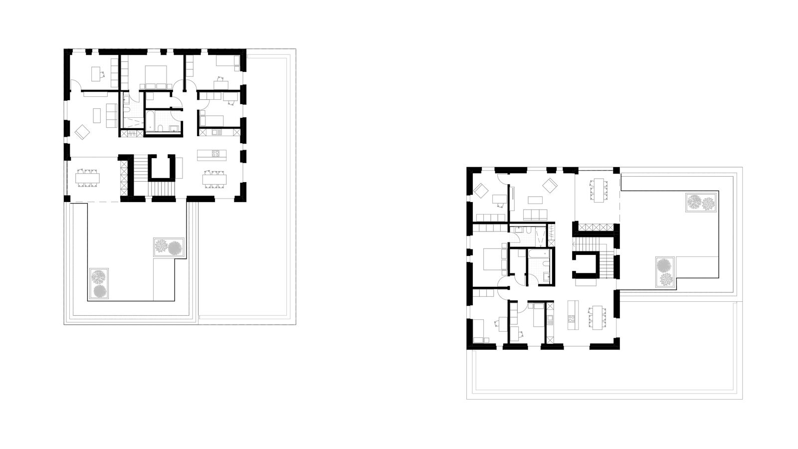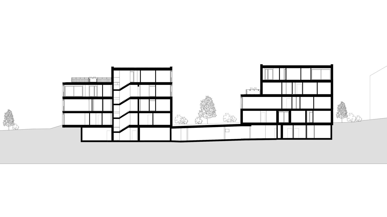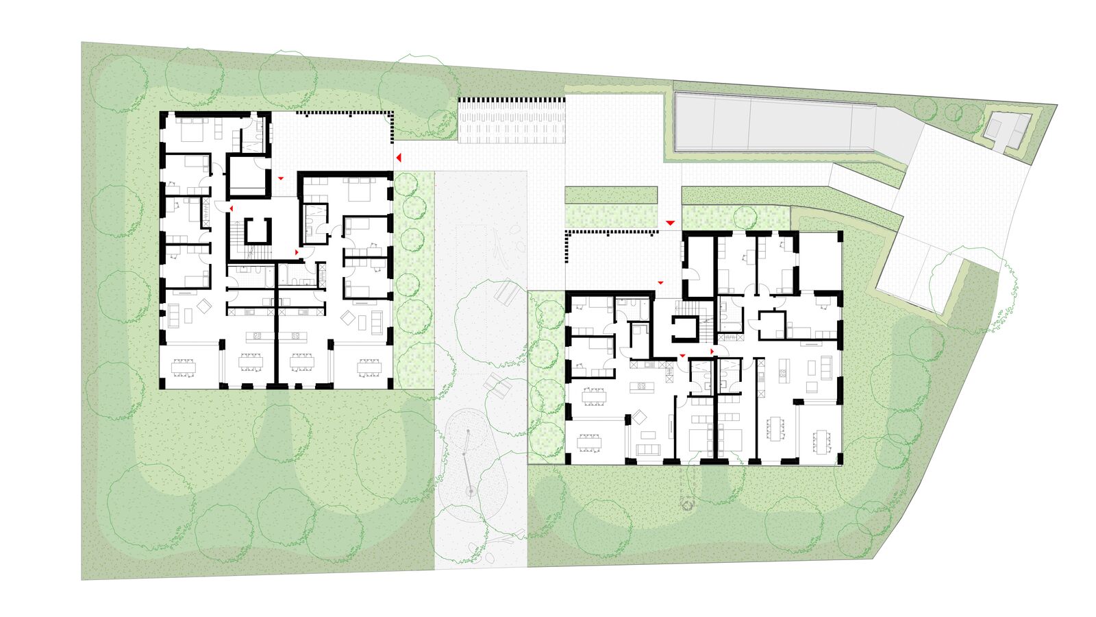 Mit der Reduktion auf zwei eher punktförmige Gebäude ergeben sich auch durchlaufende Aussenraum- und Sichtbeziehungen.