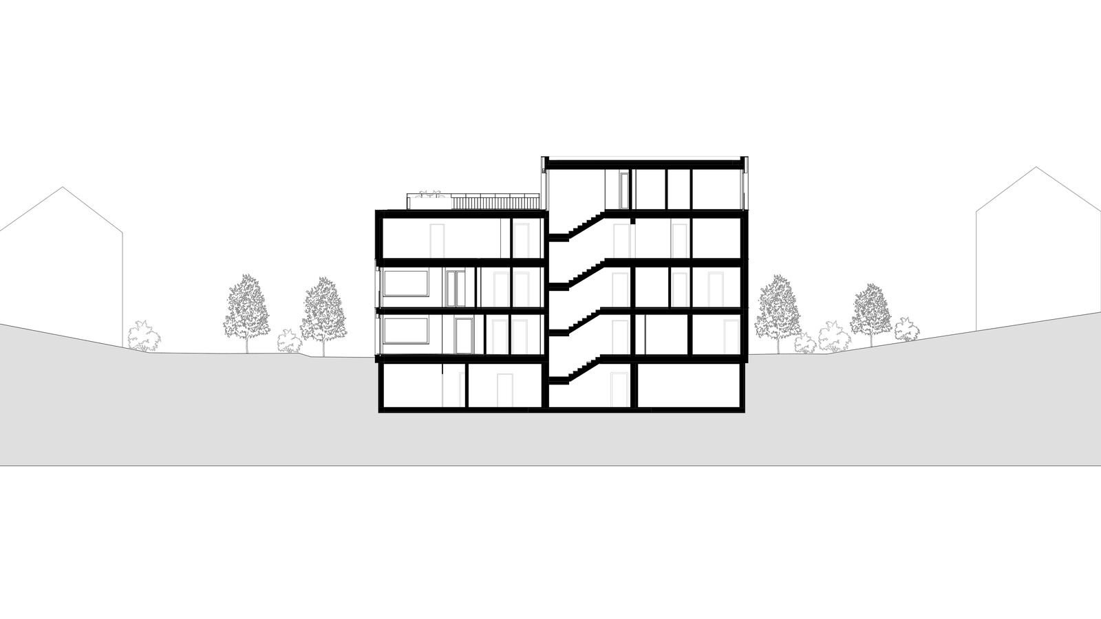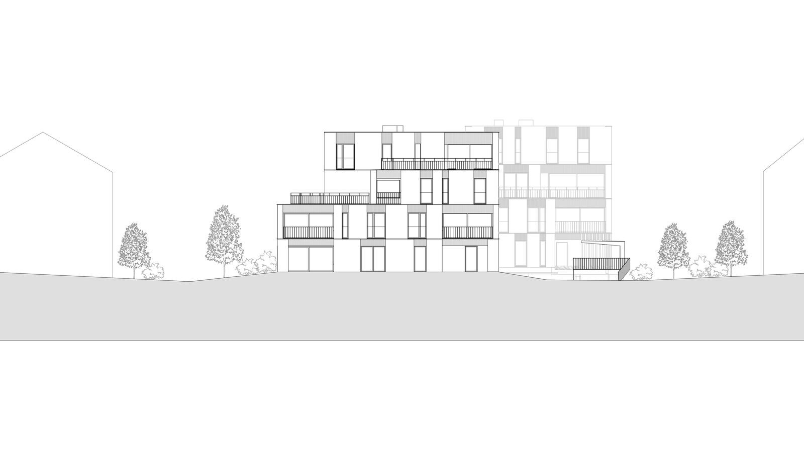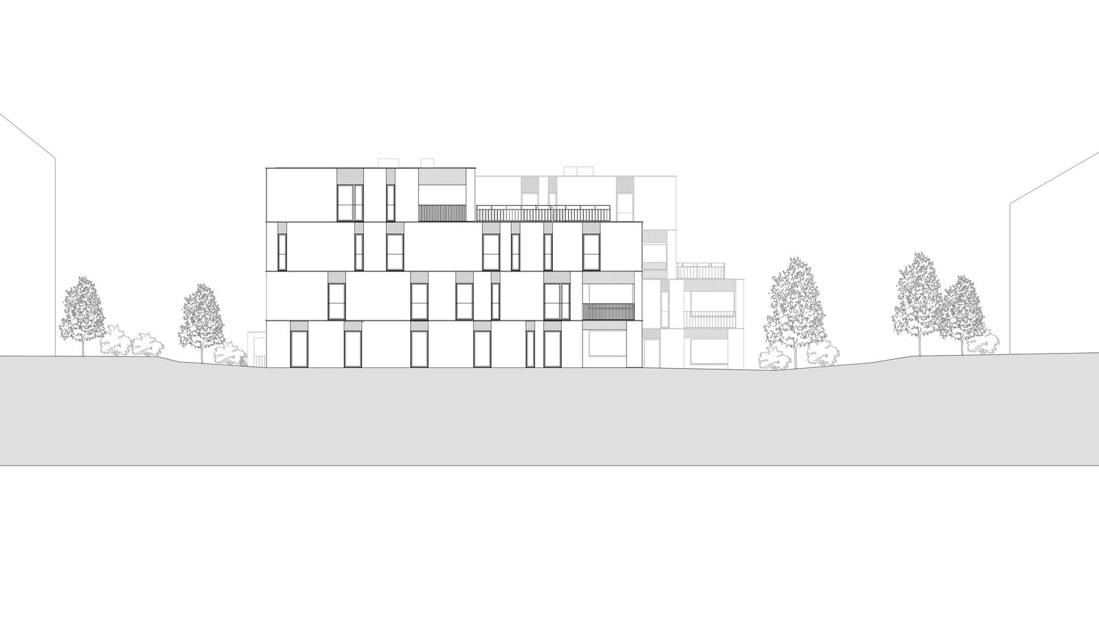 Die zwei geplanten Mehrfamilienhäuser fügen sich gut in den örtlichen Kontext ein indem die annähernd quadratischen Grundrisse angemessener Körnigkeit bringen. Zur optimierten Einordnung sind die beiden Neubauten in der Höhe gestaffelt. Die jeweils zweiten und dritten Obergeschosse sind reduziert, was eine interessante und unaufdringlich wirkende Volumetrie ergibt. Lediglich je ein Teil der Nord- und der Ostfassaden sind viergeschossig.