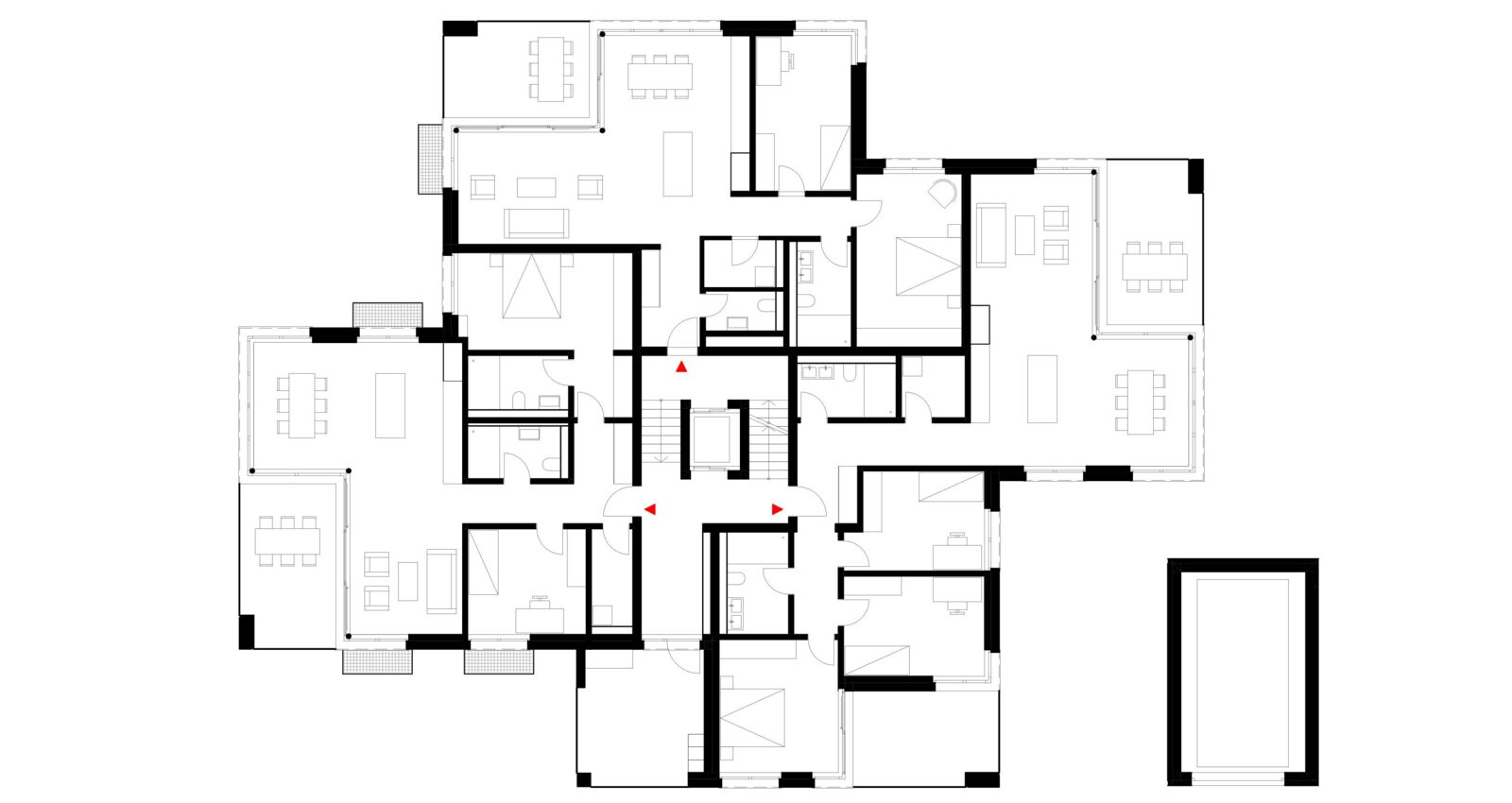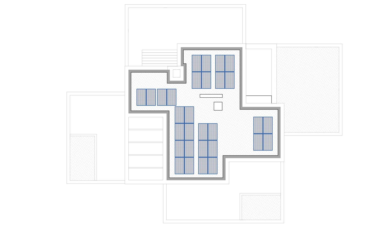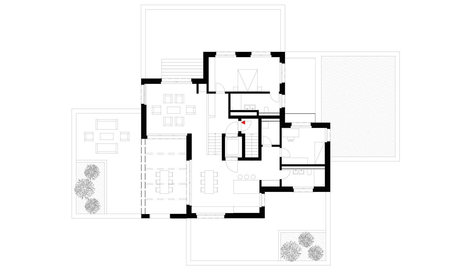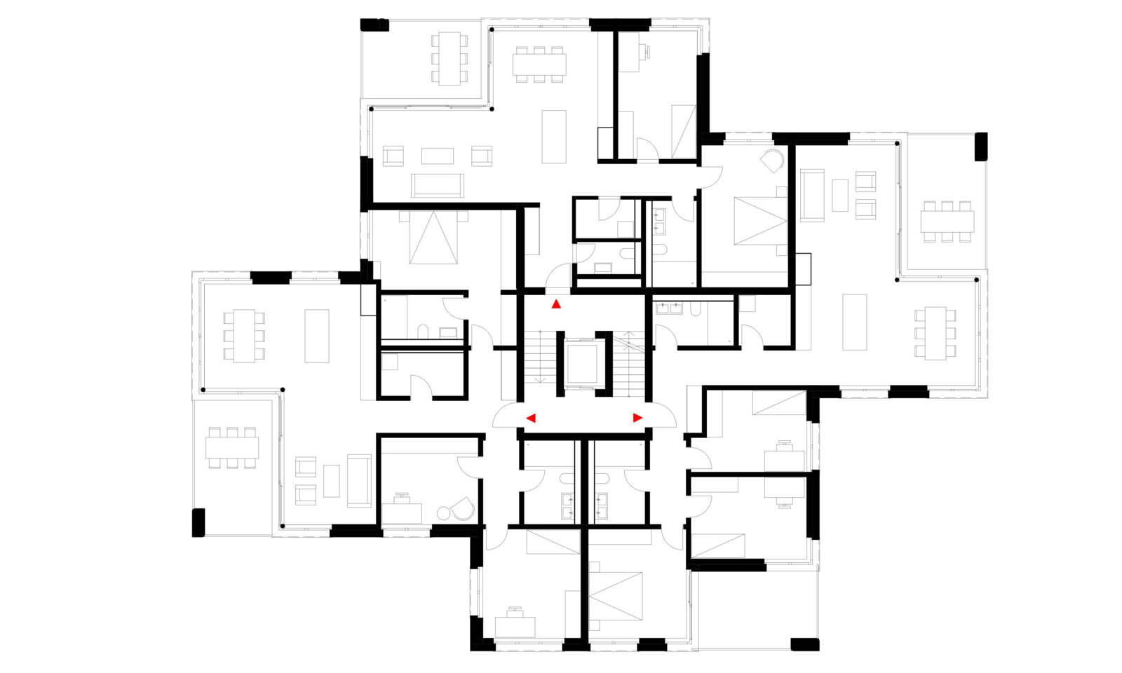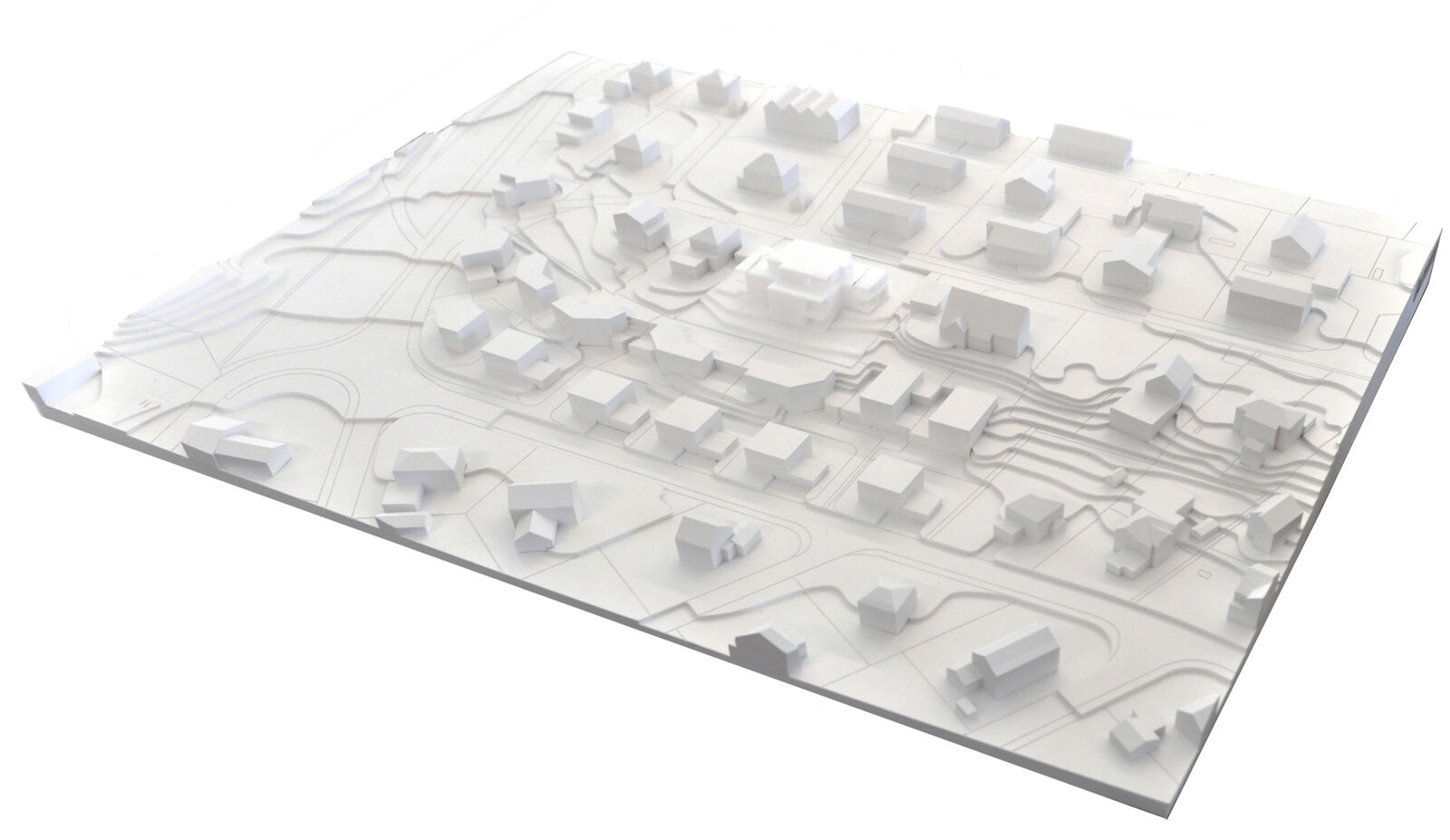 Der Neubau wird als zweigeschossiges, windmühlenförmig angelegtes Volumen mit vier an die Kernerschliessung angedockten Flügeln gestaltet. Durch diese Anordnung entstehen unterschiedliche Tiefen, die dem Gebäude einen Ausdruck von einem kleineren Volumen geben. Diese Ausgestaltung des Gebäudes unterstützt die Eingliederung ins Quartierbild.