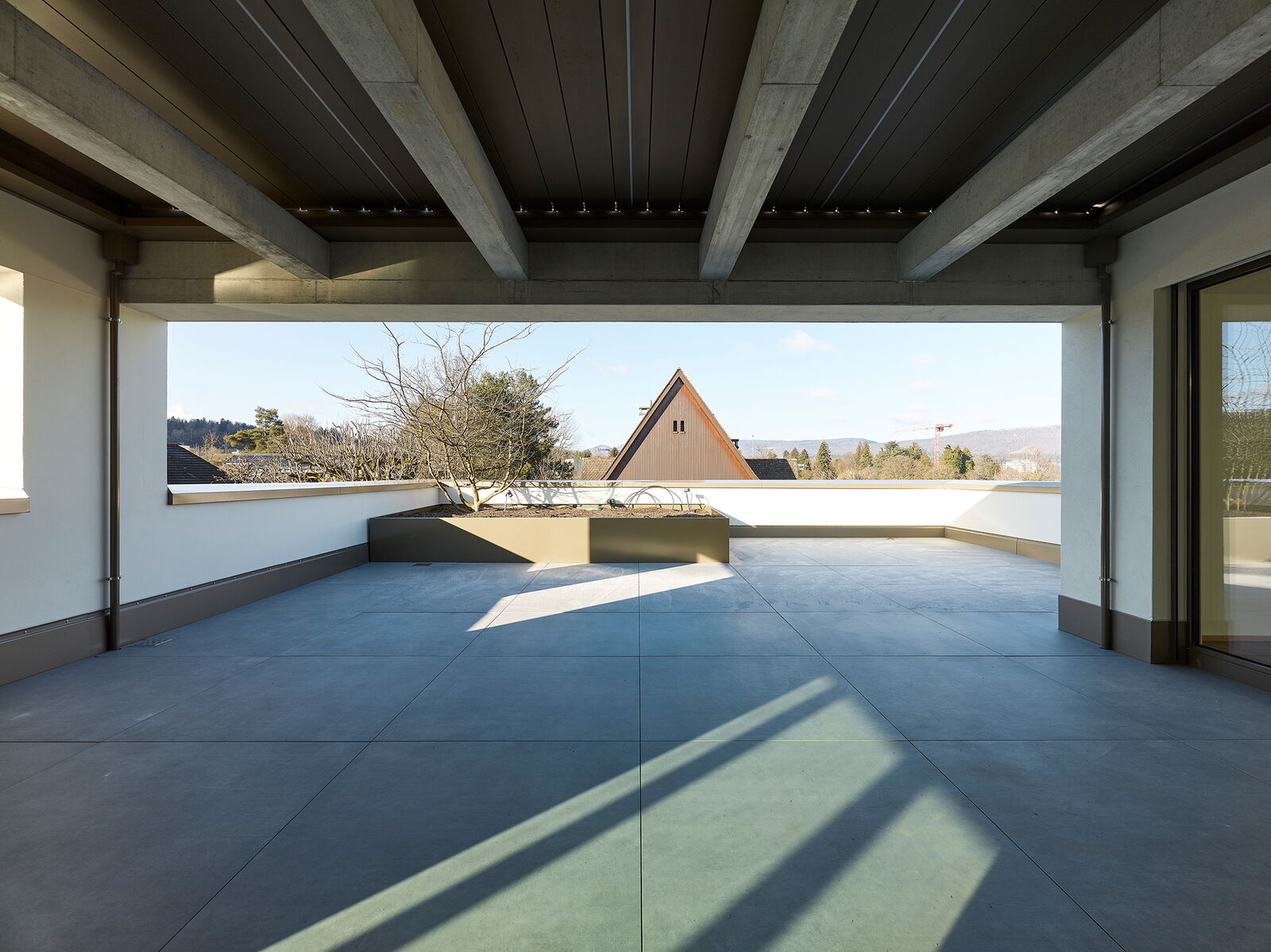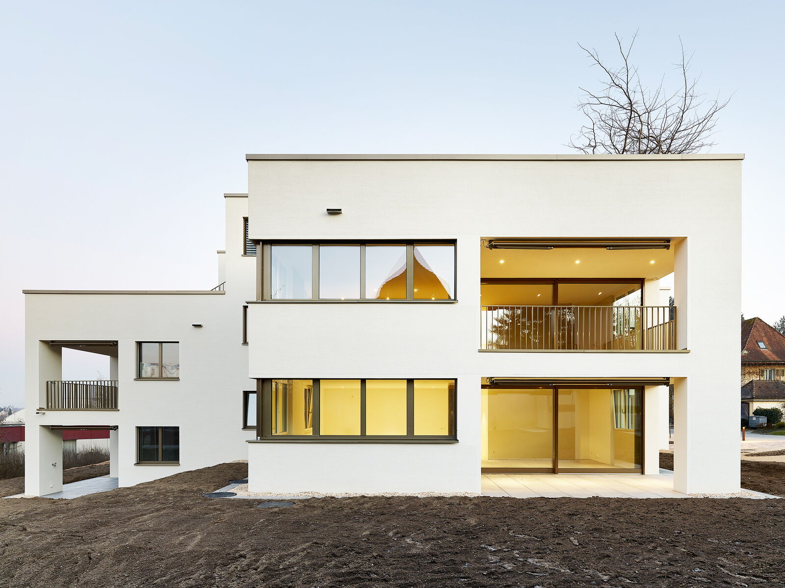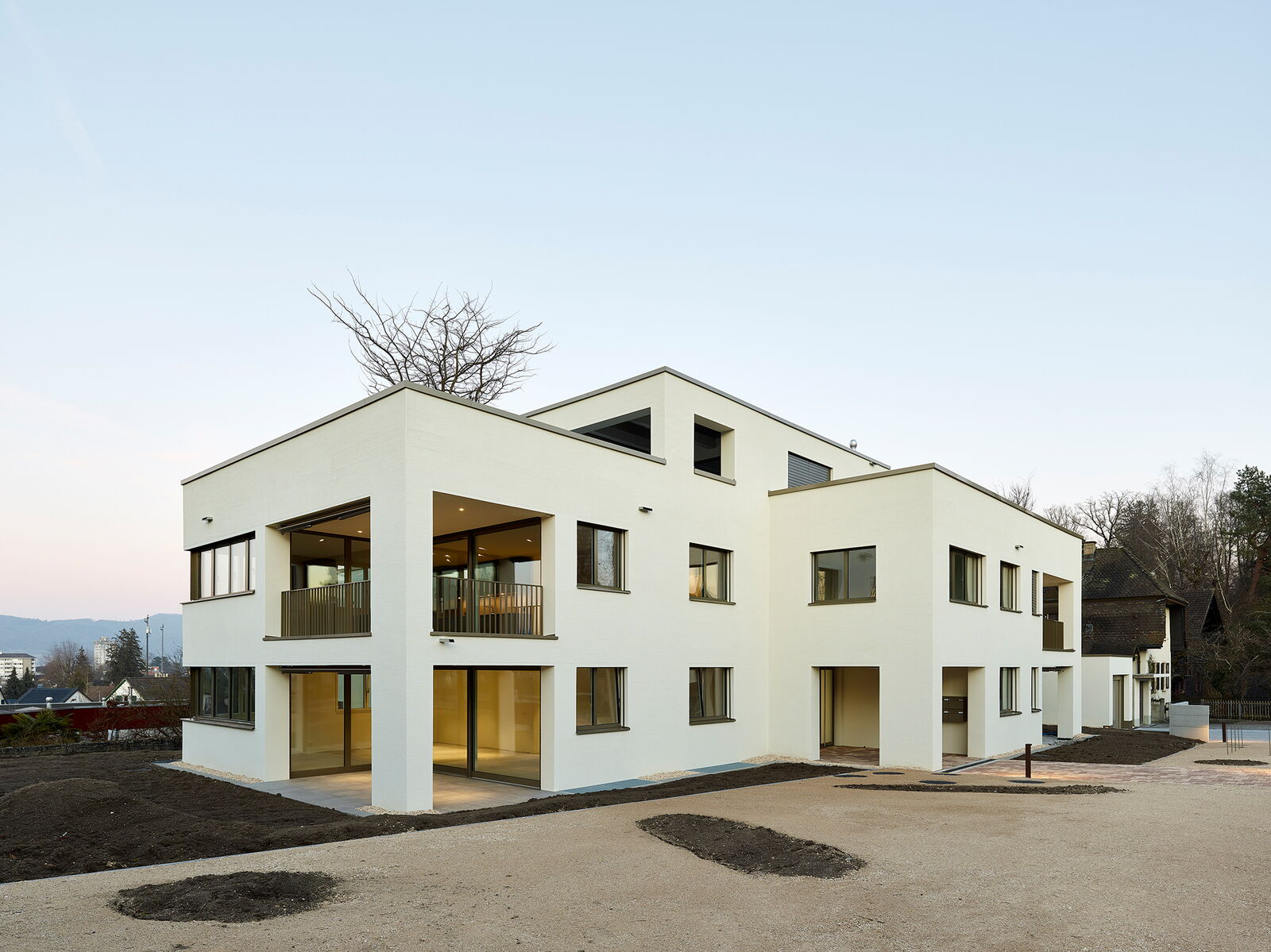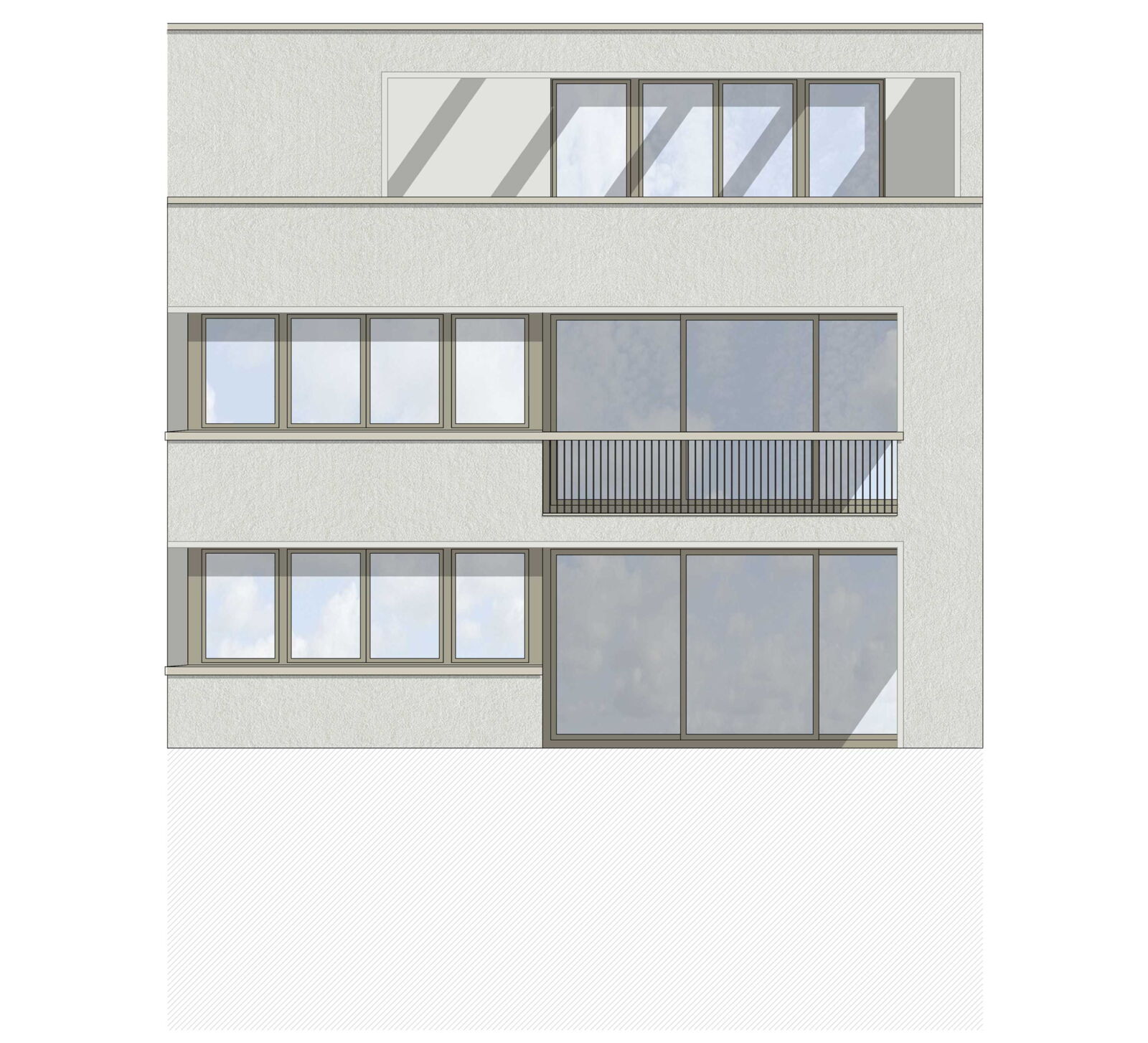 Das Volumen ist mit grosszügigen, harmonisch angeordneten Fensteröffnungen und Loggien ausformuliert. Die Fenster weisen ähnliche Formate auf, die sich durchgehend wiederholen. Dadurch entstehen eine ruhige Wirkung und ein einheitliches Gesamtbild. Die Fassade wird mit einem Kellenwurf-Putz in einem gebrochenen Weisston ausgeführt, sowohl die Vollgeschosse als auch das Attikageschoss. Als gestalterisches Element sind glattverputzte Gewände und Leibungen vorgesehen.