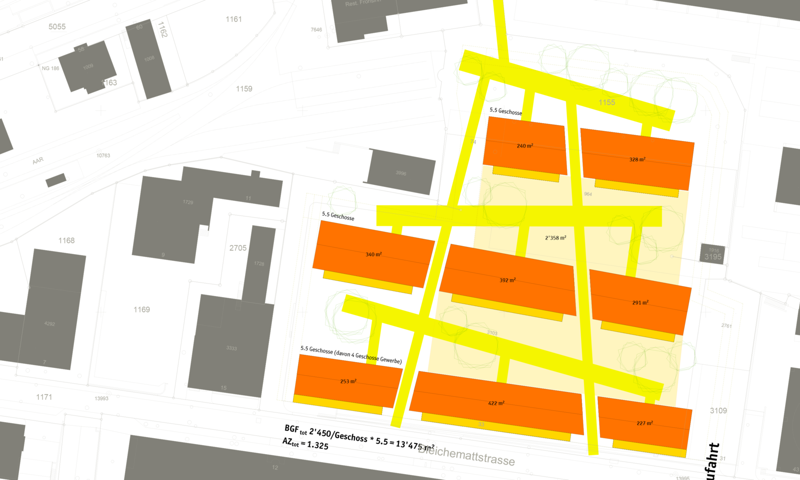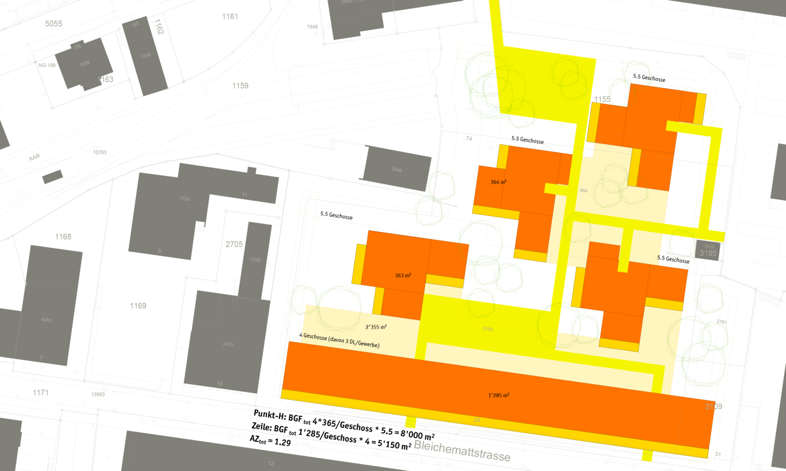 Im Rahmen des Due-Dilligence-Verfahrens für den Erwerb der Liegenschaft prüfen wir das Entwicklungspotential eines einstigen Industrieareals im Zentrum von Aarau. In Varianten zeigen wir mögliche Entwicklungen und die zugehörigen planungsrechtlichen Verfahren auf. Kennwerte und Berechnungen runden die Arbeit ab und liefern die Grundlage für die rechnerisch wirtschaftliche Betrachtung der Investition. Wir favorisieren die Variante «Turm», welche die Bleichemattstrasse ortsbaulichen fasst und den Abschluss der gewerbeartigen Bebauung vornimmt. Zum Bahnhof hin löst sich die Bebauung in 4- bis 7-geschossige, turmartige Punktbauten auf, die mehrheitlich dem Wohnen dienen.