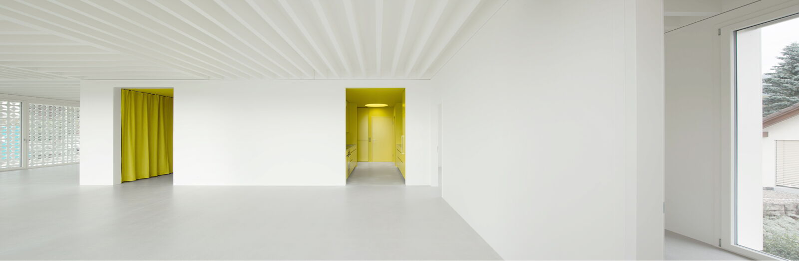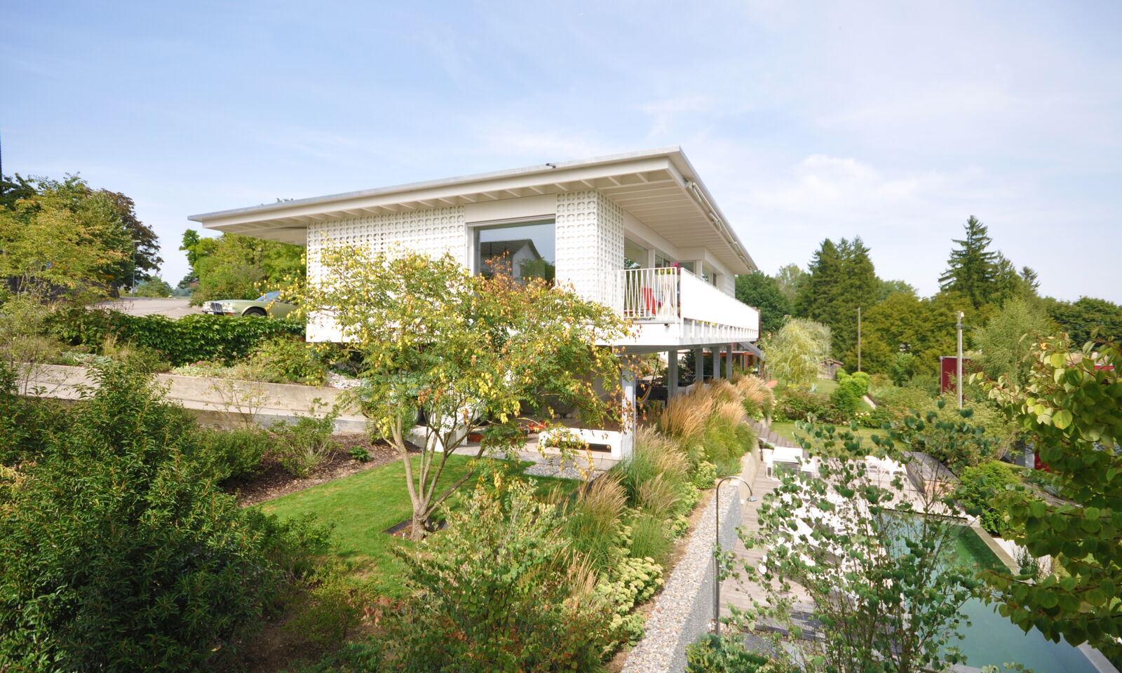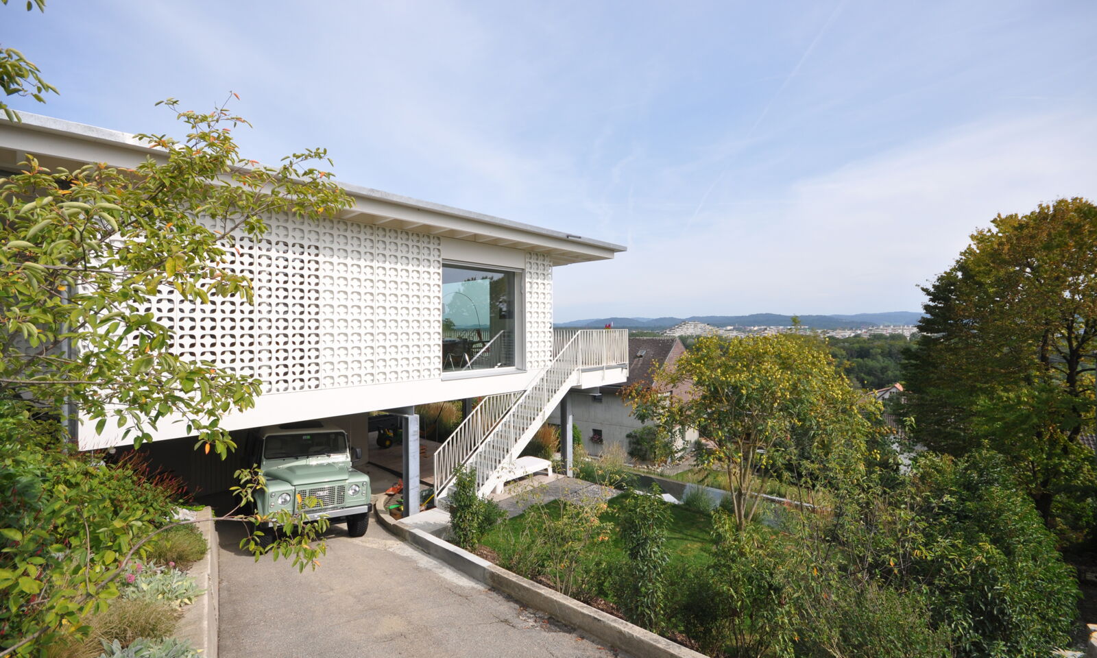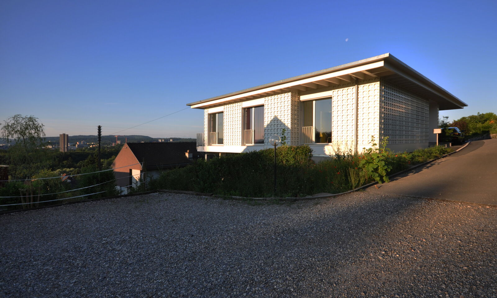 Elegant scheint der weiße eingeschossige Baukörper über dem Hang zu schweben. Das Einfamilienhaus in Rombach stützt sich nur auf dem kaum wahrnehmbaren Sockel, Überbleibsel eines Hauses aus den 1950er-Jahren, und einer Reihe schlanker Stahlpfeiler ab. Gelochte, gegeneinander versetzte Fassadenelemente umfassen den weißen Quader mit einem feinen Ornament. Sie interpretieren zusammen mit dem weit ausladenden schlanken Dach und der hangseitigen Terrasse, die den weiten Blick ins Tal freigibt, die Architektursprache der 1950er- und 1960er-Jahre neu. Im Innern sind die in unterschiedliche Richtungen gespannten Balkenlagen des Daches sichtbar. Tragwerk, Spann-weiten und Tragrichtung prägen die ganz in Weiß gehaltenen Räume. Der kompakte Gebäudekern in Senfgelb und Bordeaux kontrastiert das Raumkontinuum des Hauptwohnteils.