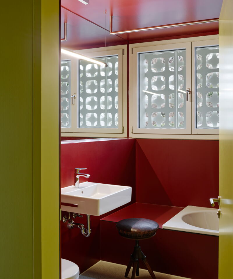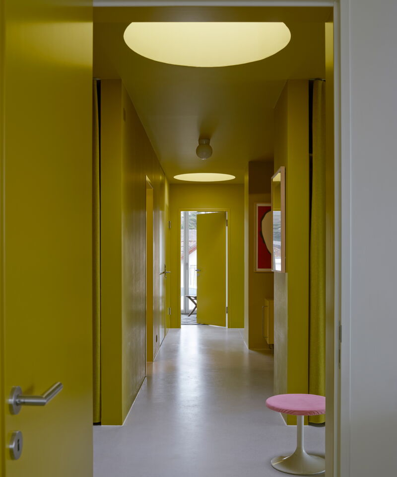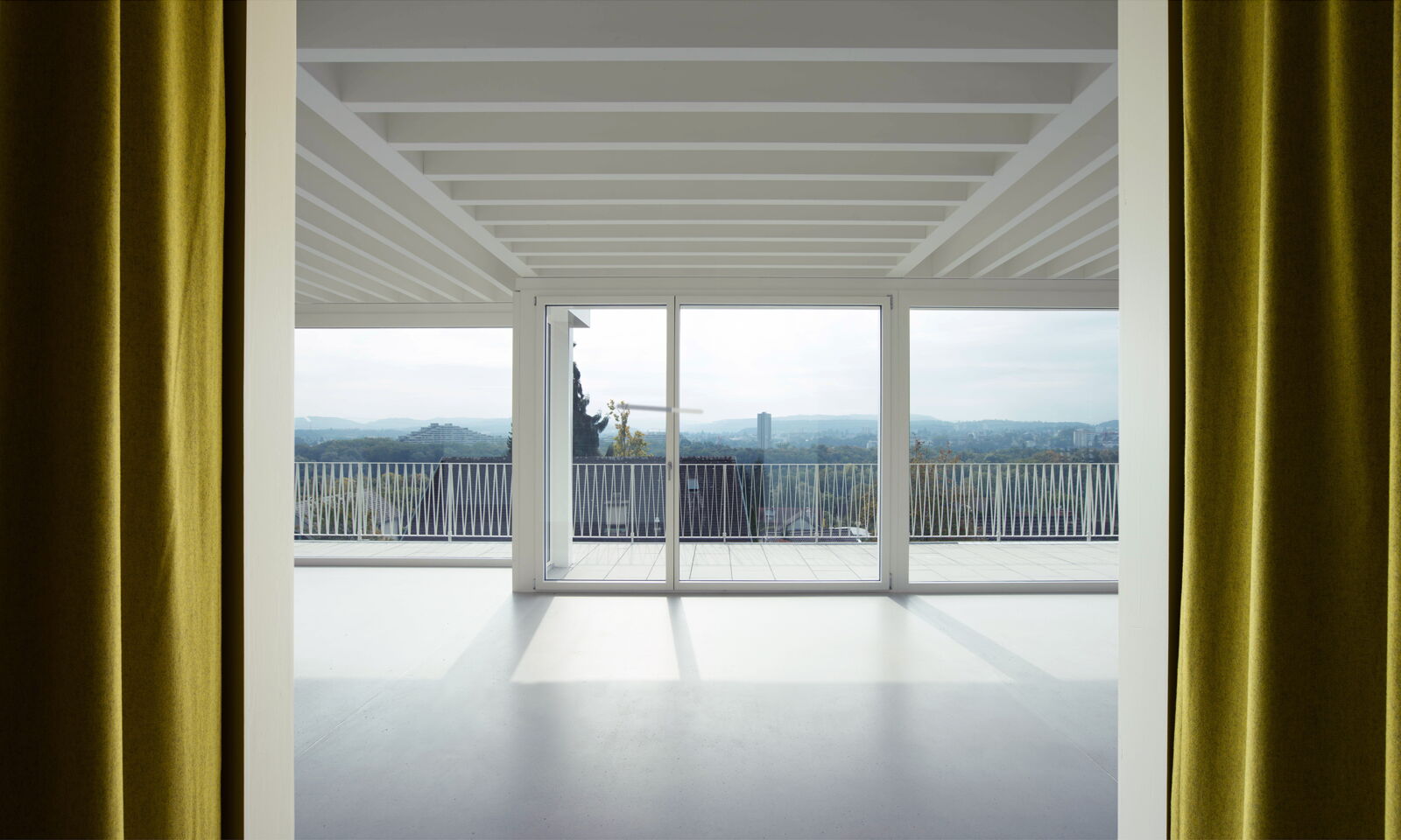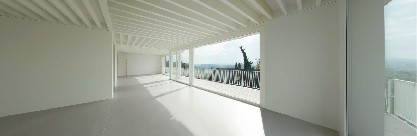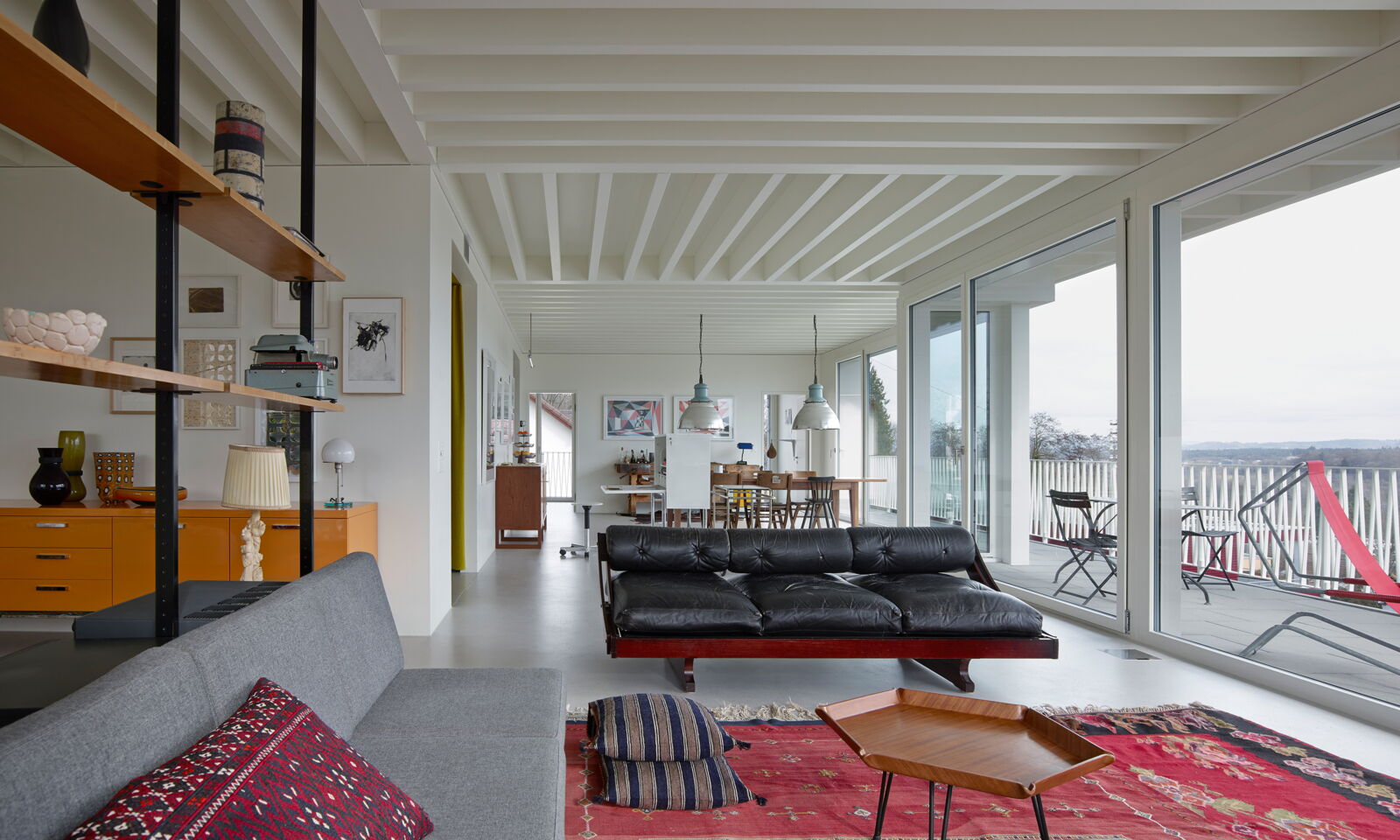 Elegant scheint der weiße eingeschossige Baukörper über dem Hang zu schweben. Das Einfamilienhaus in Rombach stützt sich nur auf dem kaum wahrnehmbaren Sockel, Überbleibsel eines Hauses aus den 1950er-Jahren, und einer Reihe schlanker Stahlpfeiler ab. Gelochte, gegeneinander versetzte Fassadenelemente umfassen den weißen Quader mit einem feinen Ornament. Sie interpretieren zusammen mit dem weit ausladenden schlanken Dach und der hangseitigen Terrasse, die den weiten Blick ins Tal freigibt, die Architektursprache der 1950er- und 1960er-Jahre neu. Im Innern sind die in unterschiedliche Richtungen gespannten Balkenlagen des Daches sichtbar. Tragwerk, Spann-weiten und Tragrichtung prägen die ganz in Weiß gehaltenen Räume. Der kompakte Gebäudekern in Senfgelb und Bordeaux kontrastiert das Raumkontinuum des Hauptwohnteils.