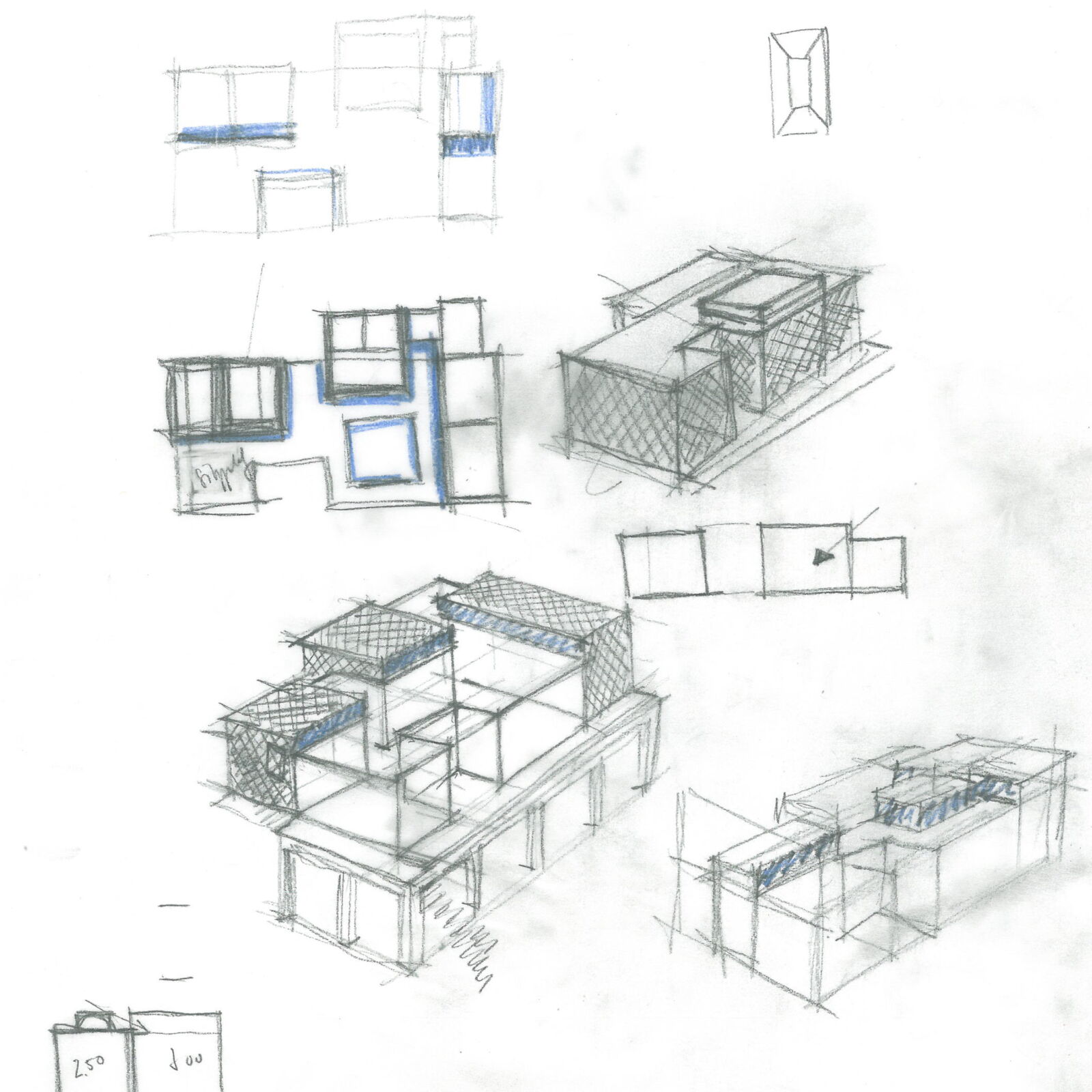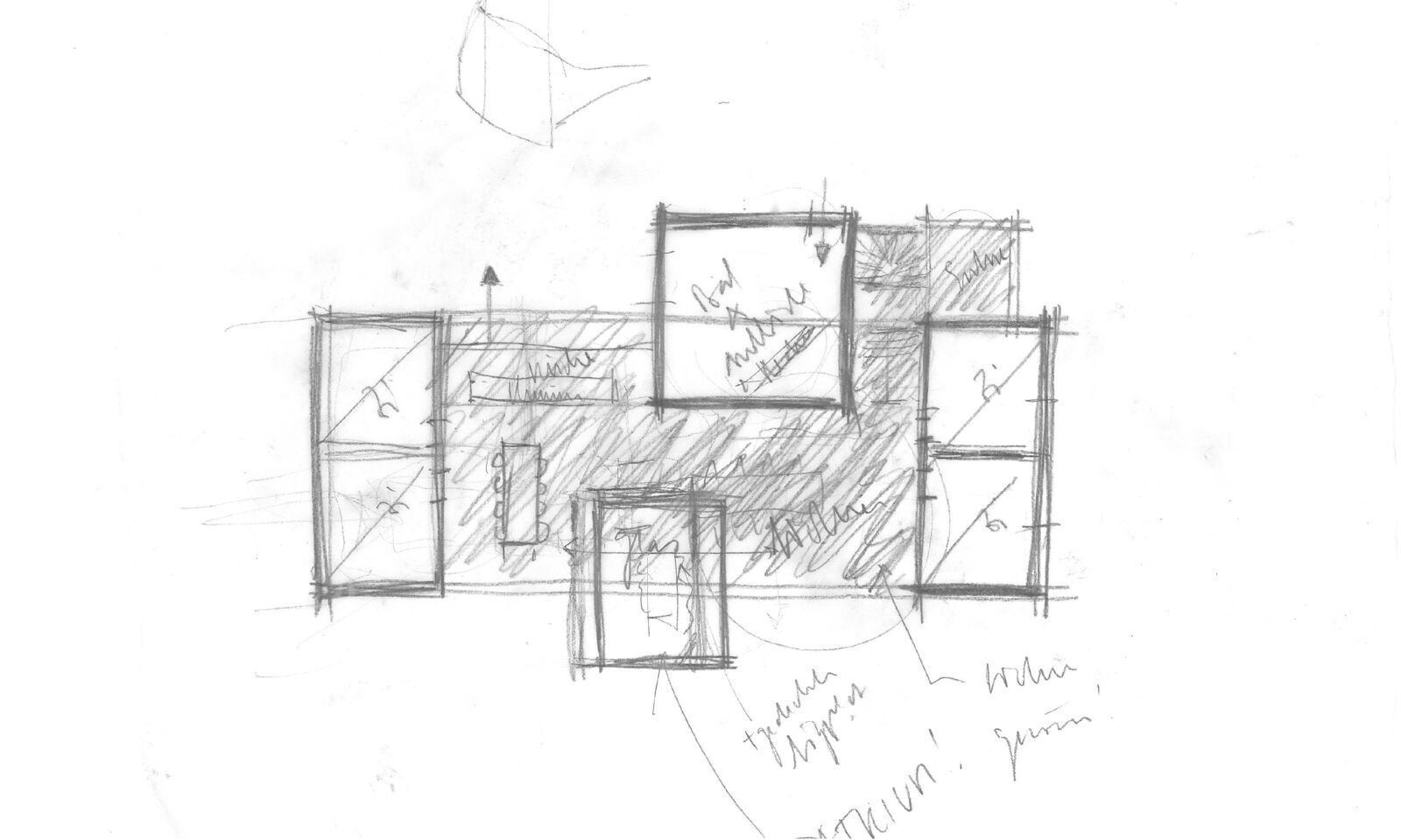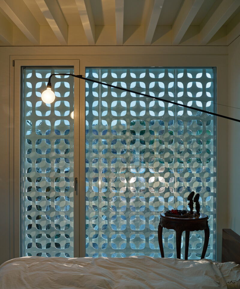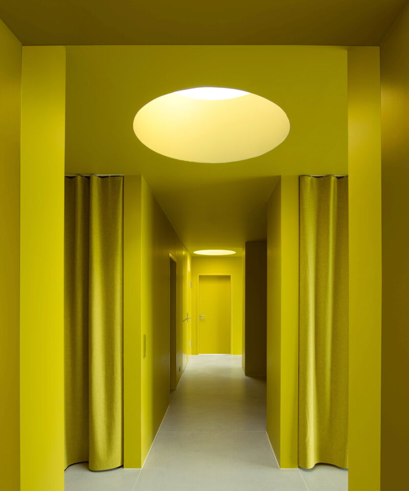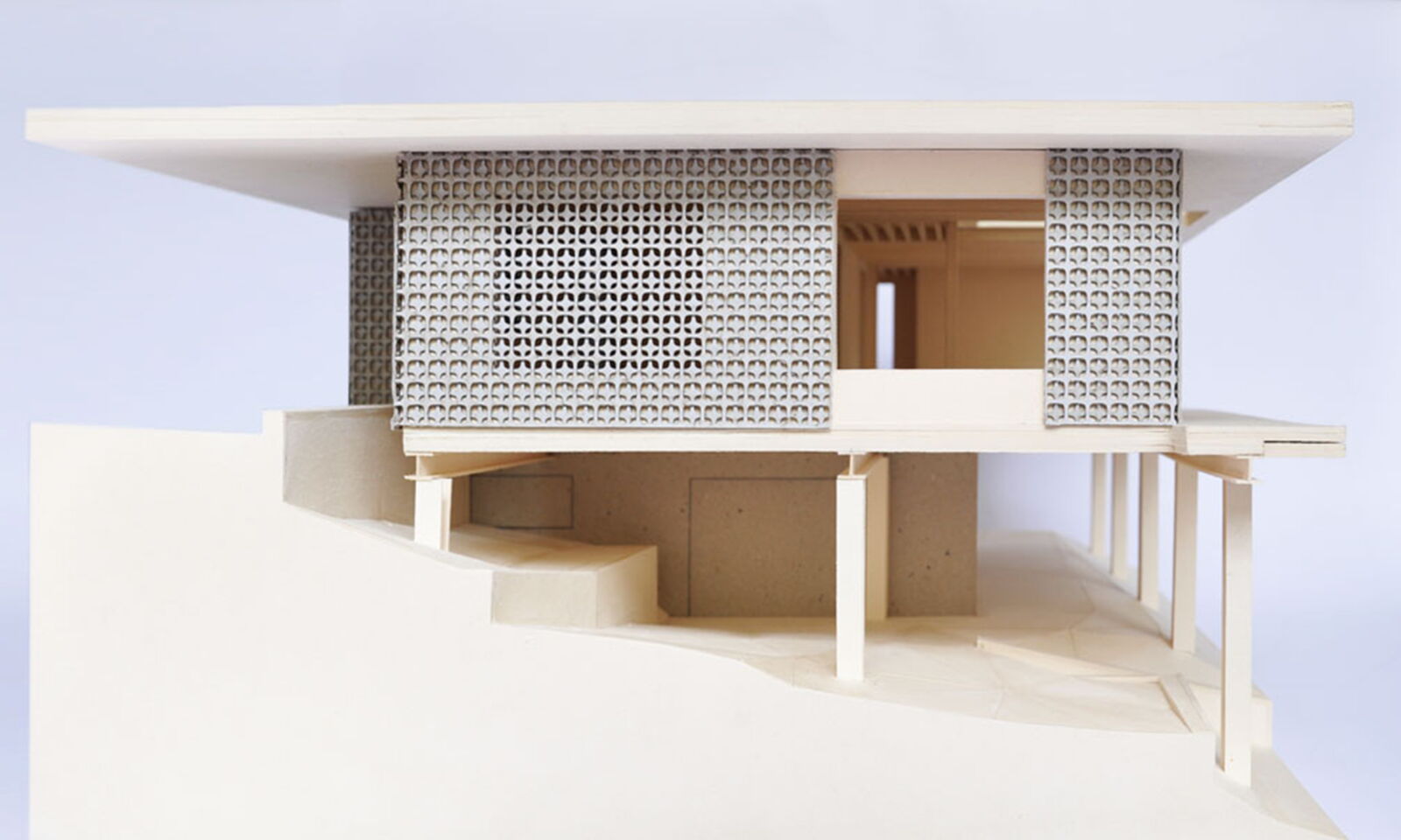Elegant scheint der weiße eingeschossige Baukörper über dem Hang zu schweben. Das Einfamilienhaus in Rombach stützt sich nur auf dem kaum wahrnehmbaren Sockel, Überbleibsel eines Hauses aus den 1950er-Jahren, und einer Reihe schlanker Stahlpfeiler ab. Gelochte, gegeneinander versetzte Fassadenelemente umfassen den weißen Quader mit einem feinen Ornament. Sie interpretieren zusammen mit dem weit ausladenden schlanken Dach und der hangseitigen Terrasse, die den weiten Blick ins Tal freigibt, die Architektursprache der 1950er- und 1960er-Jahre neu. Im Innern sind die in unterschiedliche Richtungen gespannten Balkenlagen des Daches sichtbar. Tragwerk, Spann-weiten und Tragrichtung prägen die ganz in Weiß gehaltenen Räume. Der kompakte Gebäudekern in Senfgelb und Bordeaux kontrastiert das Raumkontinuum des Hauptwohnteils.