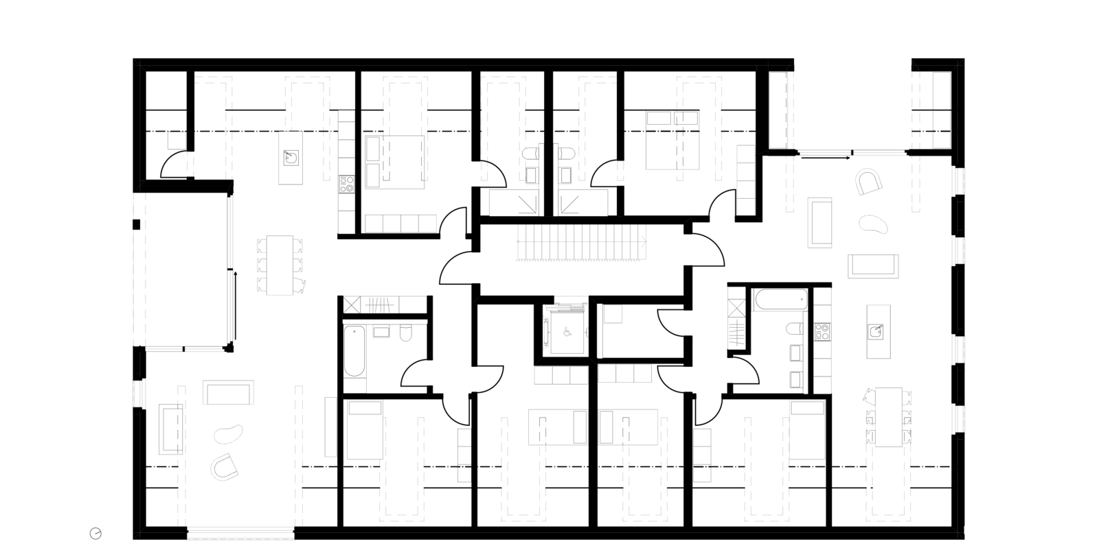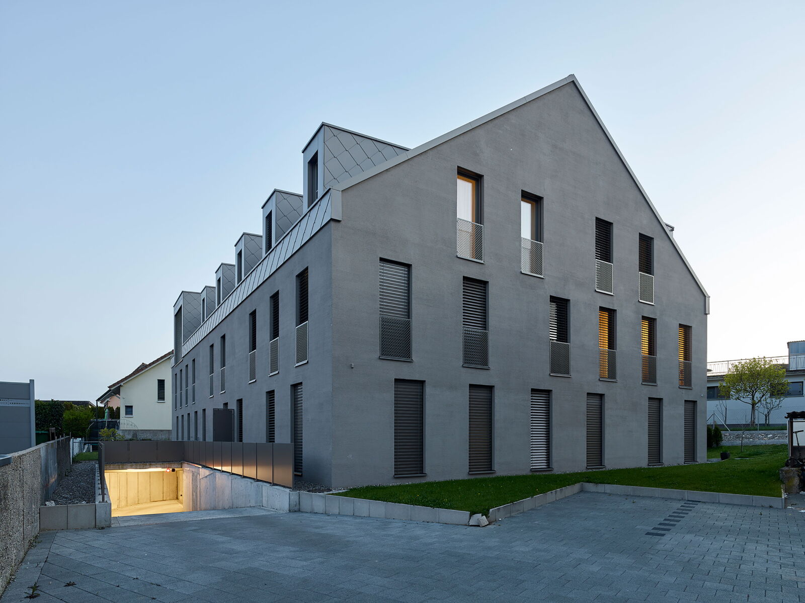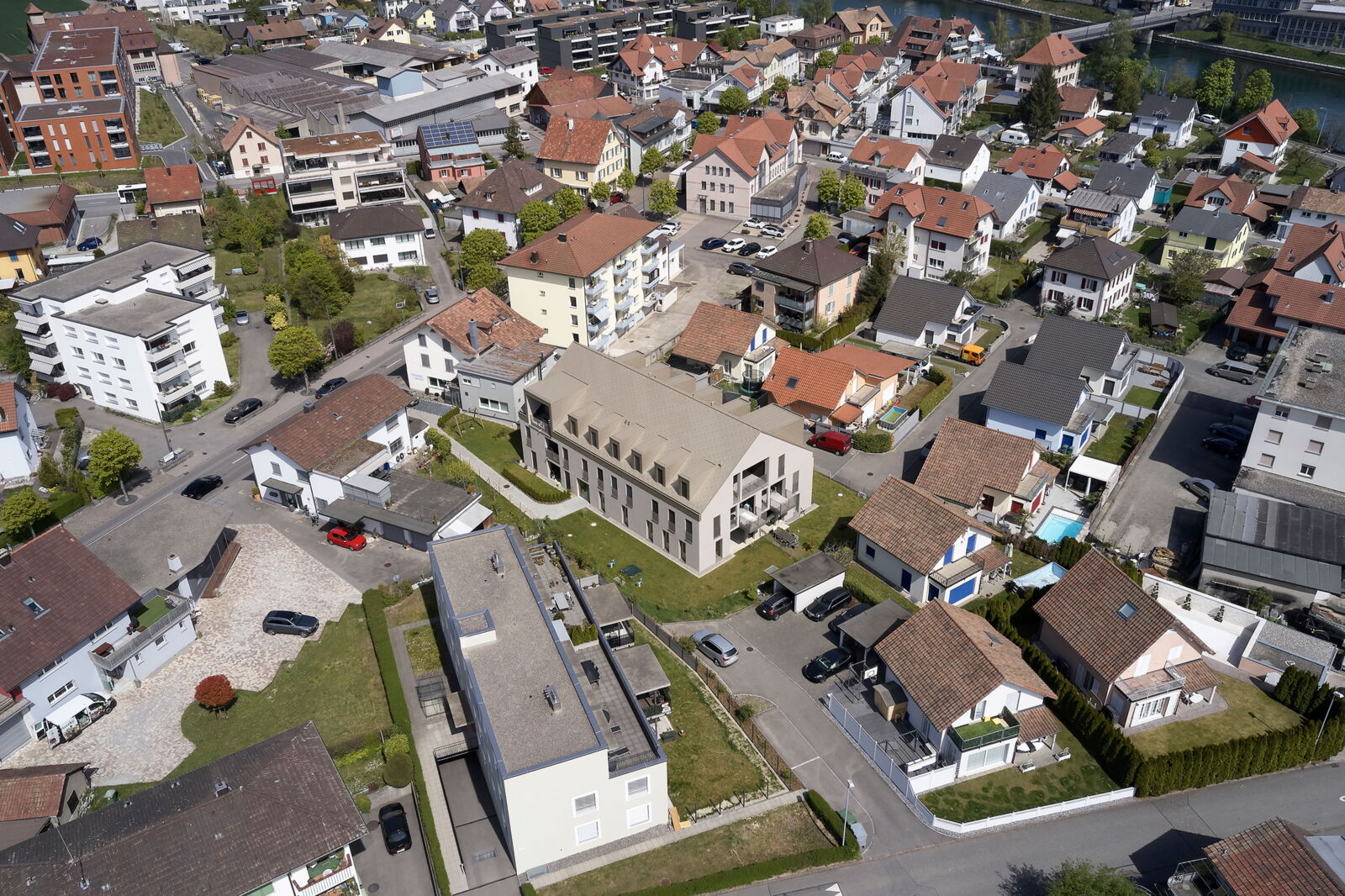Das Mehrfamilienhaus ist dreispännig organisiert und bietet insgesamt 8 Eigentumswohnungen. Die 3.5 Zi – 4.5 Zi Wohnungen erhalten mindestens eine zweiseitige Besonnung. Die eingezogenen Loggien gewährleisten trotz der höheren Dichte in der Kernzone einen privaten Aussenraum.