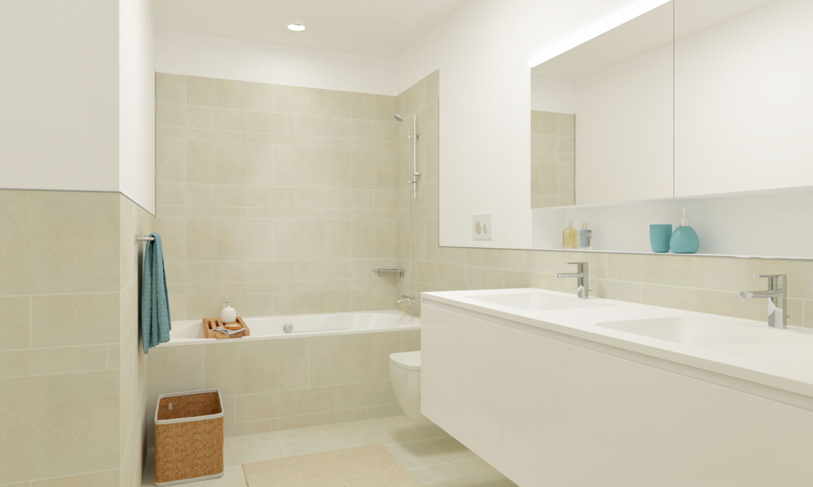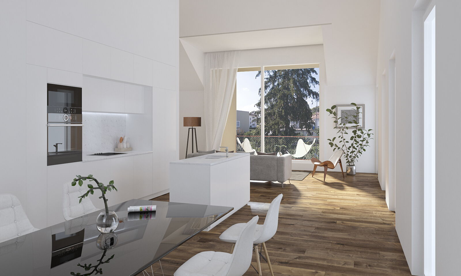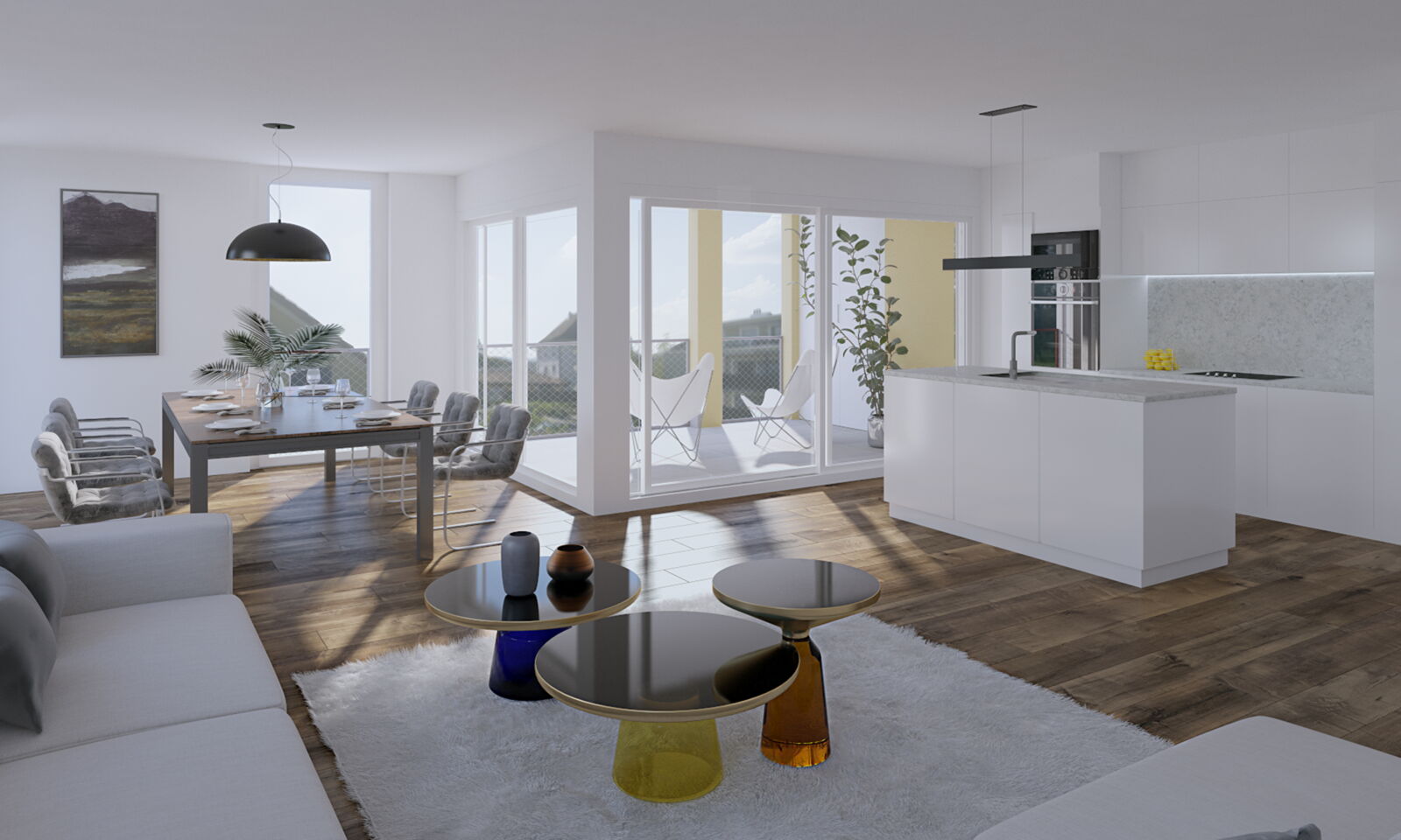 Das Mehrfamilienhaus ist dreispännig organisiert und bietet insgesamt 8 Eigentumswohnungen. Die 3.5 Zi – 4.5 Zi Wohnungen erhalten mindestens eine zweiseitige Besonnung. Die eingezogenen Loggien gewährleisten trotz der höheren Dichte in der Kernzone einen privaten Aussenraum.