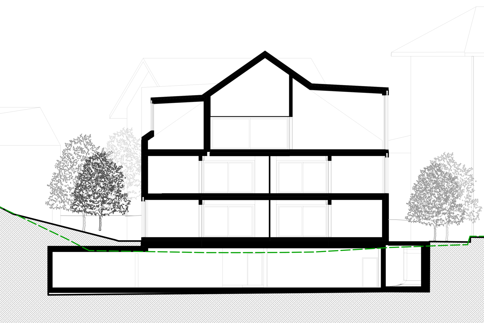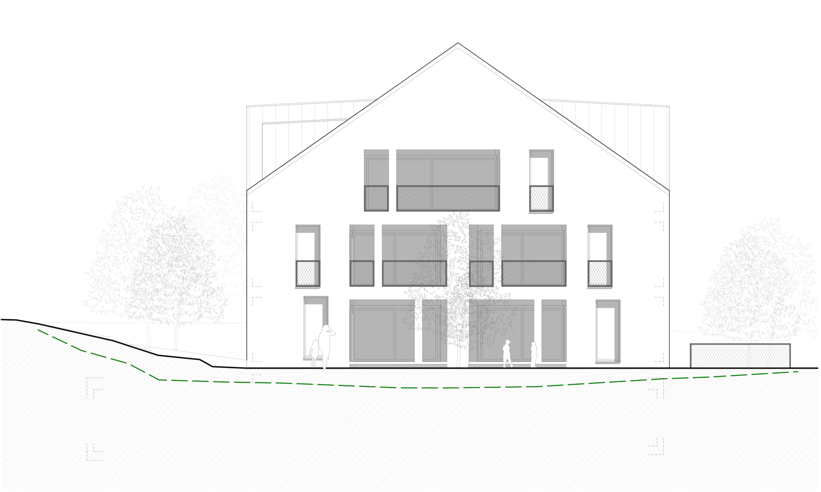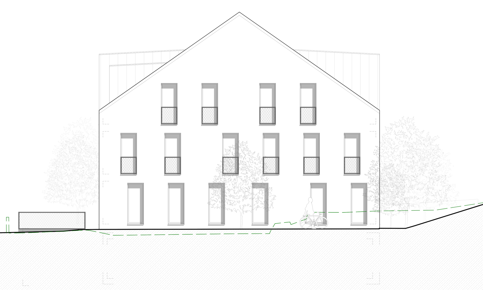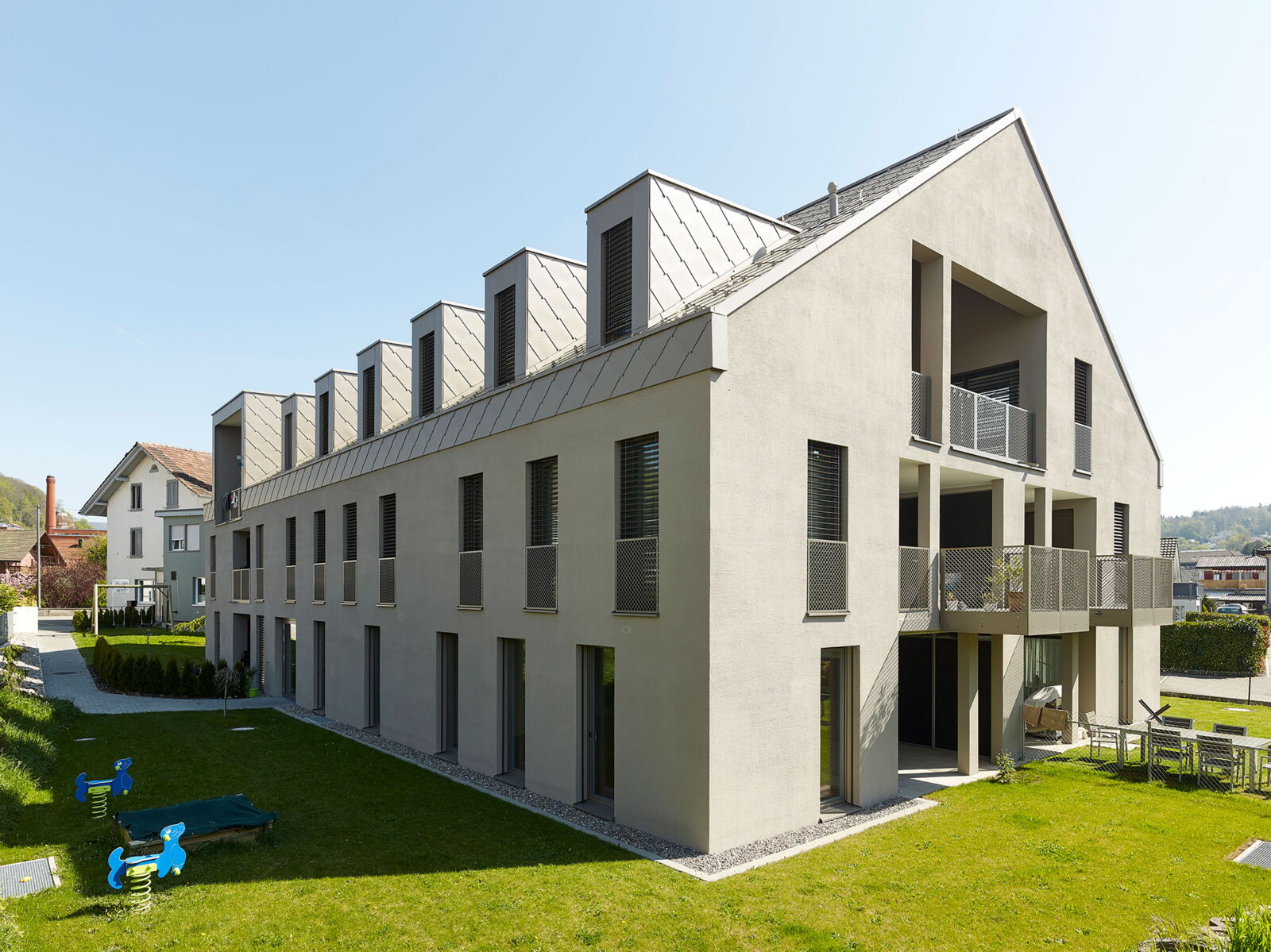 Die am östlichen Tor liegende Kernzone formt sich mit vielen kleinen Läden entlang der Hauptstrasse. Die Parzelle ist in Kern- und W3-Zone geteilt. Das bestehende Haus bleibt Bestandteil der Strassenzeile und im ruhigen Raum dahinter entsteht ein zweigeschossiges Volumen mit Satteldach. Anstelle der typischen Kreuzquergiebeln prägen grosse, flache Dachgauben das Dach. Sie werden zueinander versetzt angeordnet.