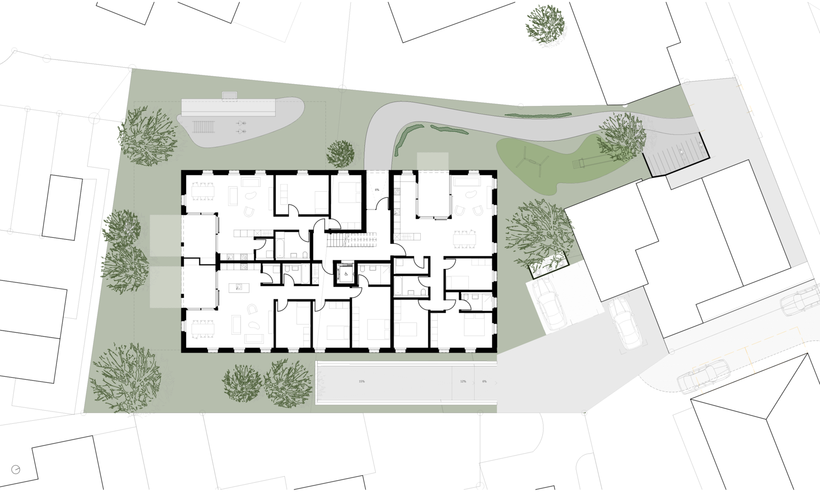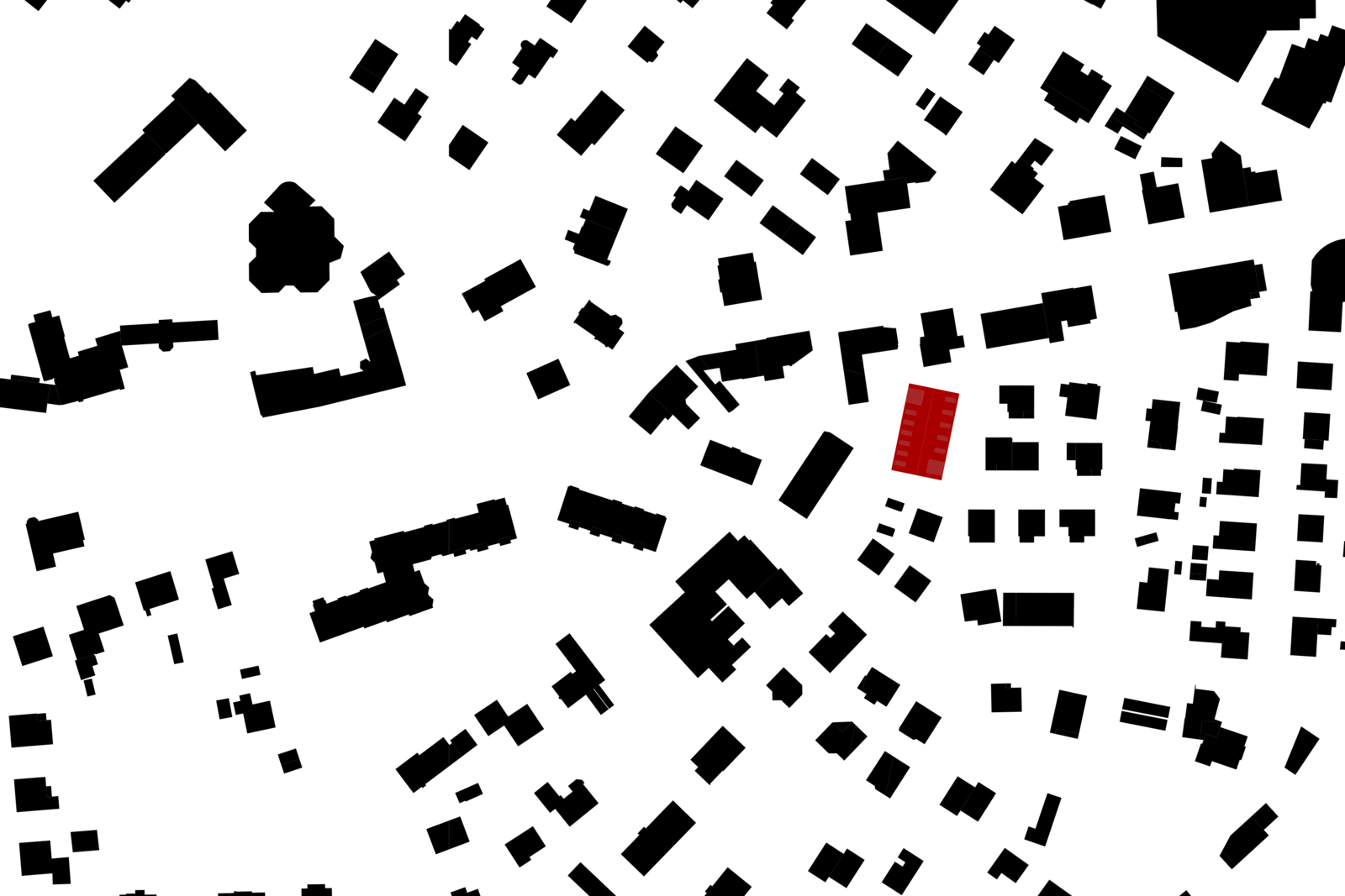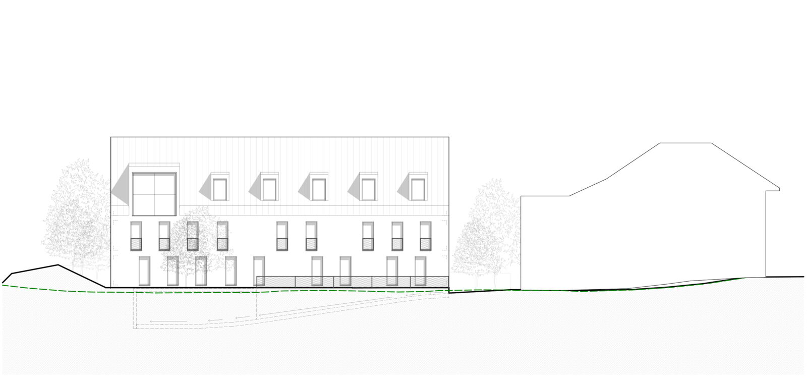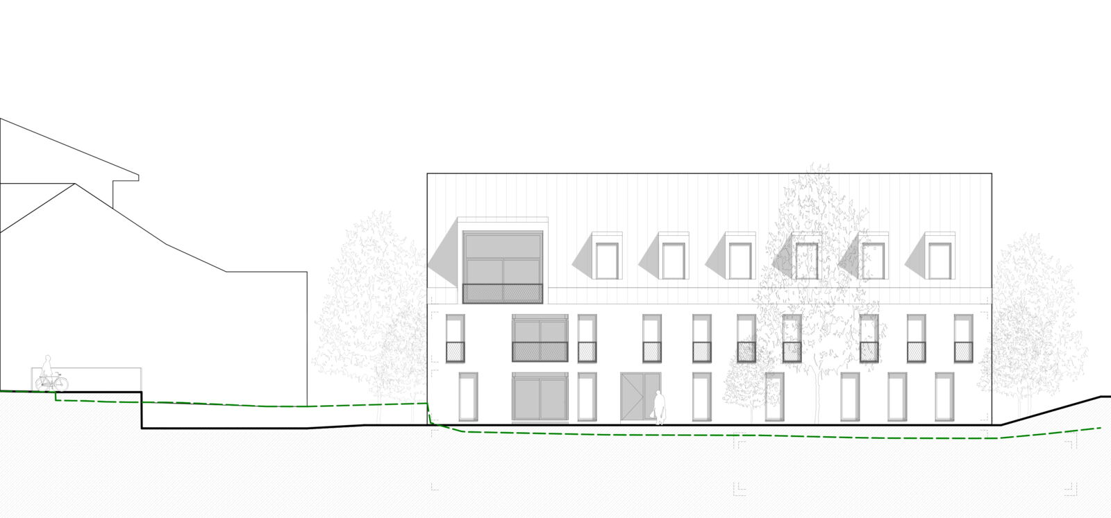 Die am östlichen Tor liegende Kernzone formt sich mit vielen kleinen Läden entlang der Hauptstrasse. Die Parzelle ist in Kern- und W3-Zone geteilt. Das bestehende Haus bleibt Bestandteil der Strassenzeile und im ruhigen Raum dahinter entsteht ein zweigeschossiges Volumen mit Satteldach. Anstelle der typischen Kreuzquergiebeln prägen grosse, flache Dachgauben das Dach. Sie werden zueinander versetzt angeordnet.