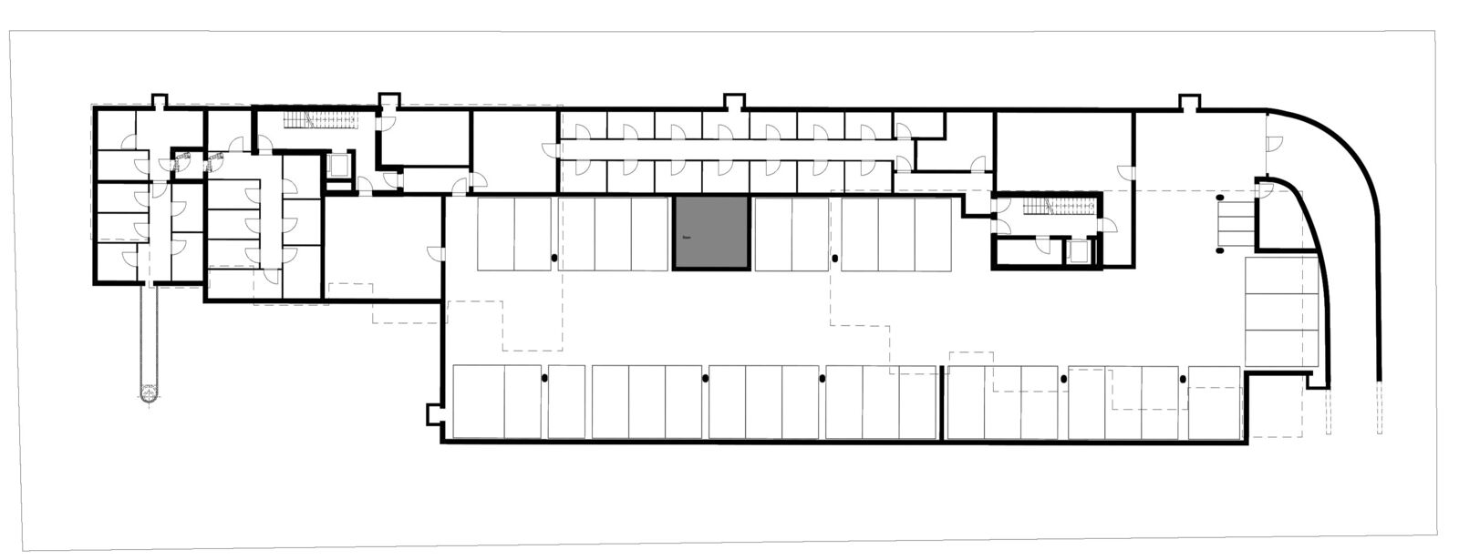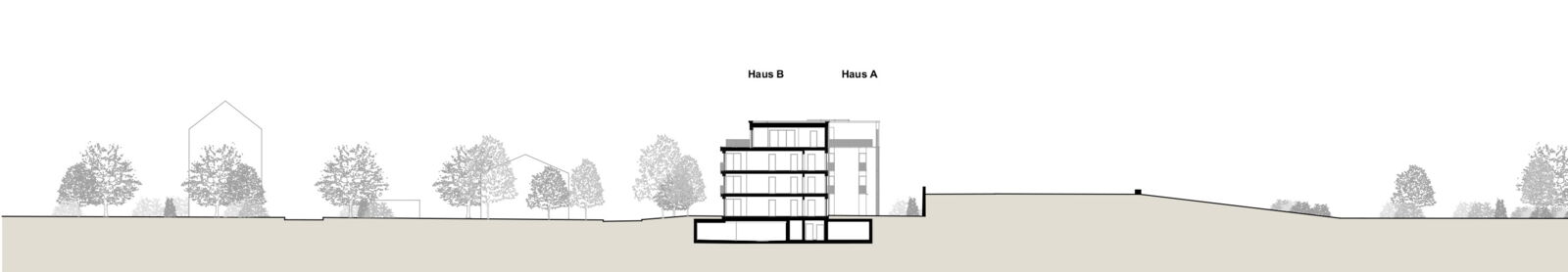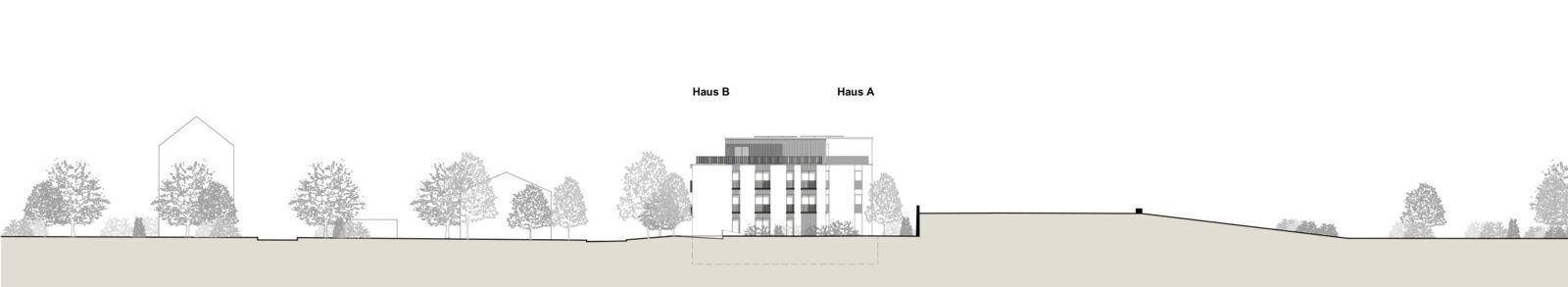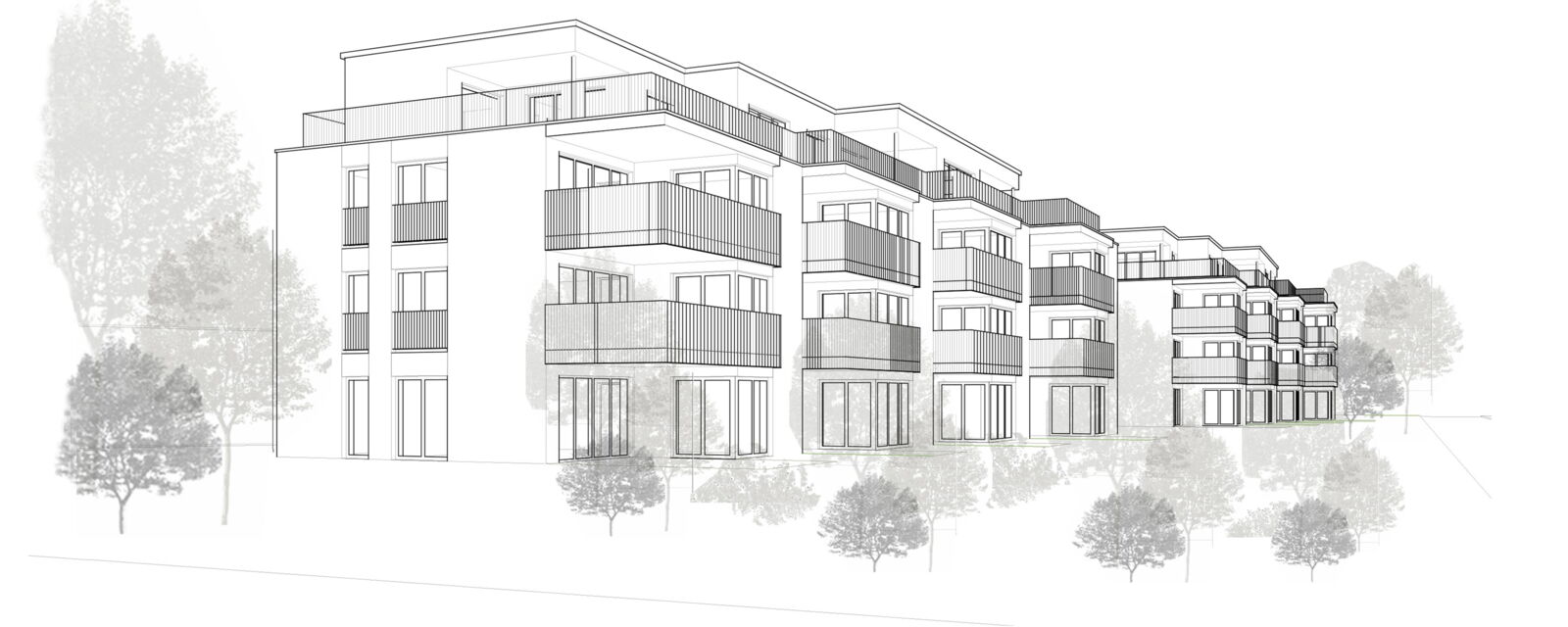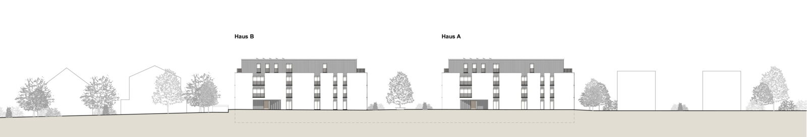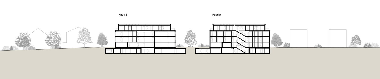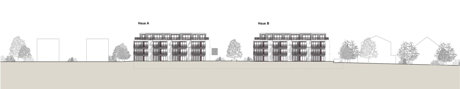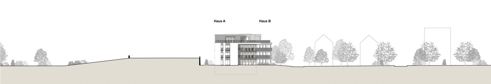 Anstelle der beiden bestehenden Mehrfamilienhäuser werden wieder zwei neue Gebäude, zueinander versetzt, vorgeschlagen, so dass die gestaffelte Südseite der beiden Häuser auf einer diagonalen Linie liegt. Damit ergibt sich eine feingliedrige Massstäblichkeit der Volumen und eine zusammenhängende Gesamtwirkung. Die Setzung der beiden Gebäude ermöglicht eine attraktive Nutzung und Gestaltung der Aussenräume. Die Gebäude reagieren mit ihrer Grundrisslösung und Gebäudetypologie folgerichtig auf die Lärmsituation der Bahn.