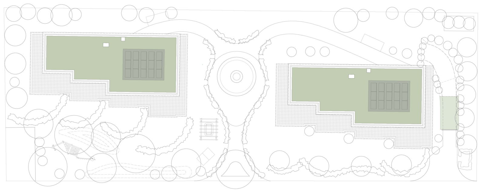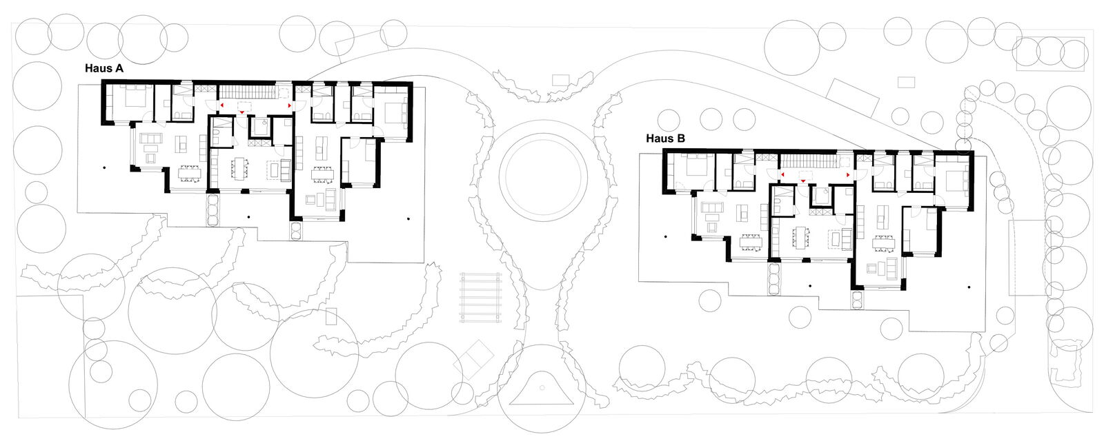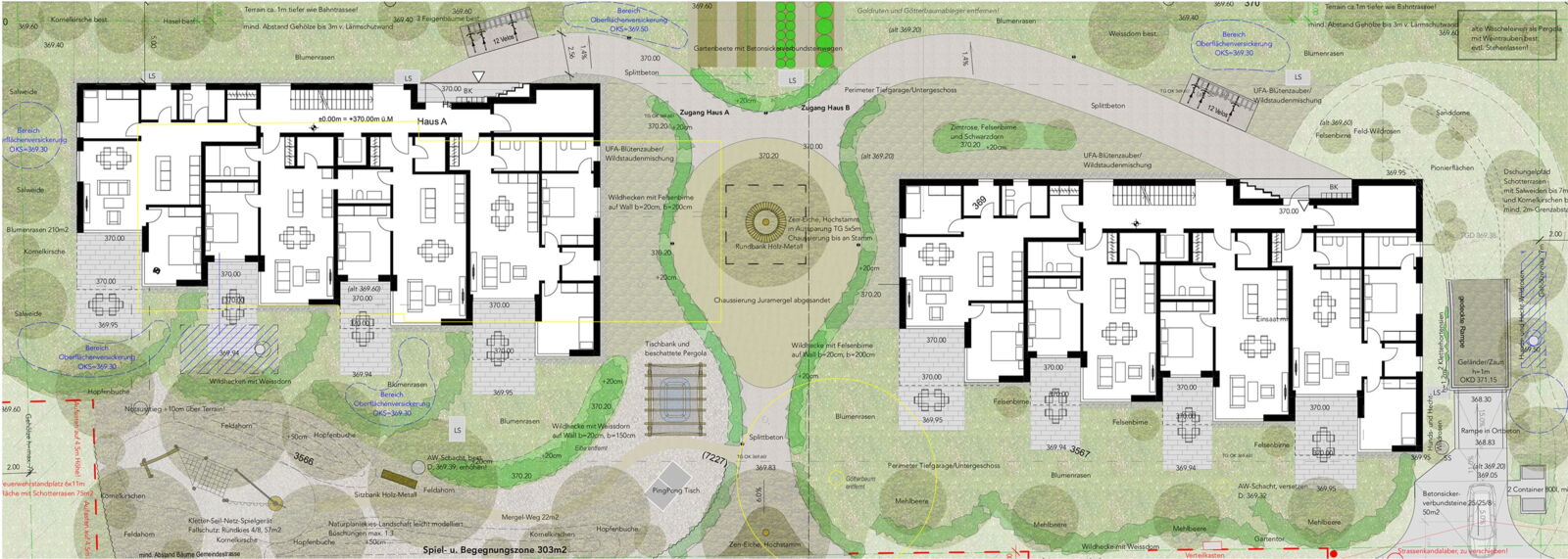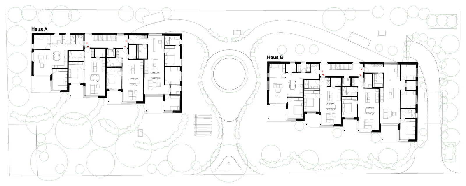 Zur Adressbildung wird die Mitte zwischen den Gebäuden mit präzis gesetzten Hochstammbäumen explizit als Ankunft mit Aufenthaltsqualität konzipiert. Der Ankunftsbereich wird über die ganze Parzellentiefe gedacht und entsprechend gestalterisch ausgebildet.