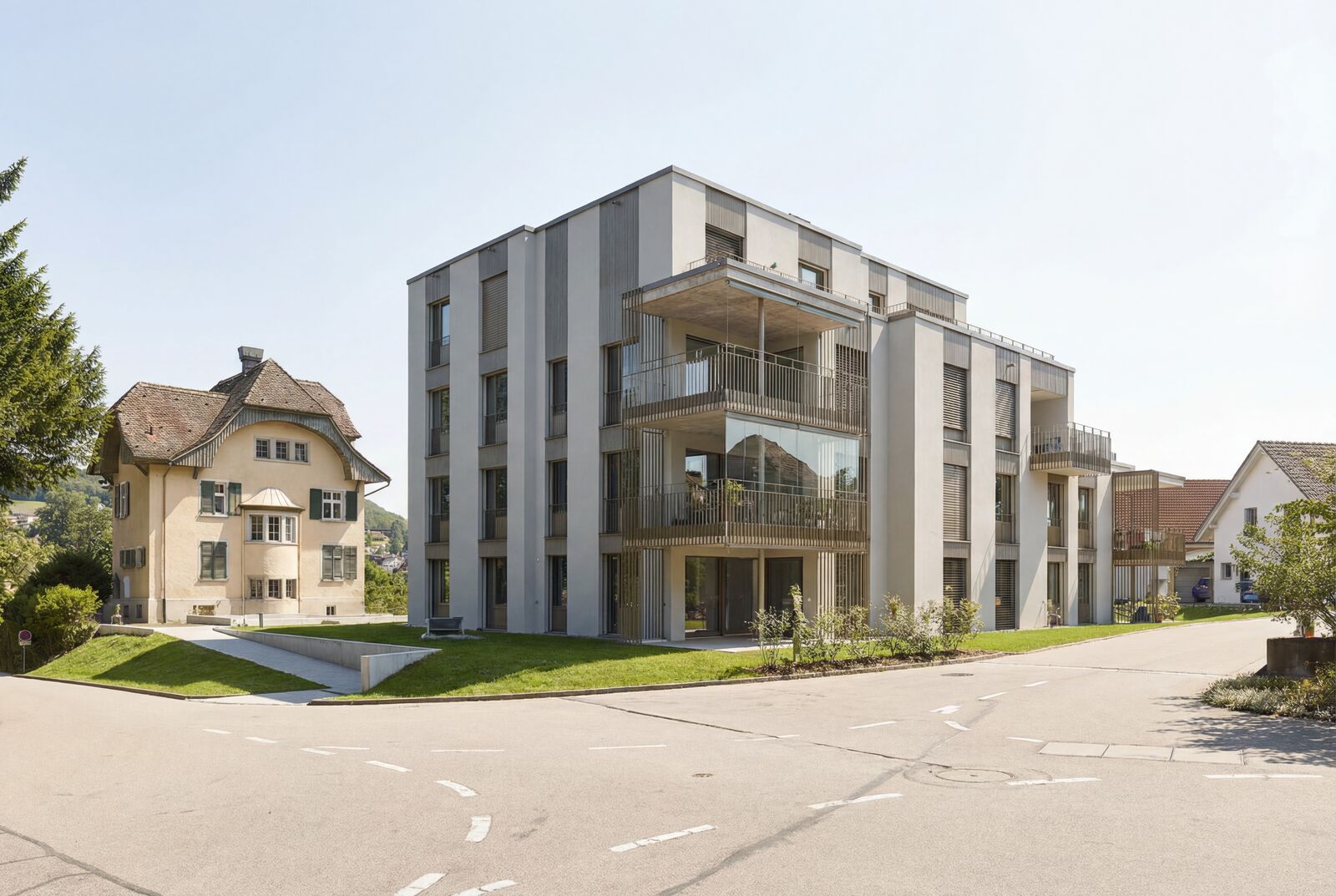 Zwei Neubauten orientieren sich mit ihrer Geometrie an der Stellung des historischen Bestandes, wobei die Villa das höchste Gebäude bleibt. Der Bereich unterhalb der Villa bleibt frei. Ein einheitlich gestalteter Aussenraum und eine gemeinsame Erschliessung mit Tiefgarage mit 28 Parkplätzen verbindet alt und neu zu einem Ensemble.