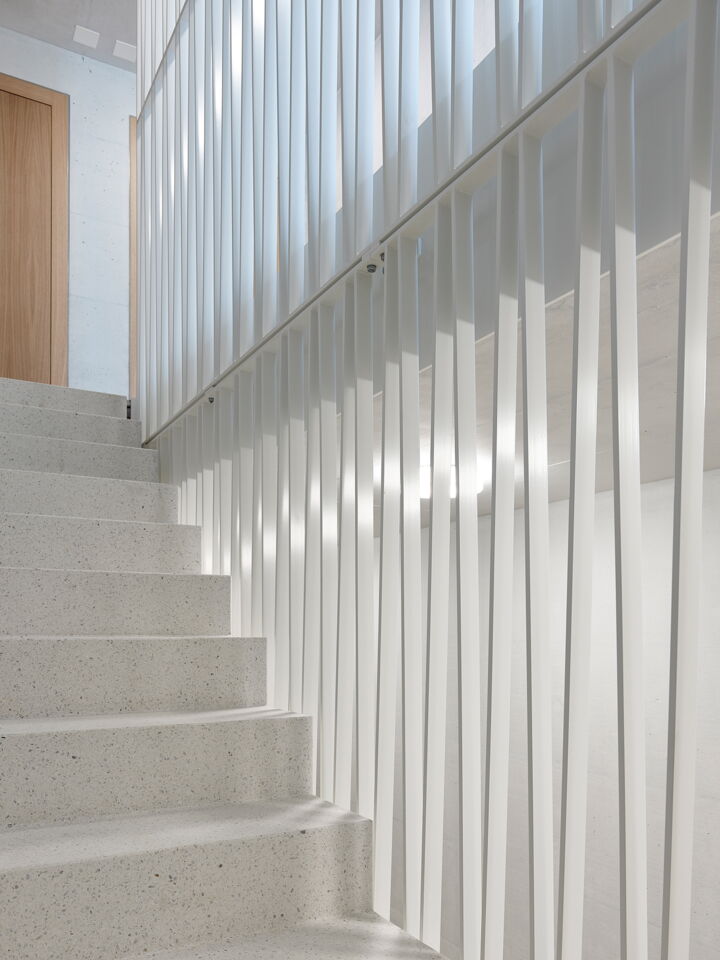 Der Baukörper präsentiert sich als verputzter Kubus mit raumhohen, grossformatigen Fenstern. Er erscheint dadurch kompakt und wird durch die Versprünge gleichzeitig gegliedert.