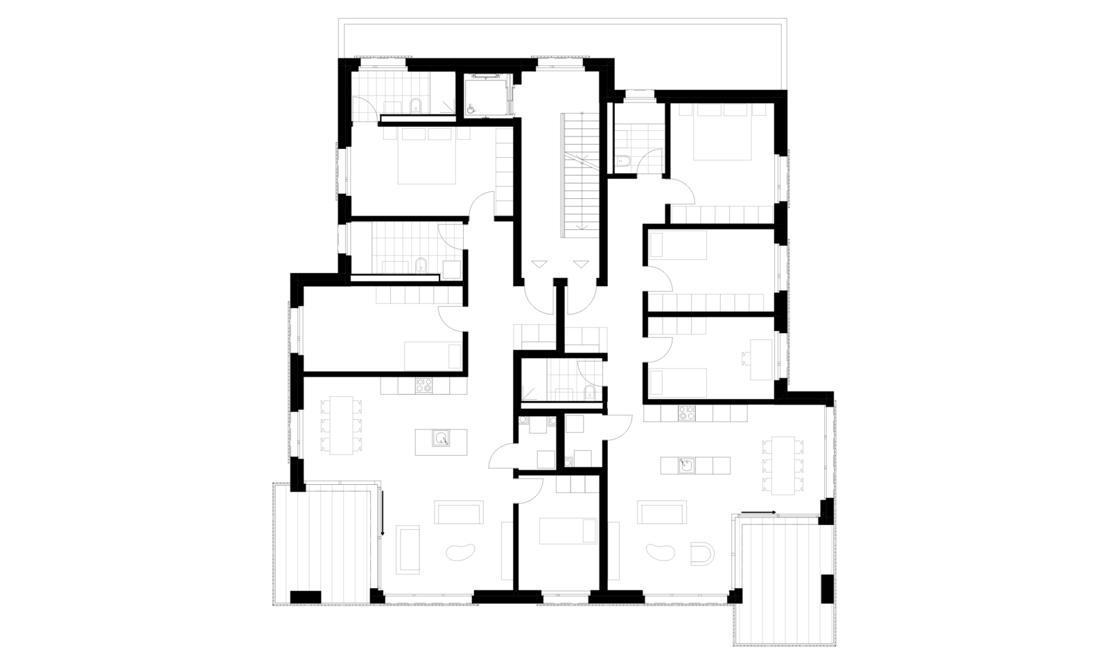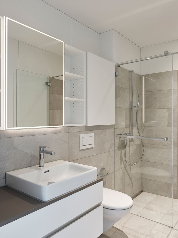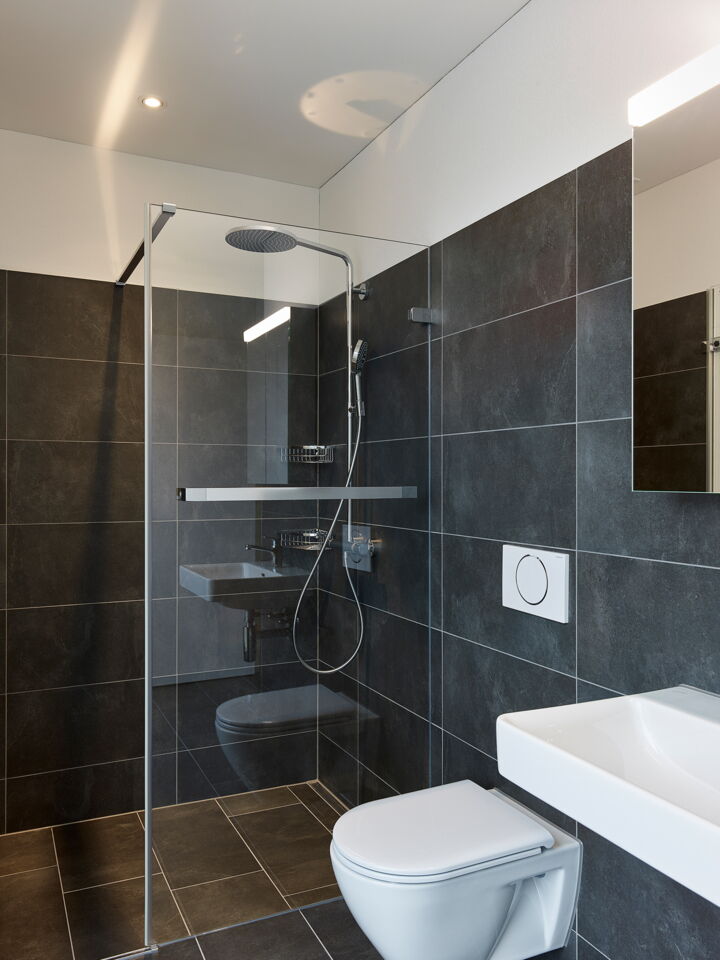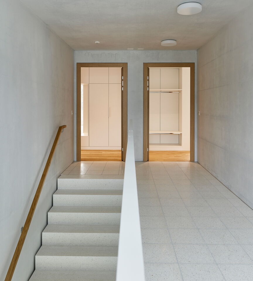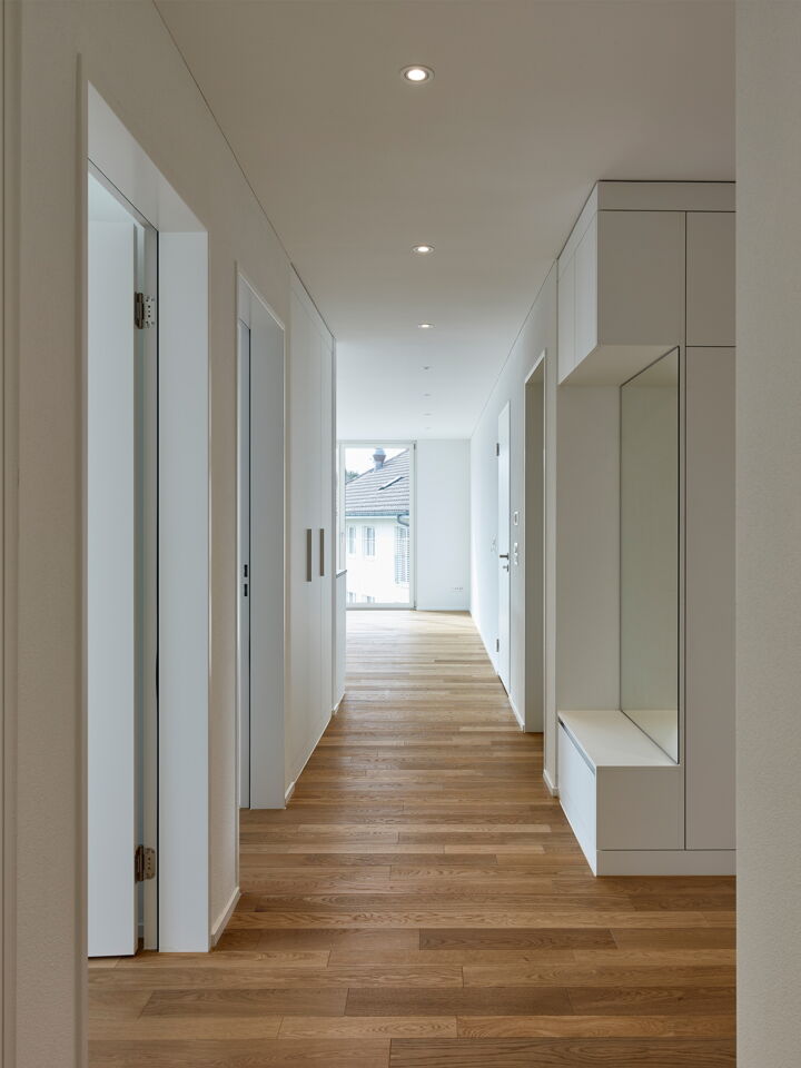 Im Inneren des Gebäudes befinden sich 6 Wohnungen, die über einen Lift schwellenlos erschlossen sind. Es werden zwei 3.5 Zimmer-Whg. und vier 4.5 Zimmer-Whg. errichtet. Die Wohnungen sind mindestens zu zwei Seiten orientiert. Alle haben Freibereiche nach Süden. Alle Zimmer haben Fenster zu den lärmabgewandten Seiten und können dadurch gut natürlich belüftet werden.
