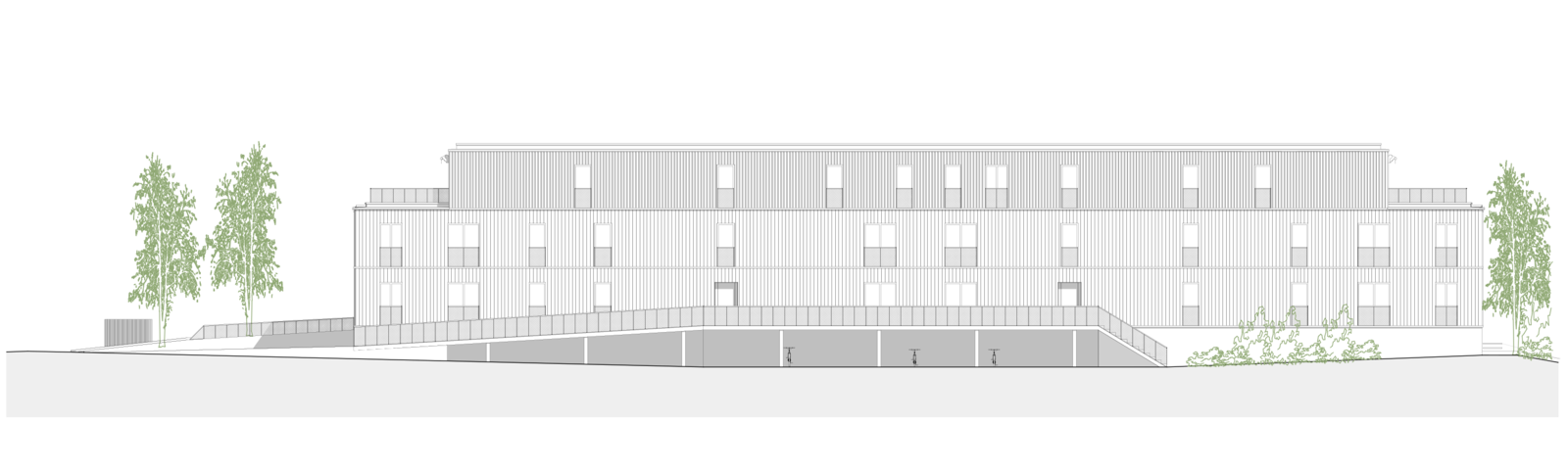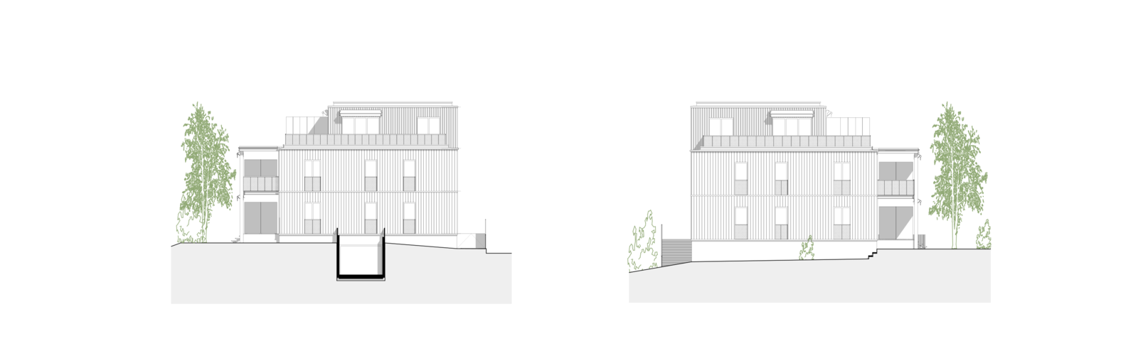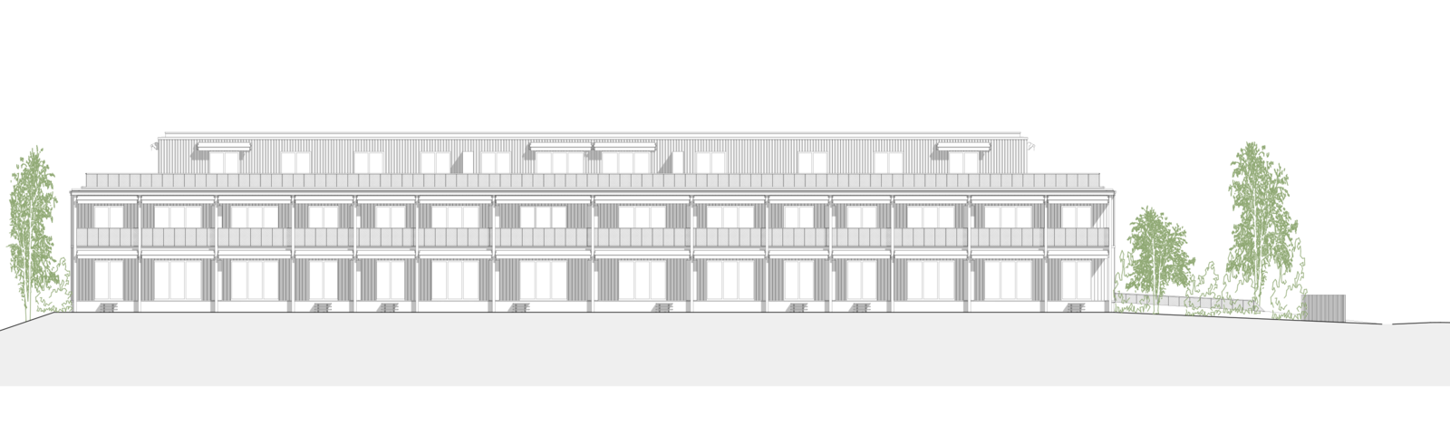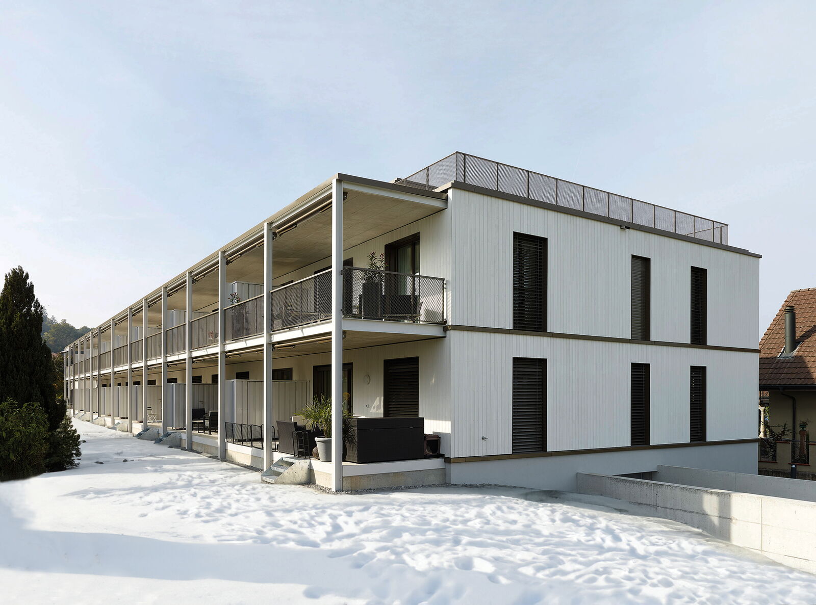 Der Gebäudekörper spricht eine klare, volumetrische Sprache. Das Volumen verfügt im obersten Geschoss über eine aufgesetzte Attika mit weitläufiger Terrasse. Diese erhält einen eigenen optischen Rhythmus, der die Höhe des Gebäudes visuell bricht. In Anlehnung an den ländlichen Bebauungskontext ist die Gestaltung eine weiss gestrichene Holzfassade. Die hinterlüftete, vorbehandelte Verschalung wird im Erdgeschoss und 1. Obergeschoss geschlossen gebildet.